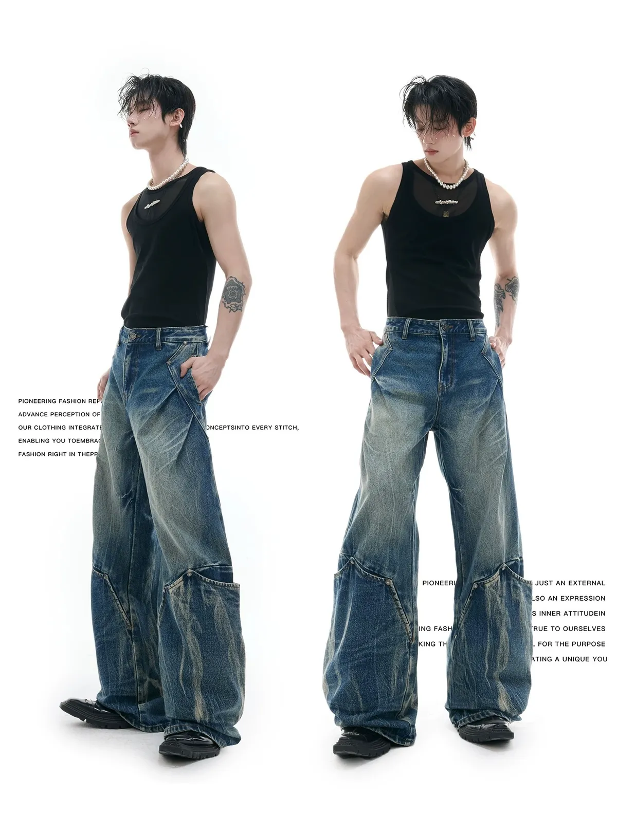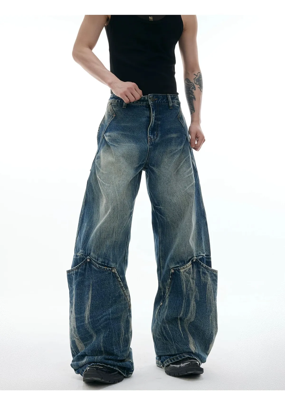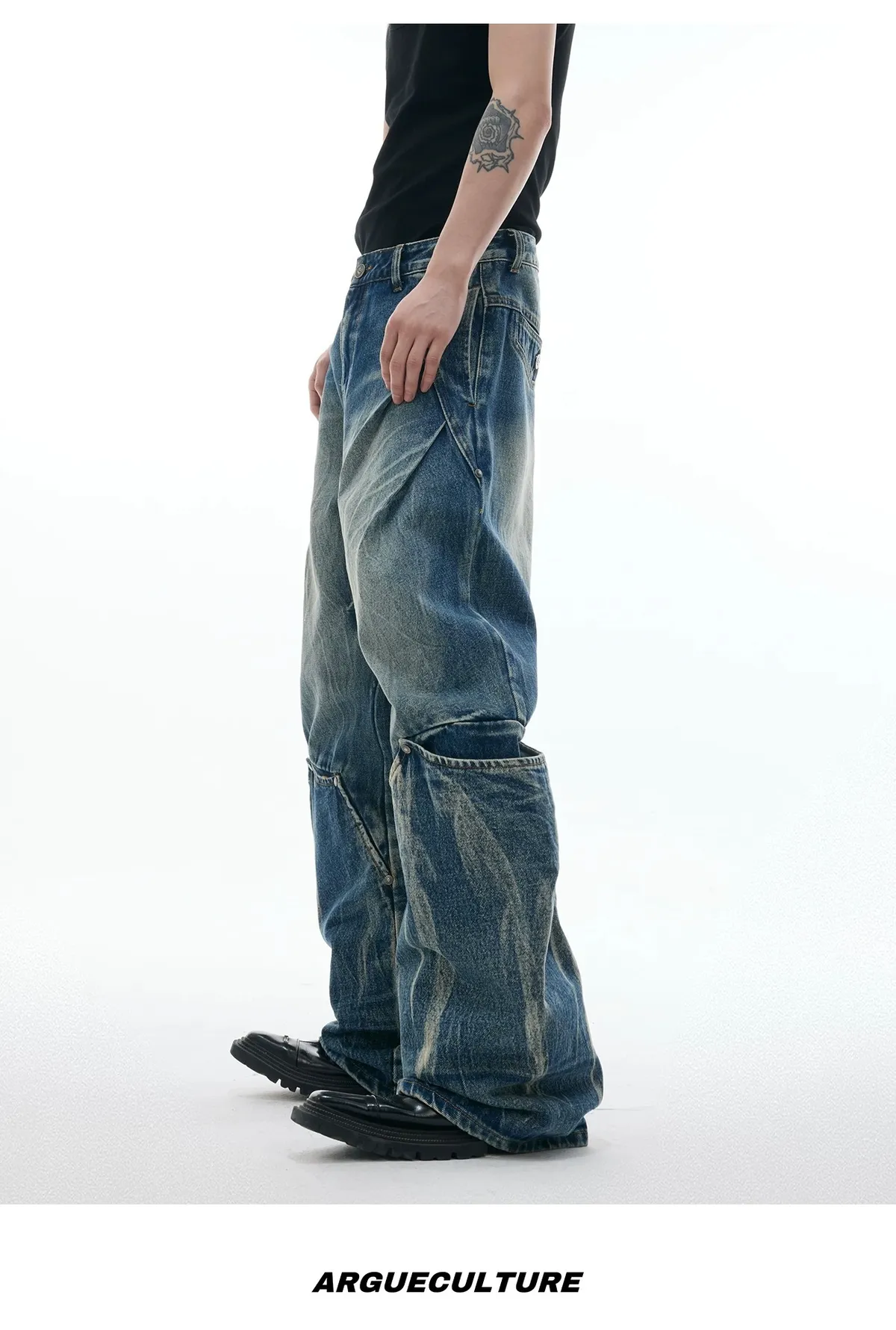 ARGUE 肌理髒染 重磅闊腿 彎刀 牛仔褲 附贈珍珠褲鏈(深藍)