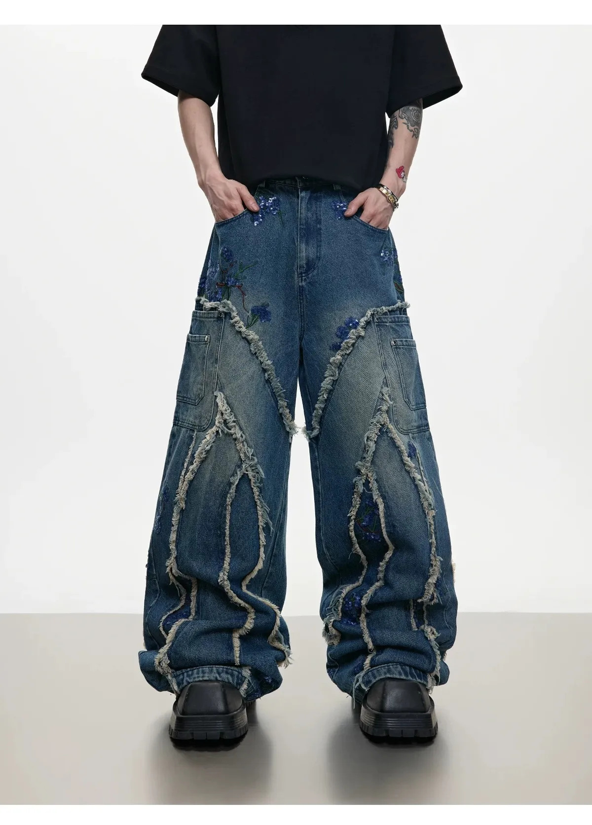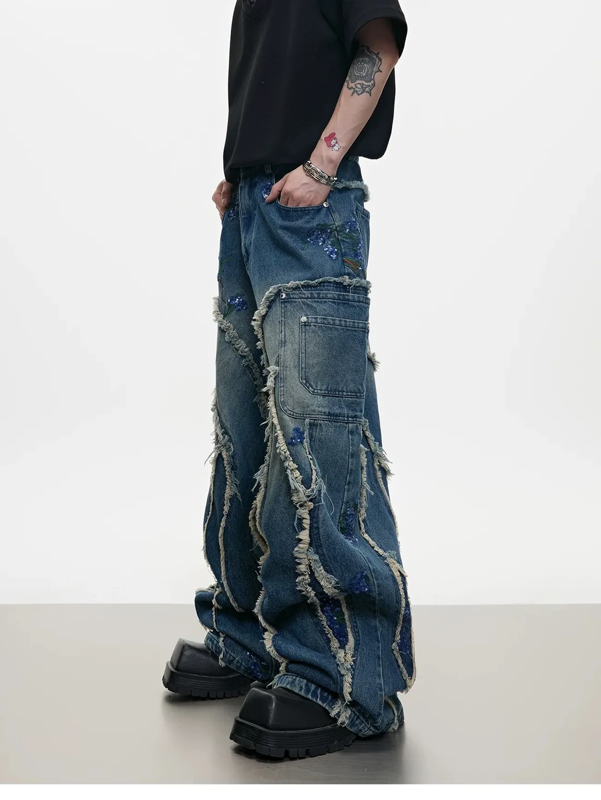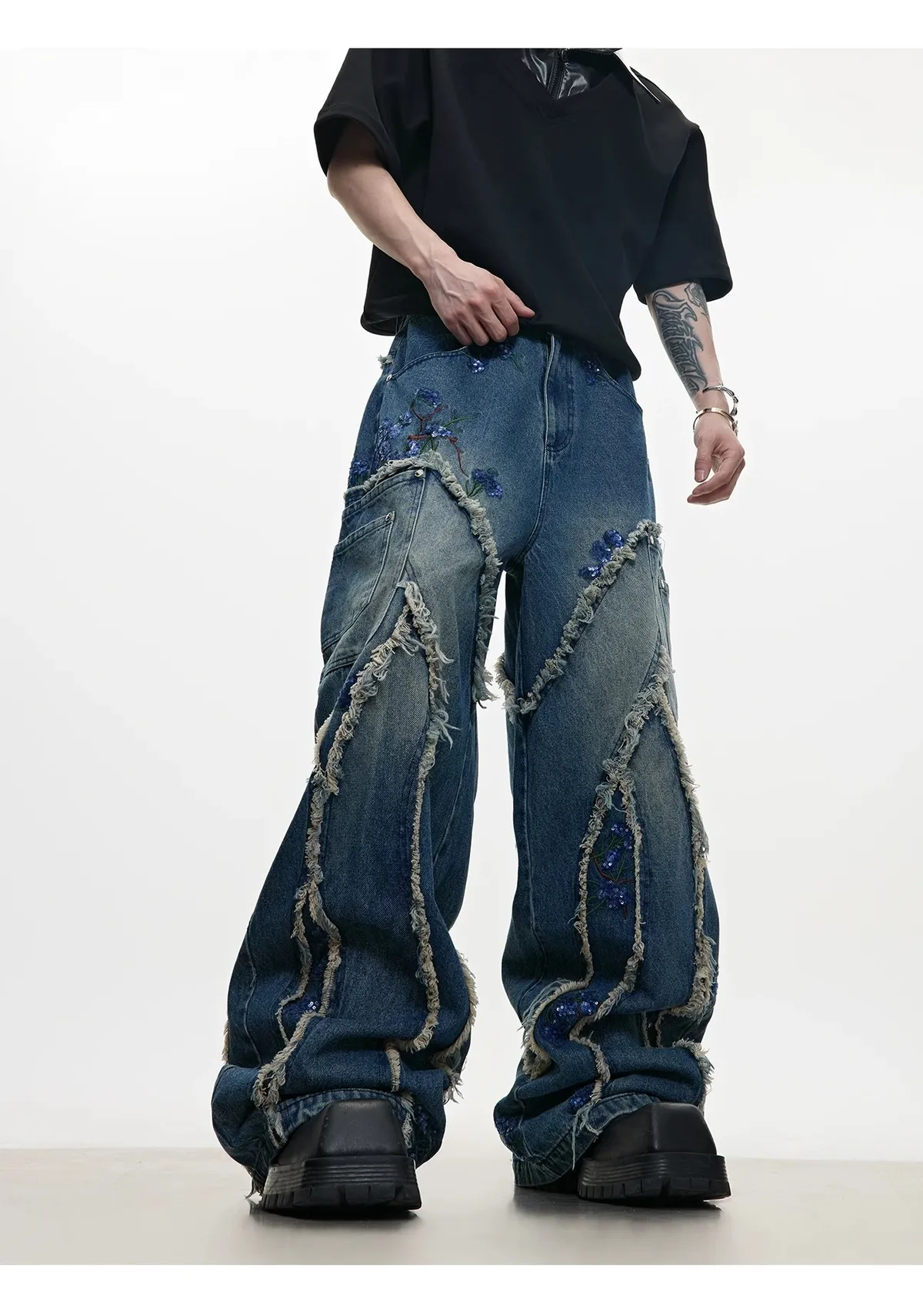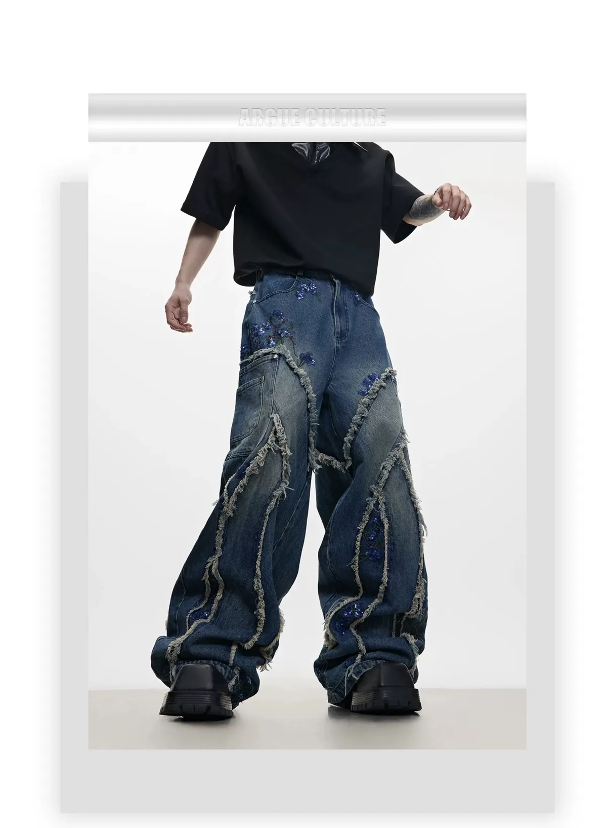 ARGUE 亮片刺繡 抽鬚 牛仔褲(藍色)