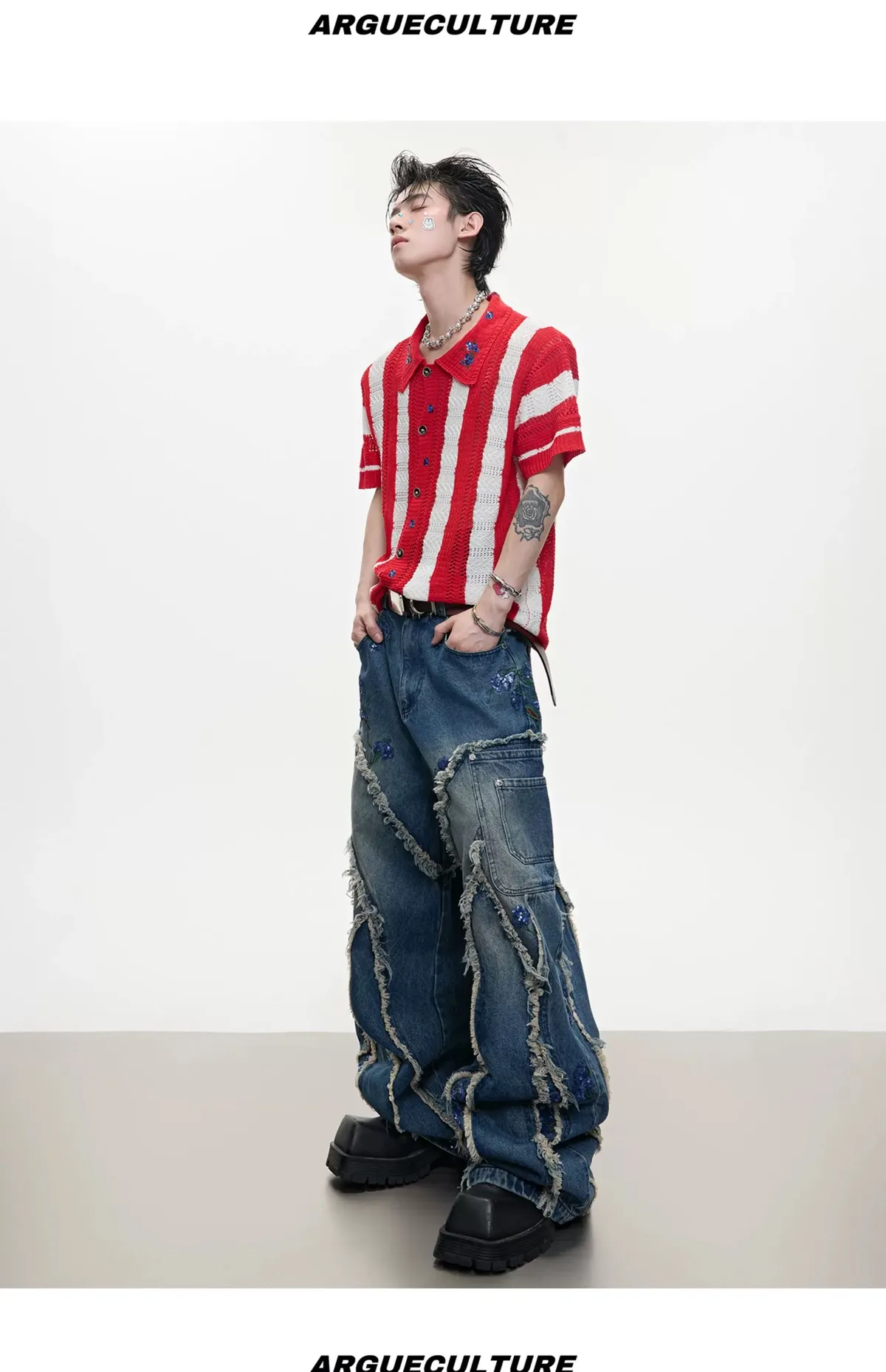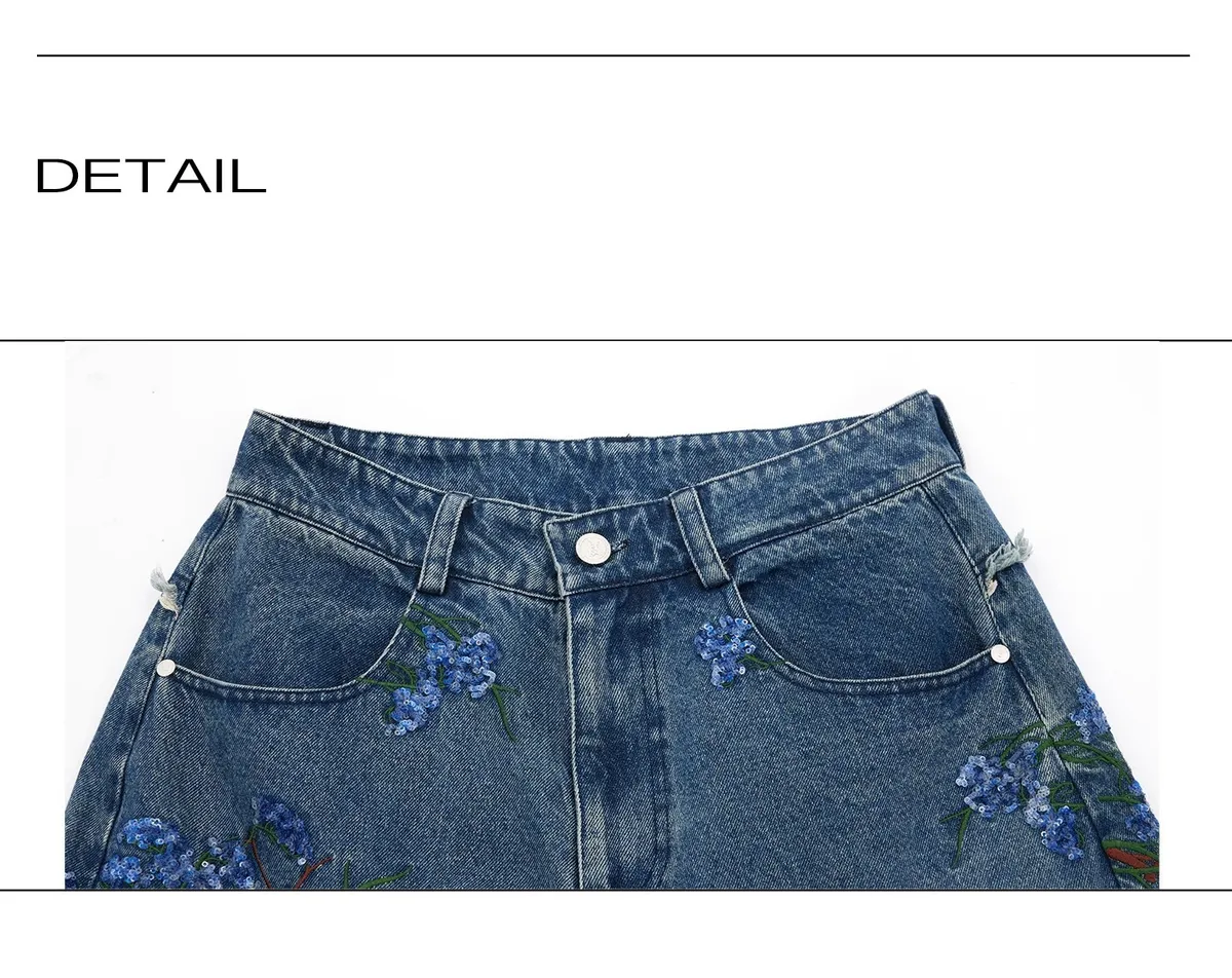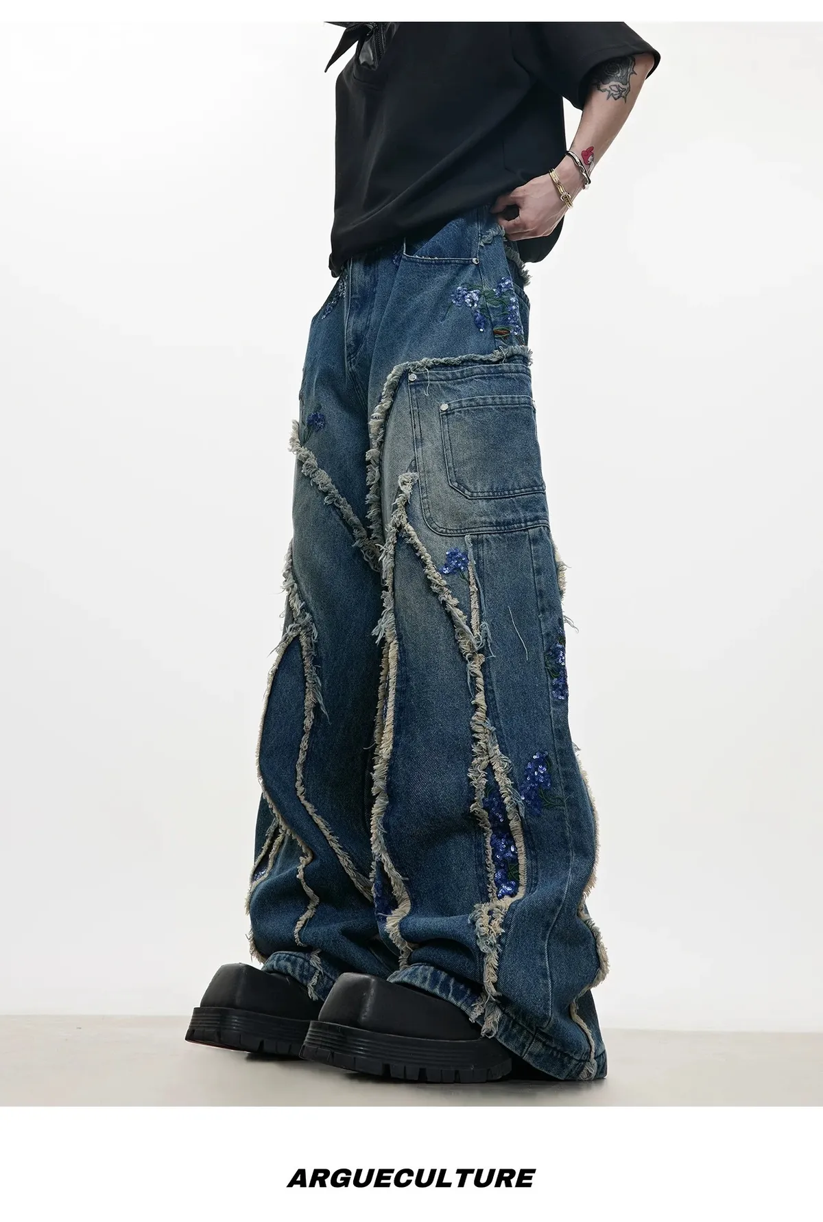 ARGUE 亮片刺繡 抽鬚 牛仔褲(藍色)