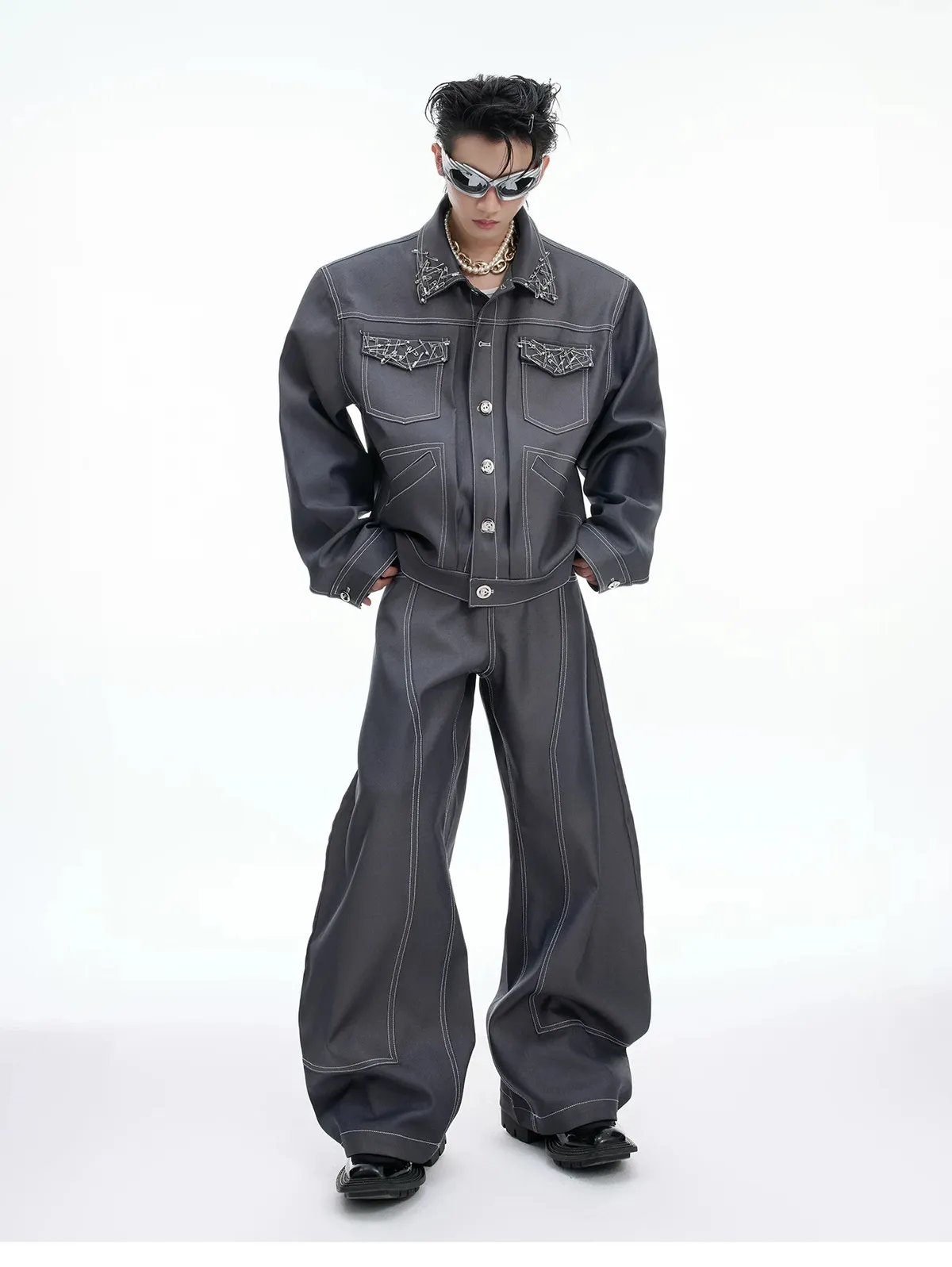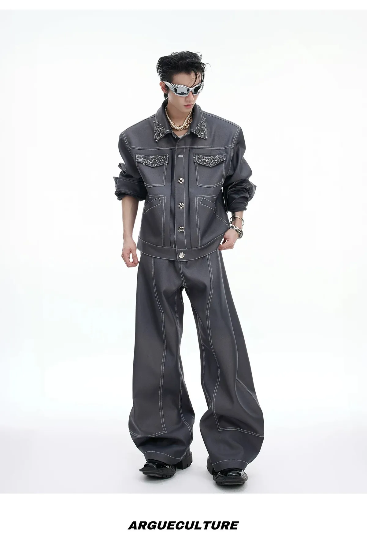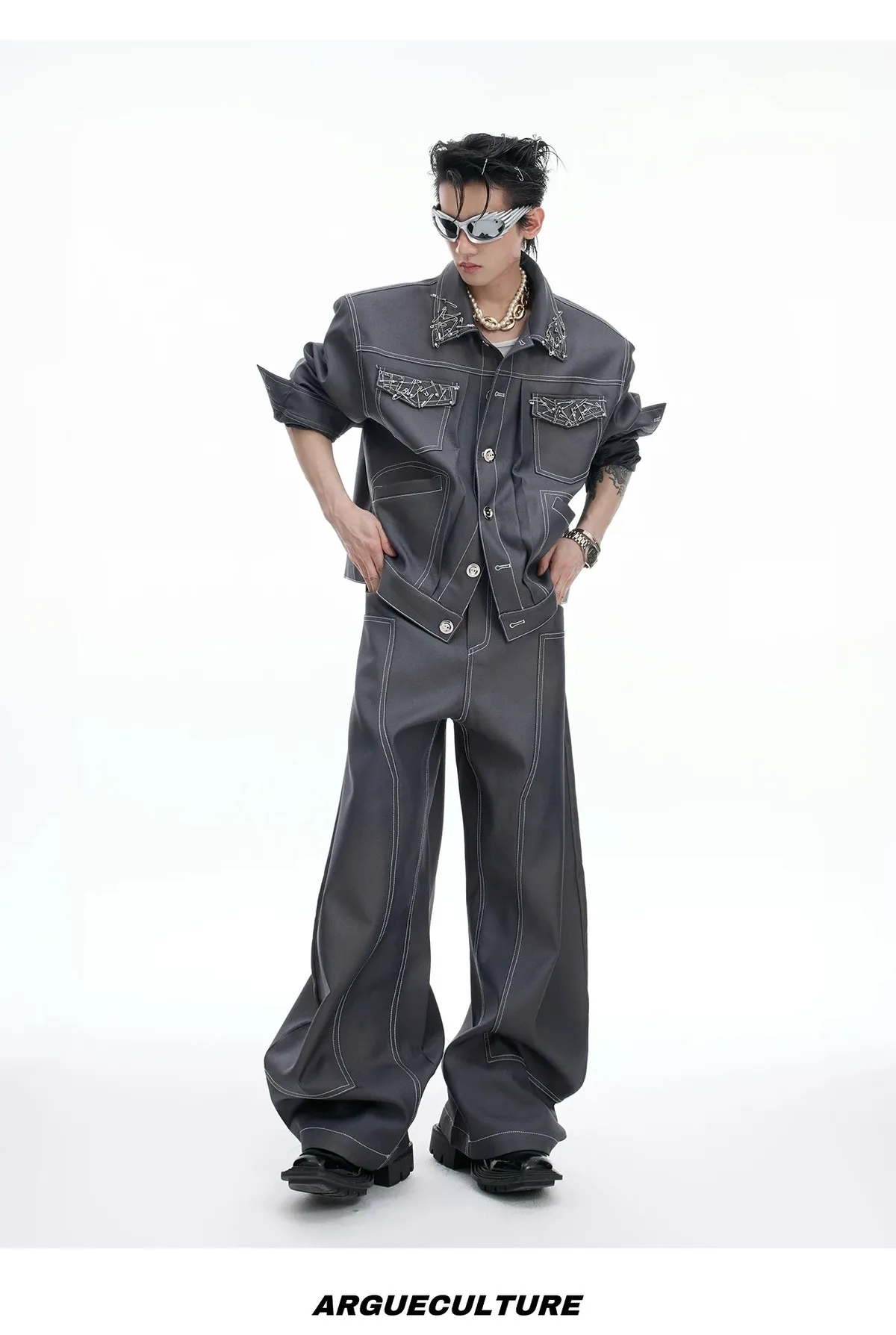 ARGUE 灰影縫線 手工別針 塗層 牛仔外套 牛仔褲 彎刀褲 套裝(灰色)