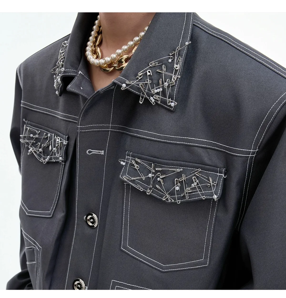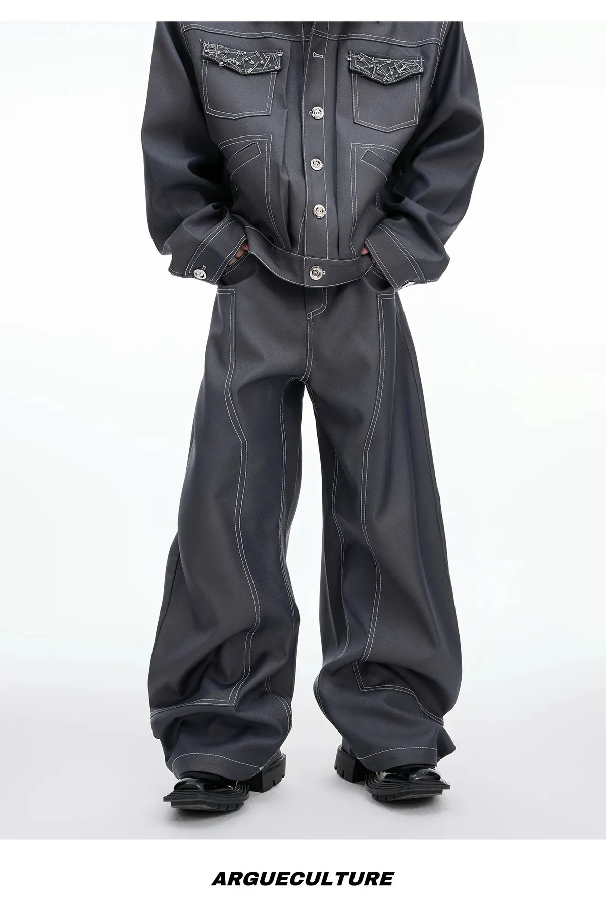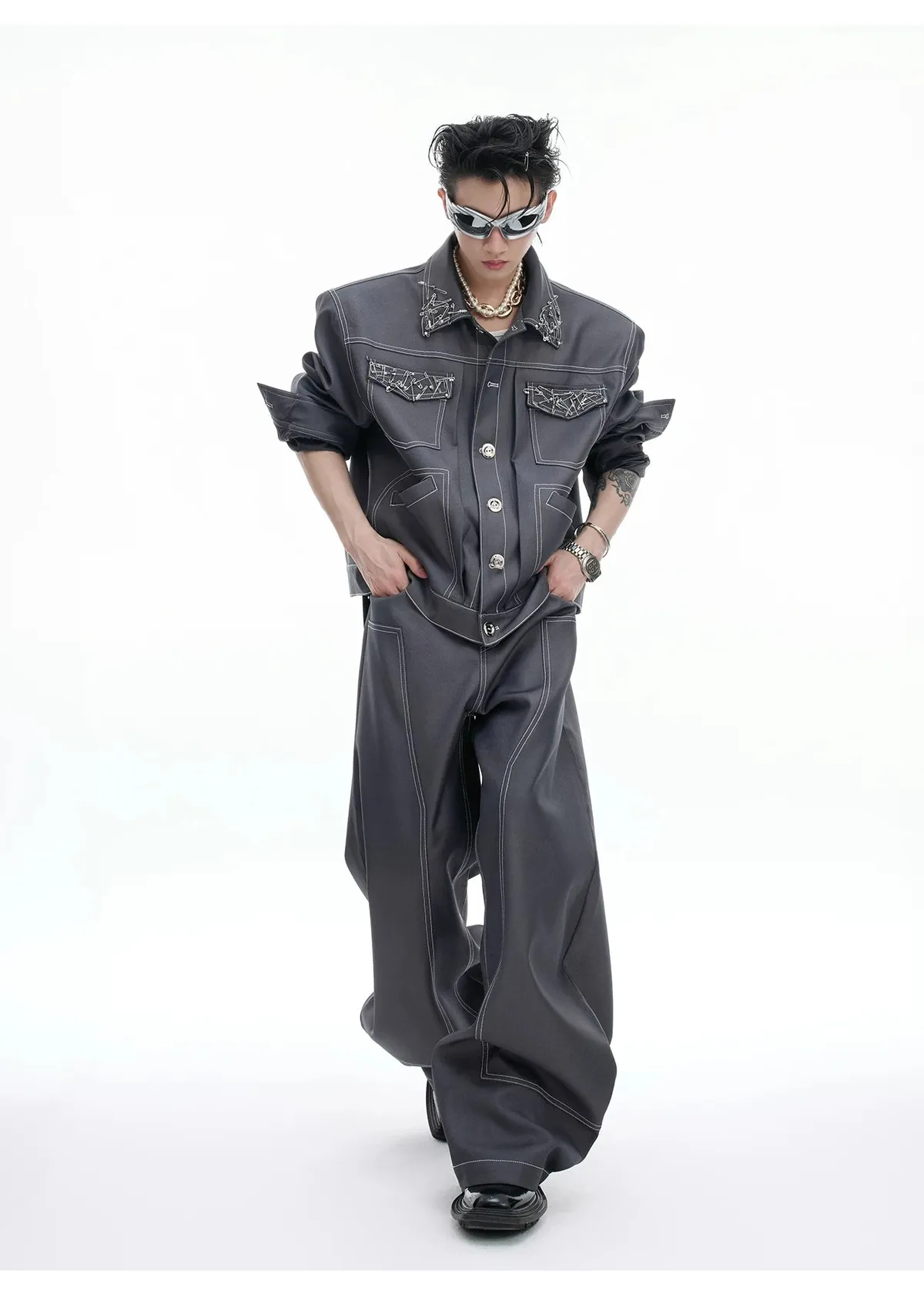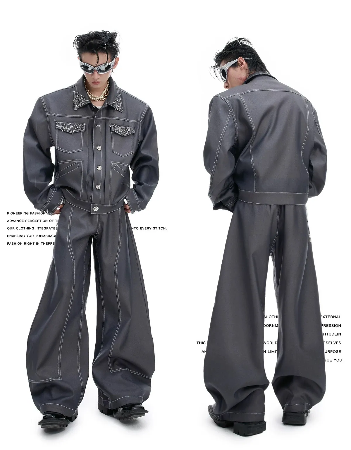 ARGUE 灰影縫線 手工別針 塗層 牛仔外套 牛仔褲 彎刀褲 套裝(灰色)