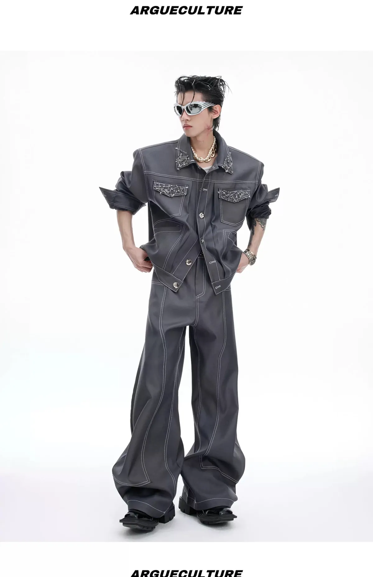 ARGUE 底特律 水洗牛仔 皮革拼接 襯衫 牛仔褲 套裝(藍色)