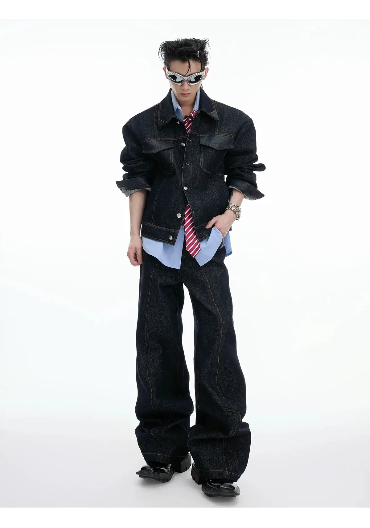 ARGUE 珍珠縫線 軟牛仔 寬短 外套 牛仔褲 套裝(黑/白/棕)