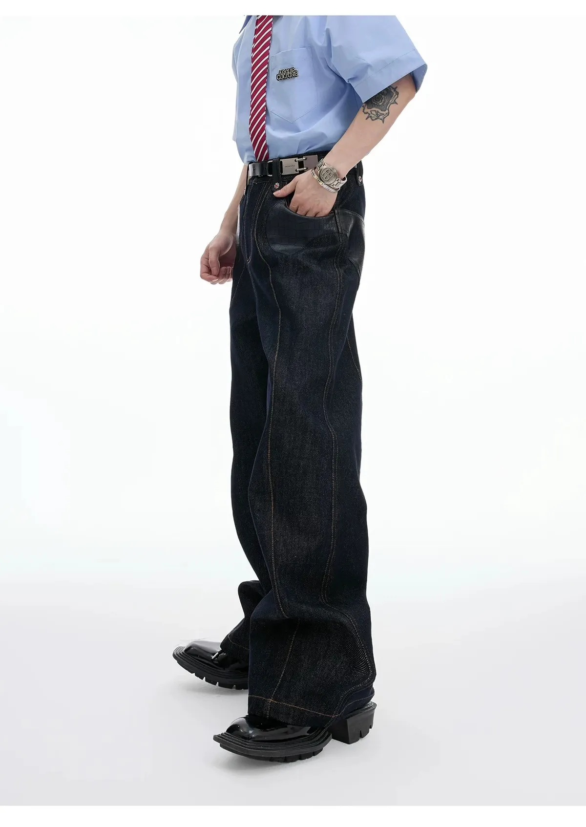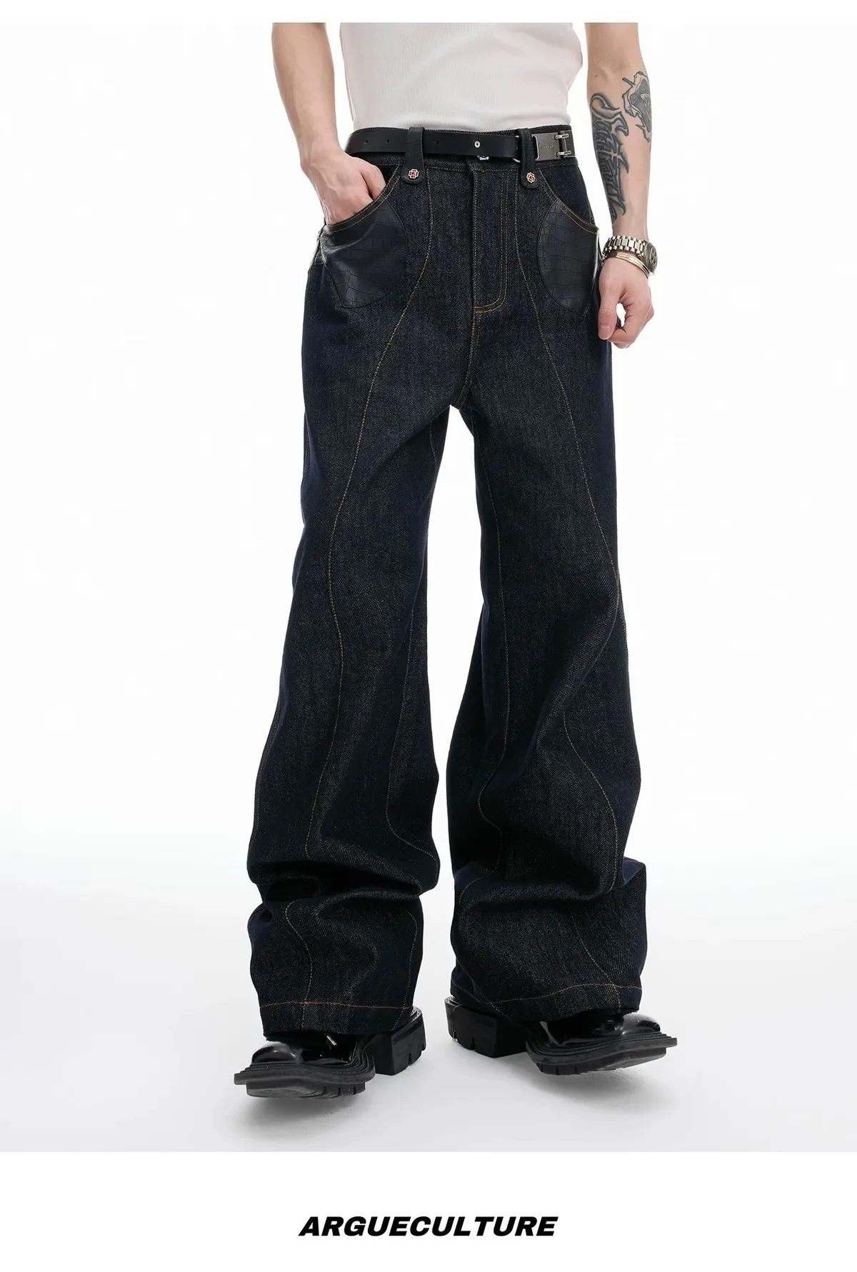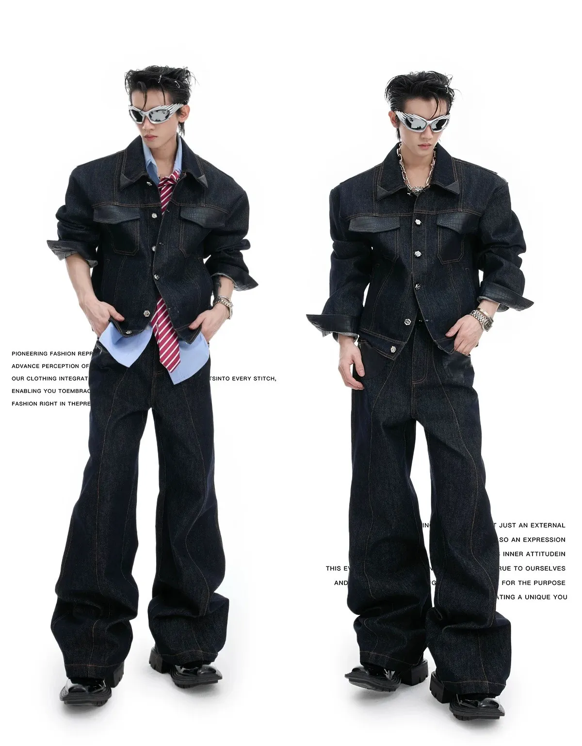 ARGUE 底特律 水洗牛仔 皮革拼接 襯衫 牛仔褲 套裝(藍色)