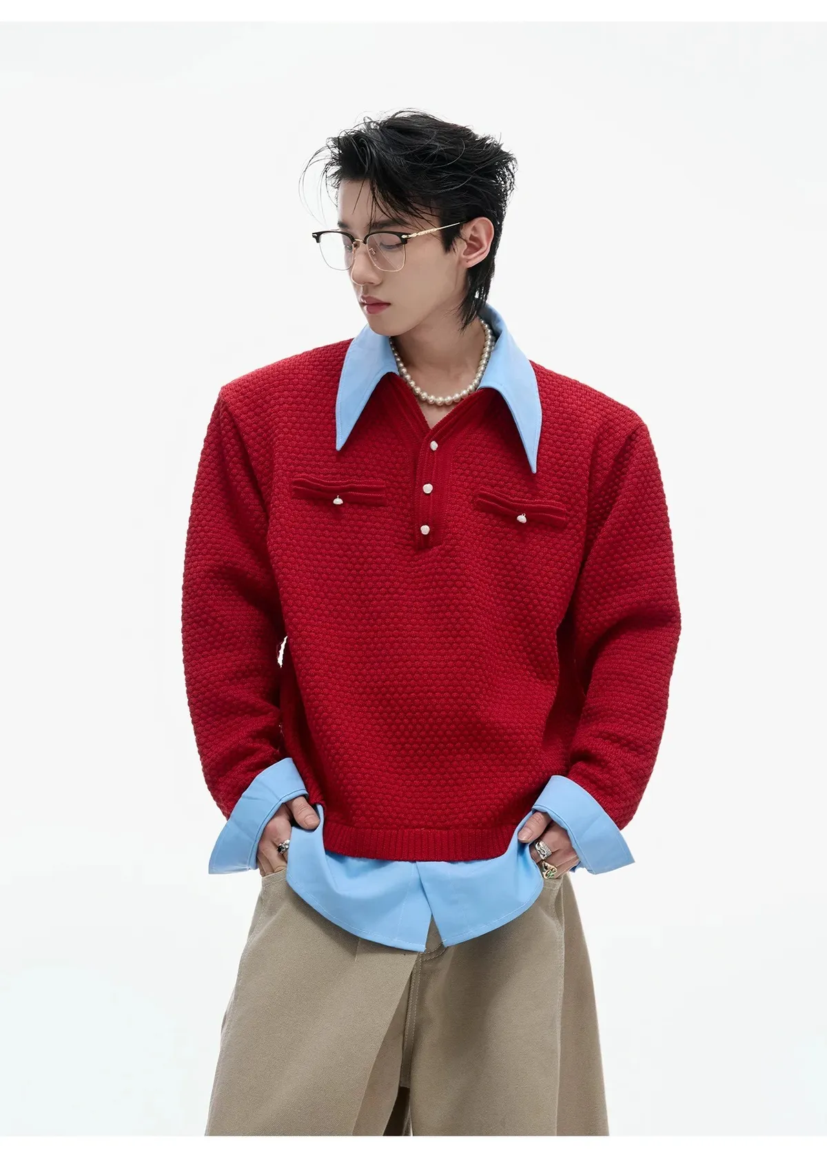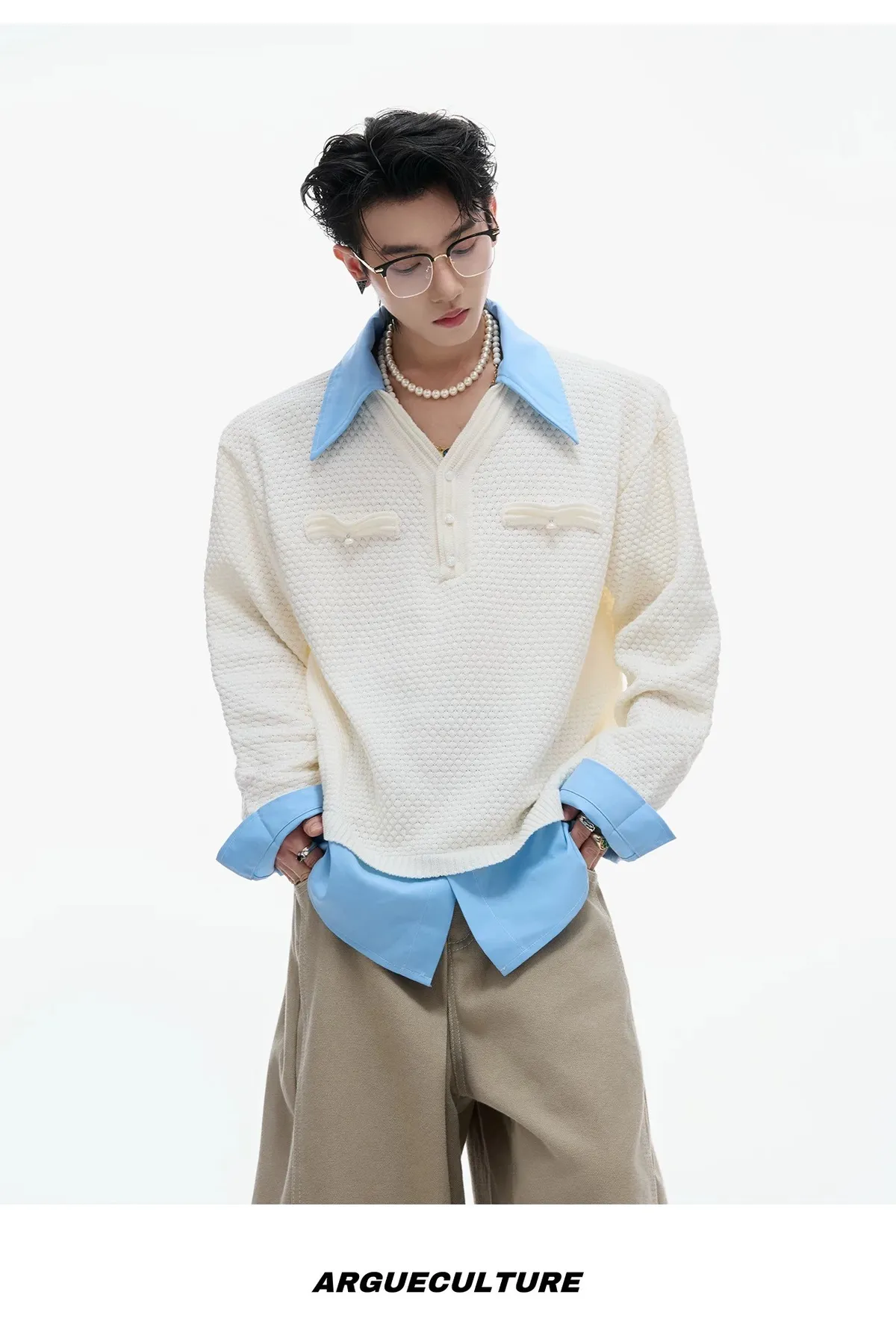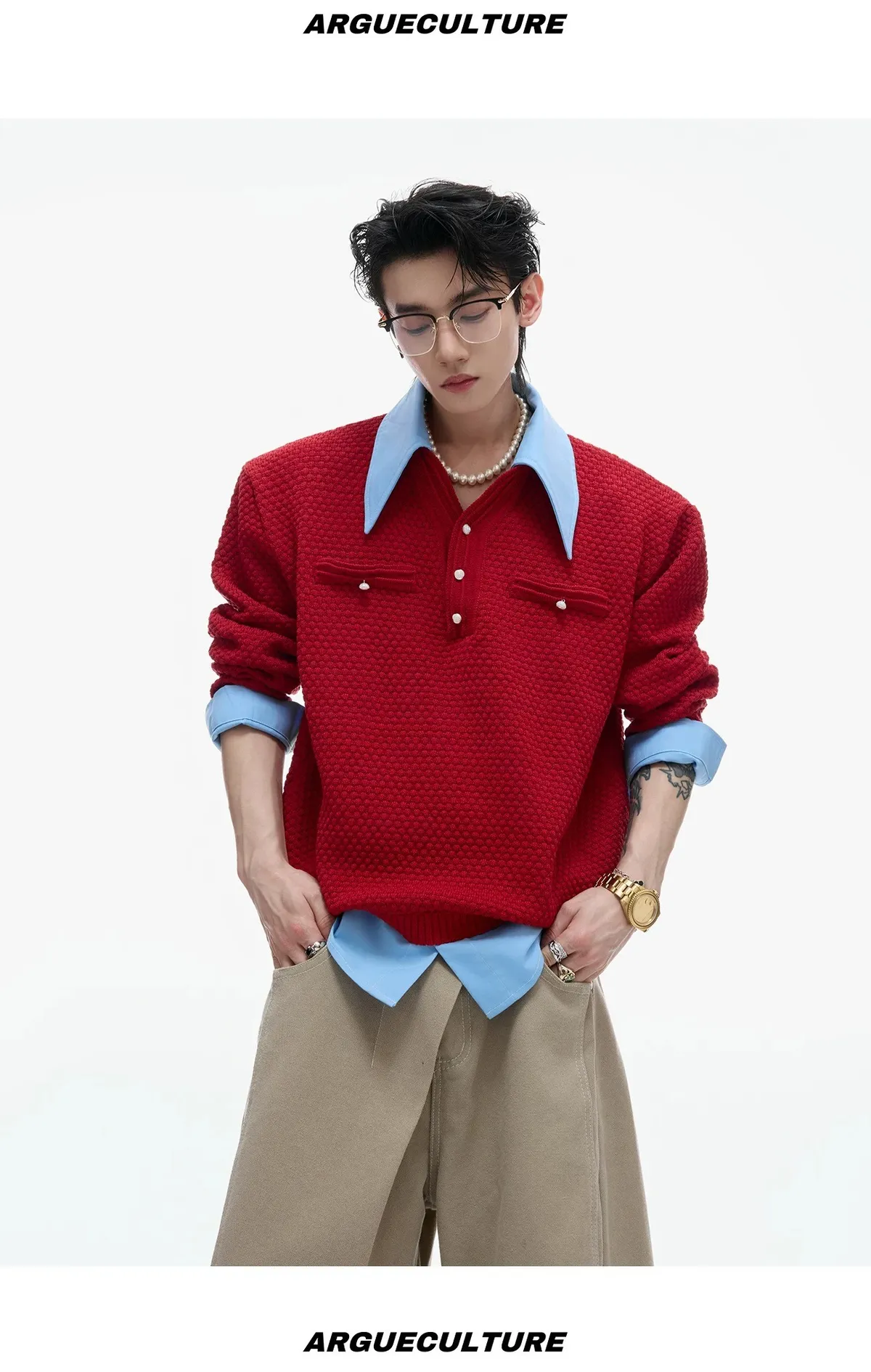 ARGUE 肌理感假兩件 撞色拼接 針織 POLO(黑/白/紅)