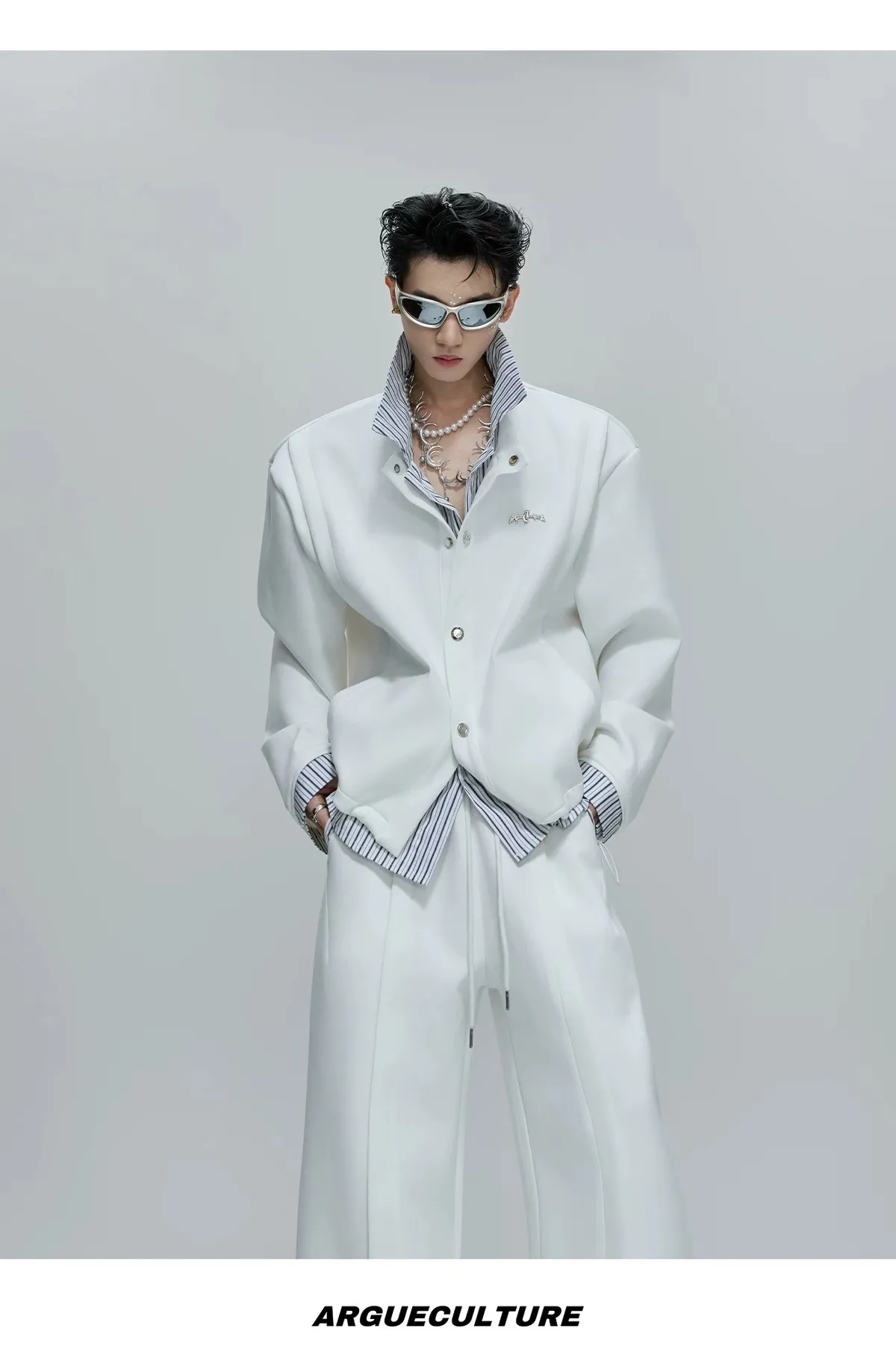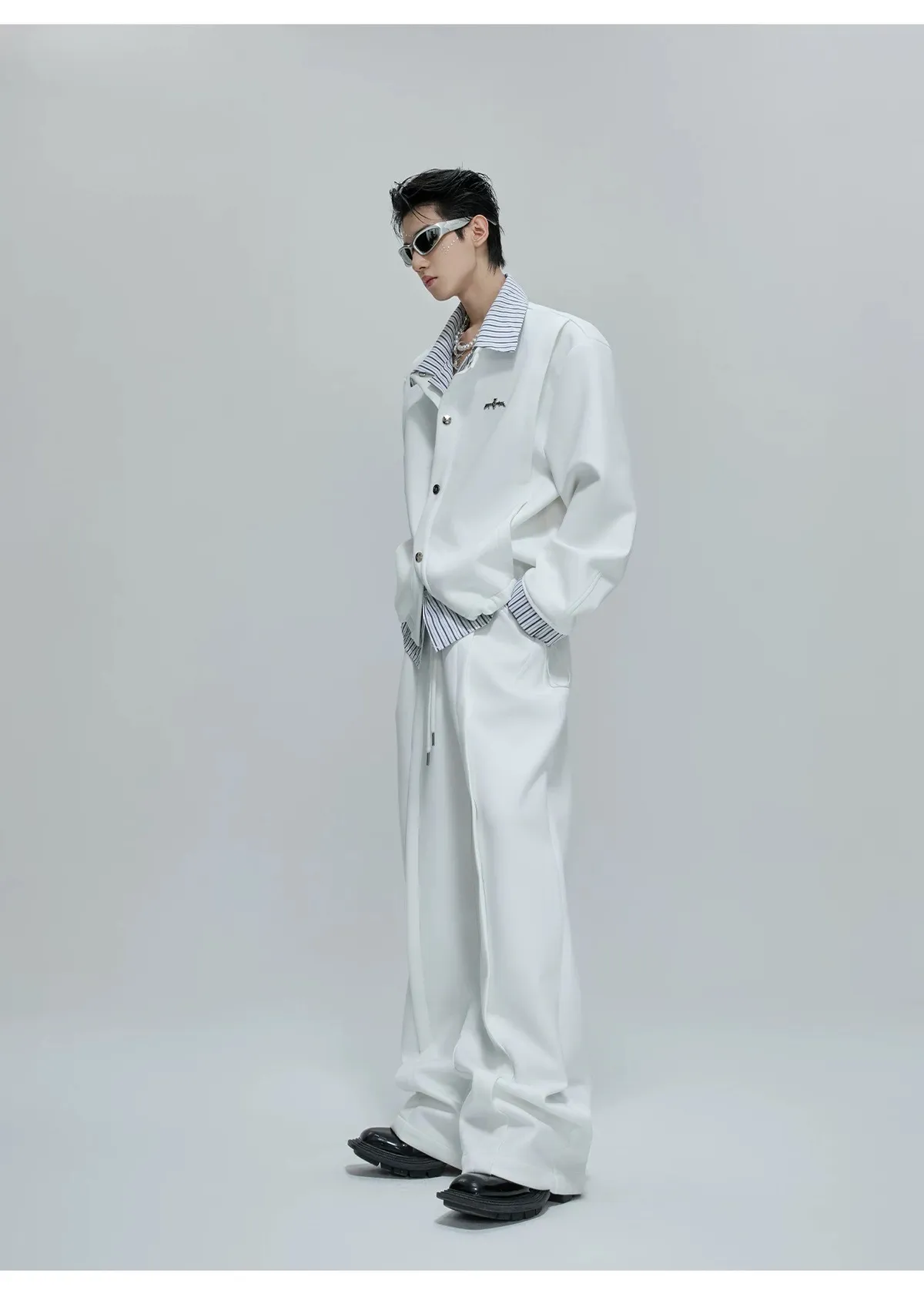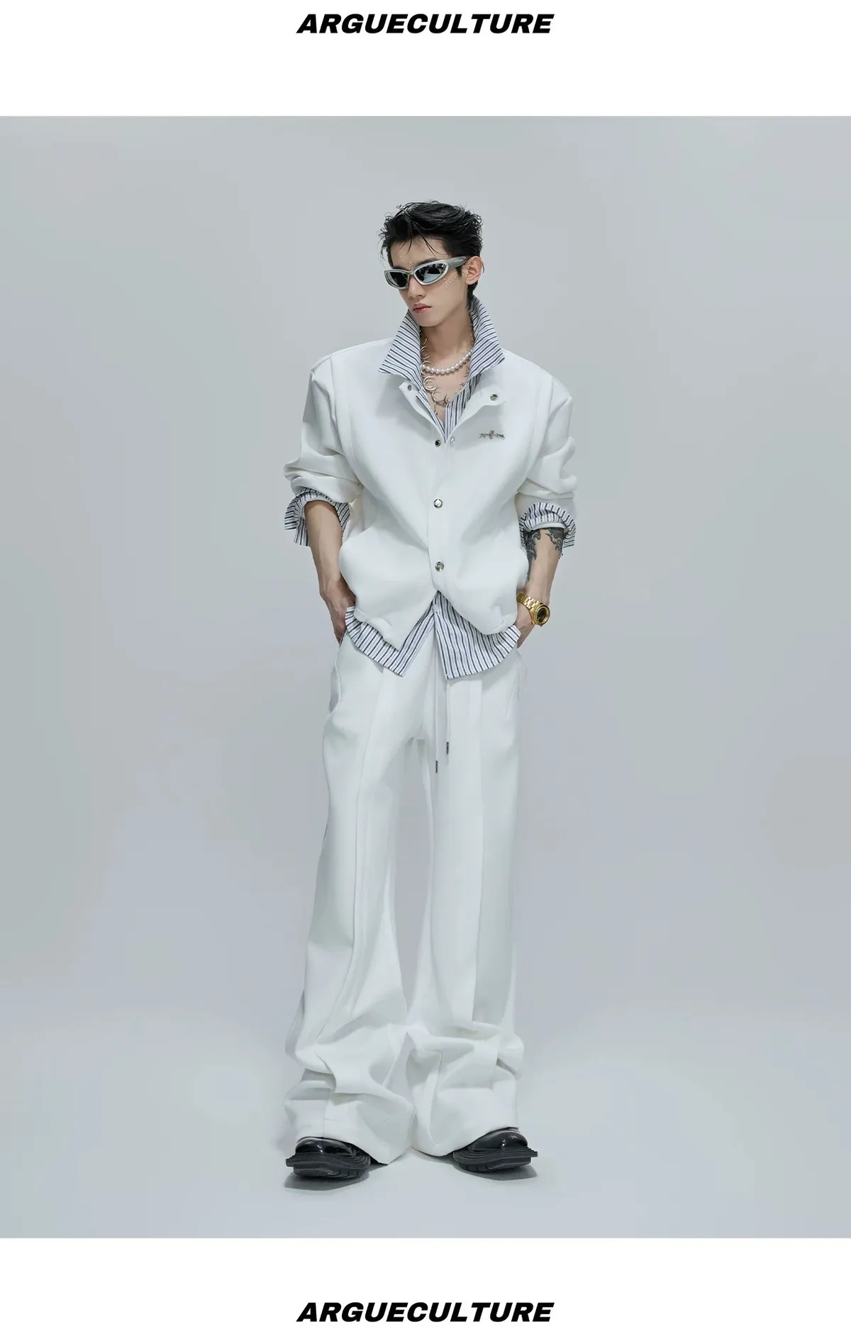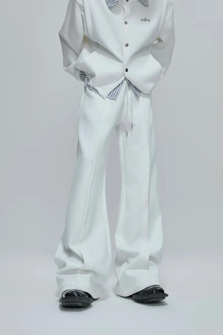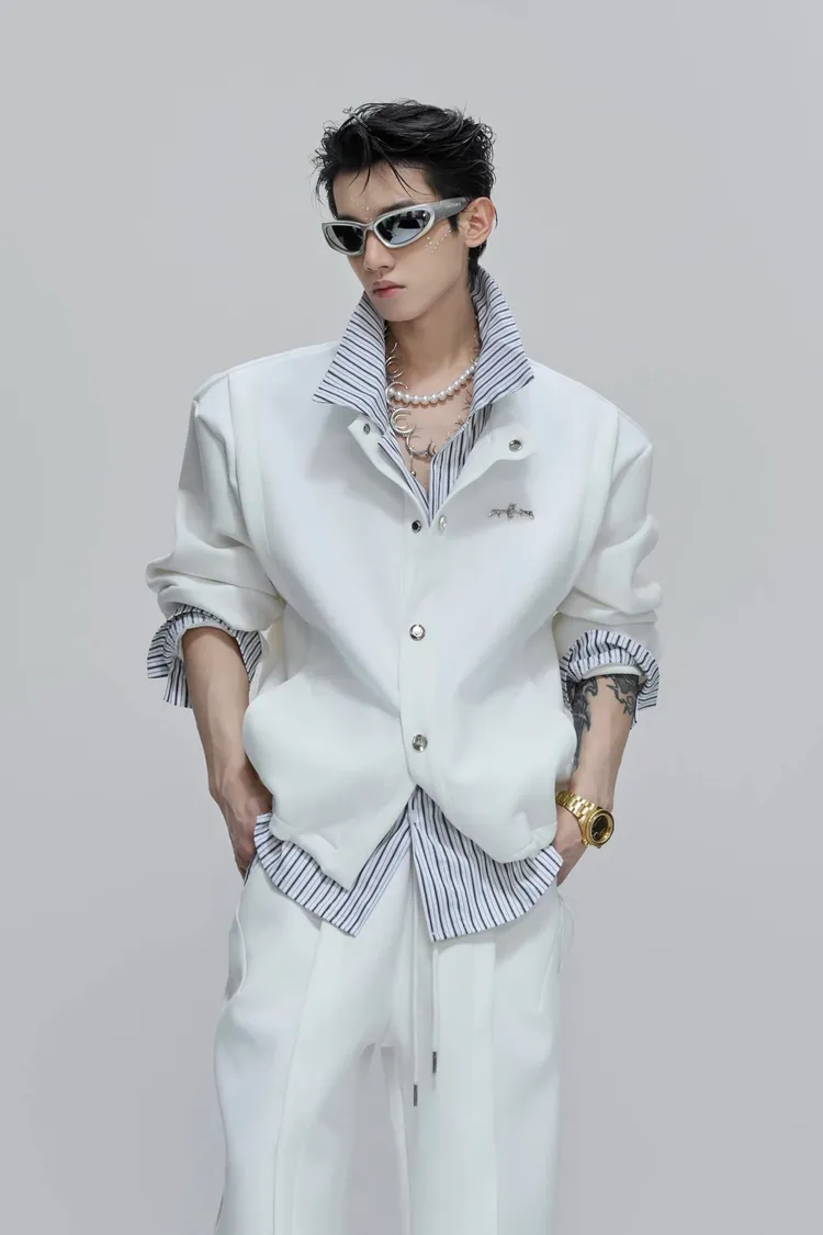 ARGUE 襯衫拼接 假兩件 西裝褲 套裝(白/卡其)
