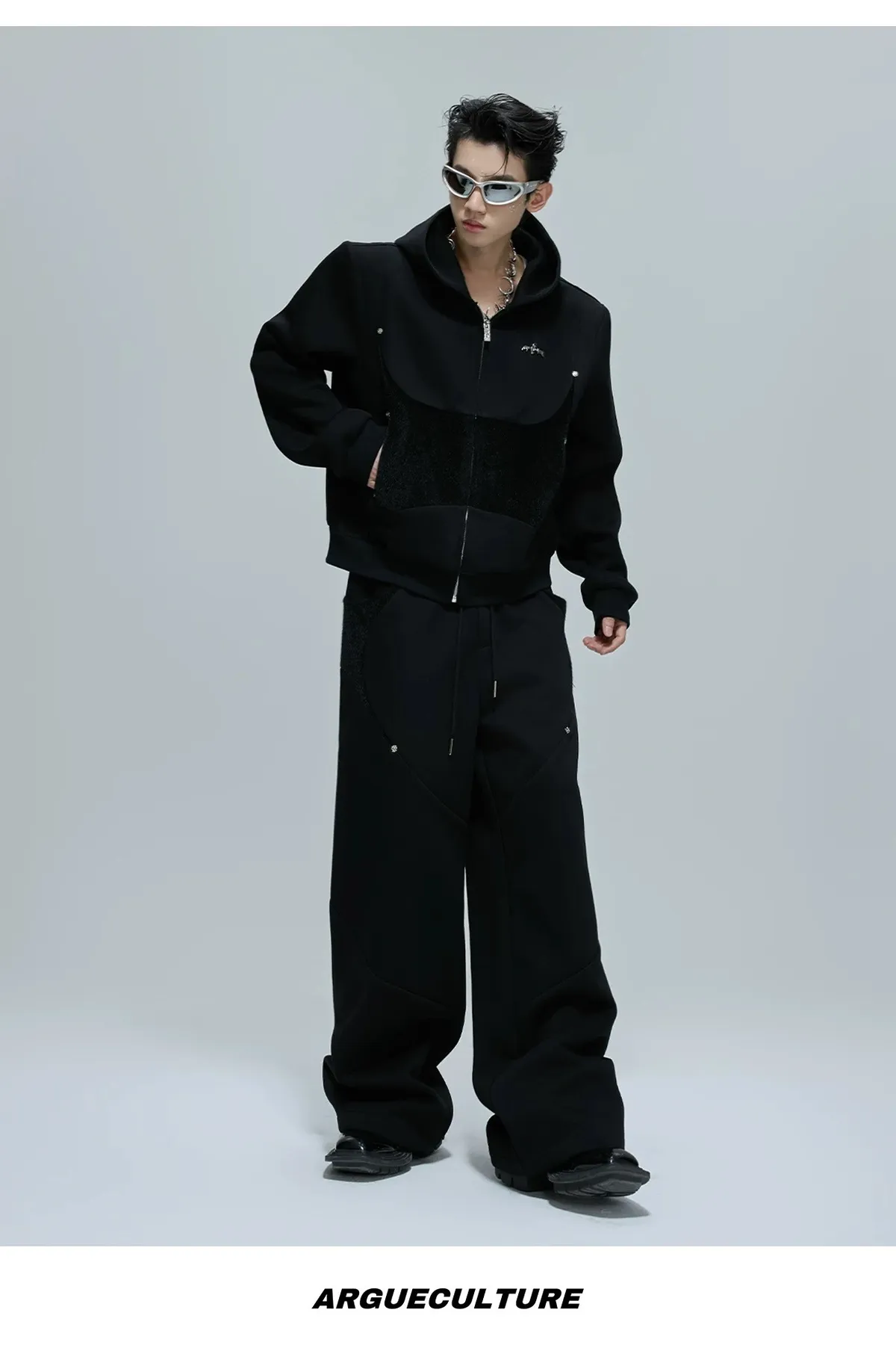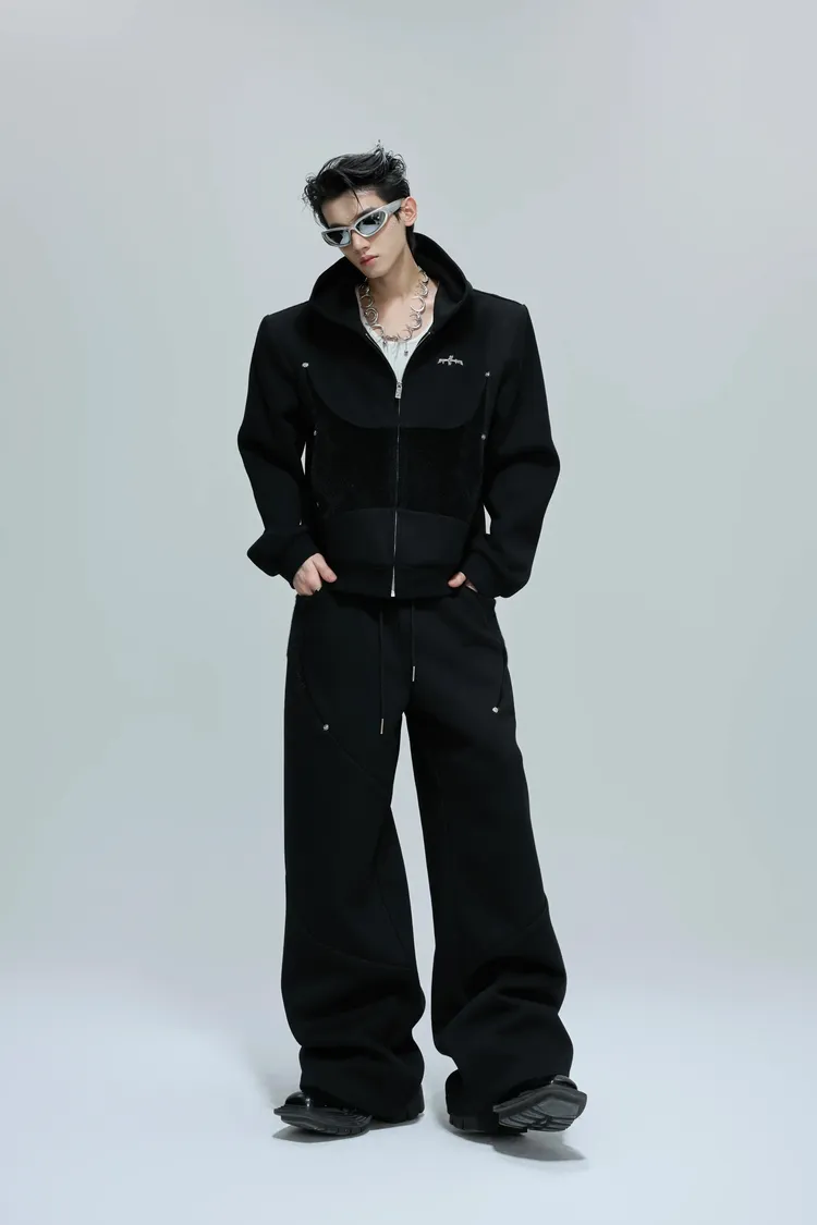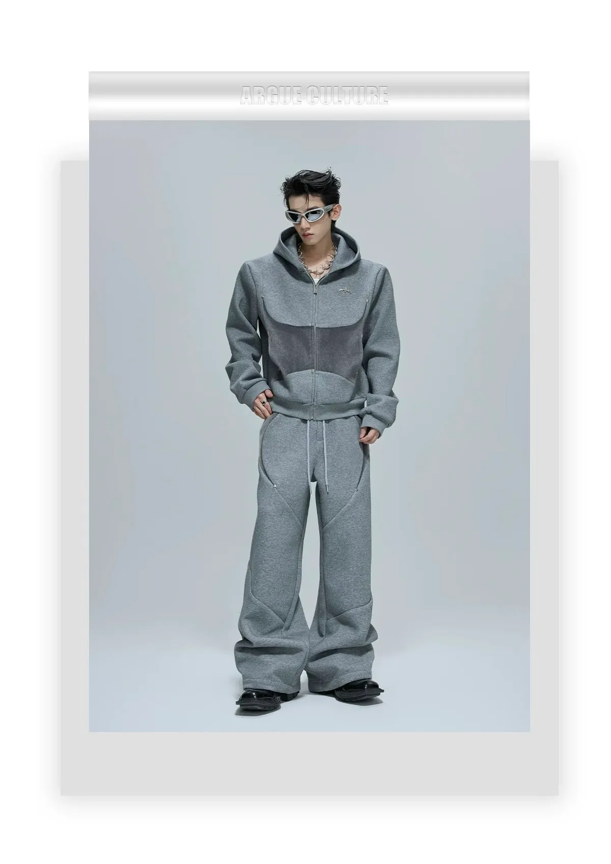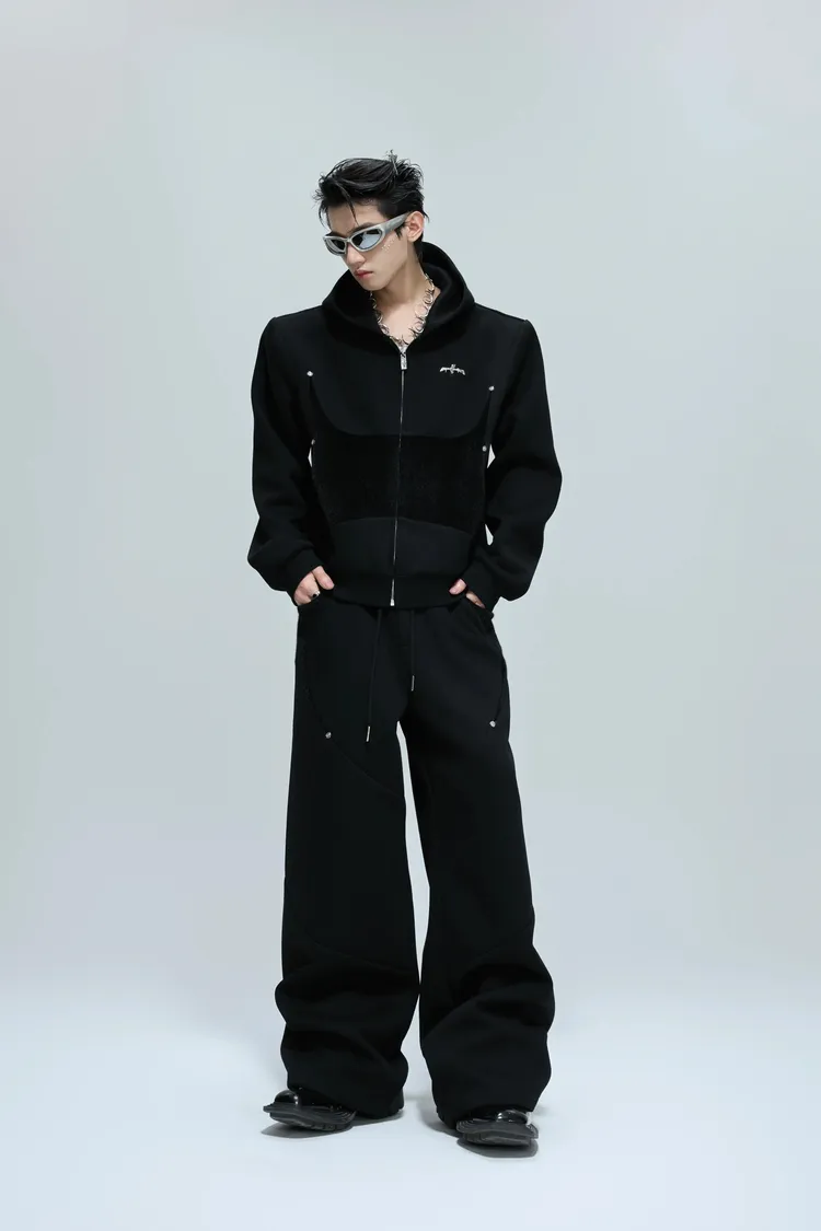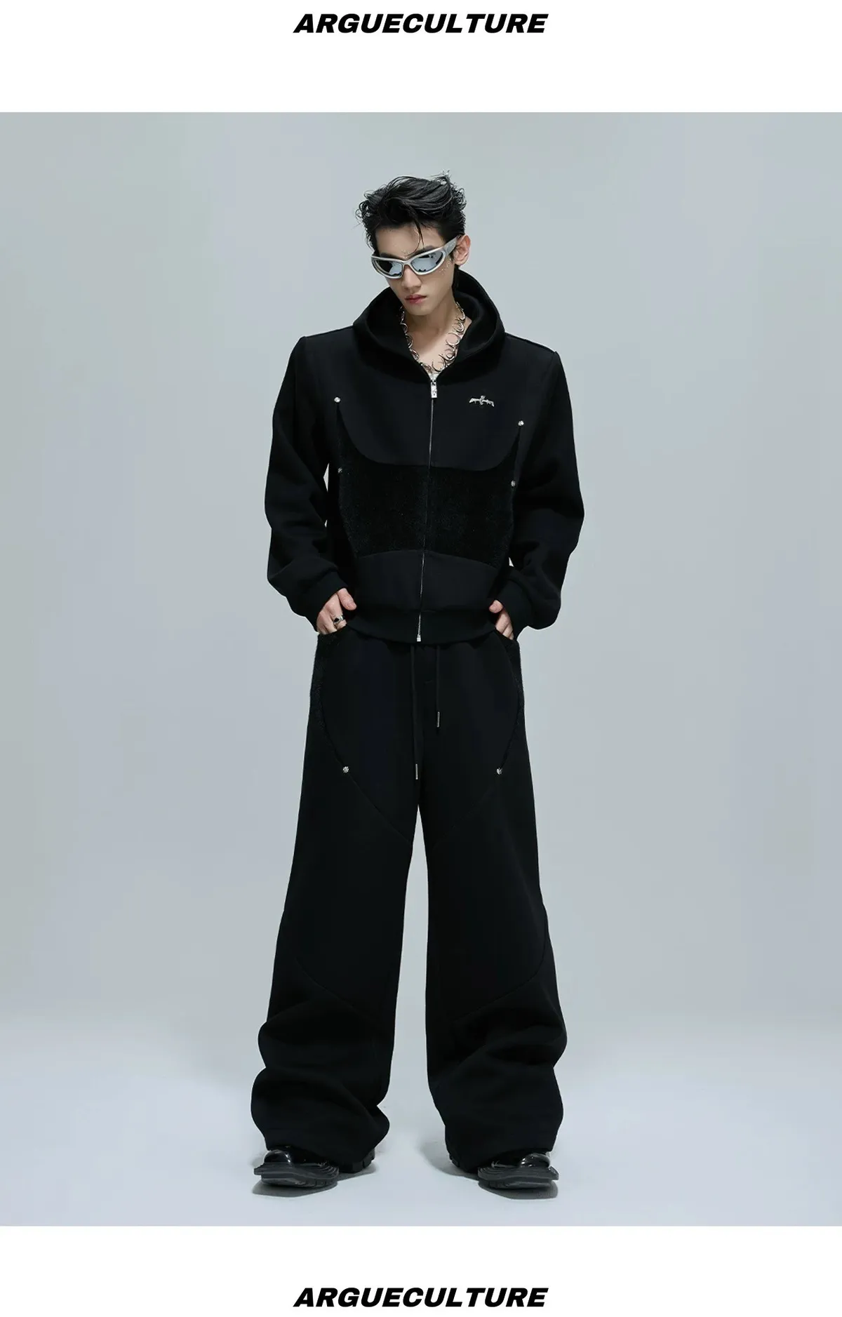 ARGUE 馬毛拼接 解構短版 連帽外套 棉褲 套裝(黑/灰)