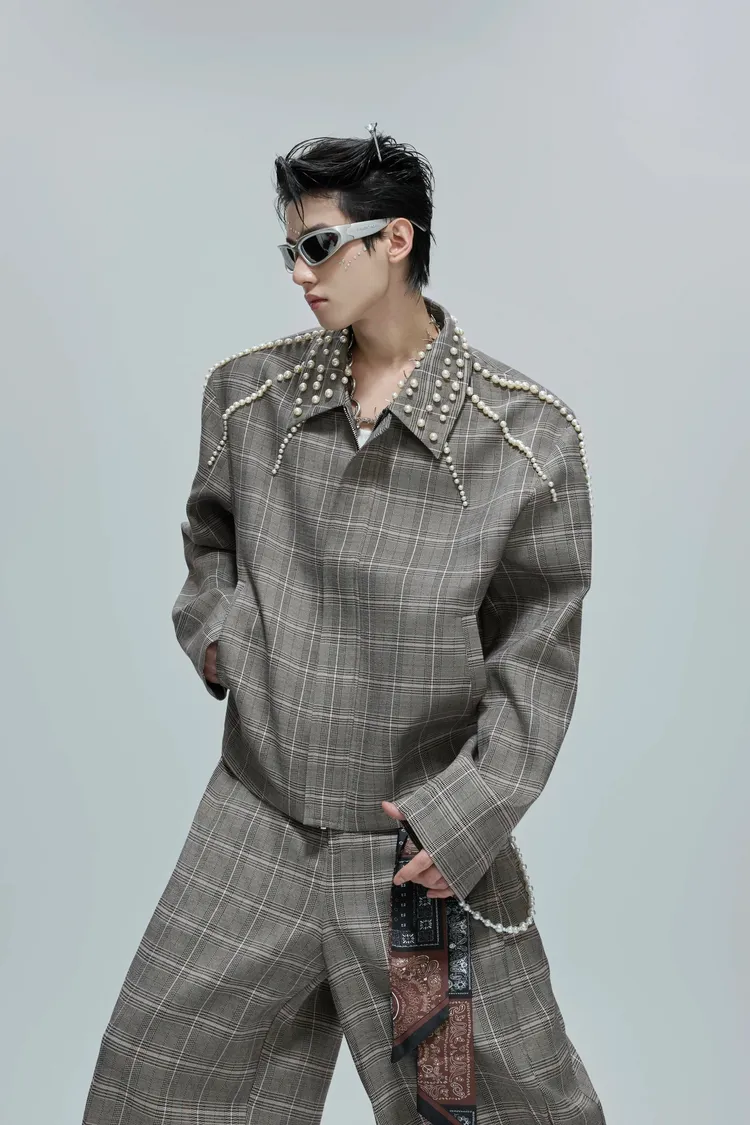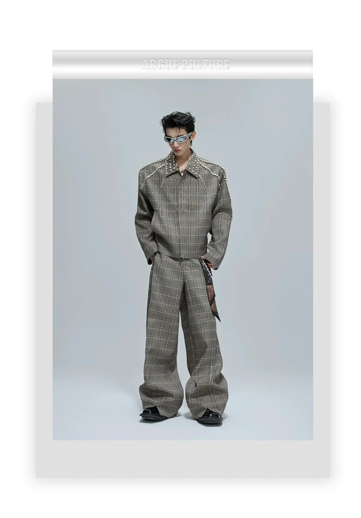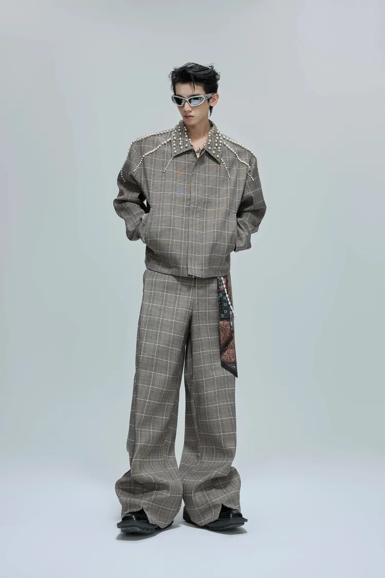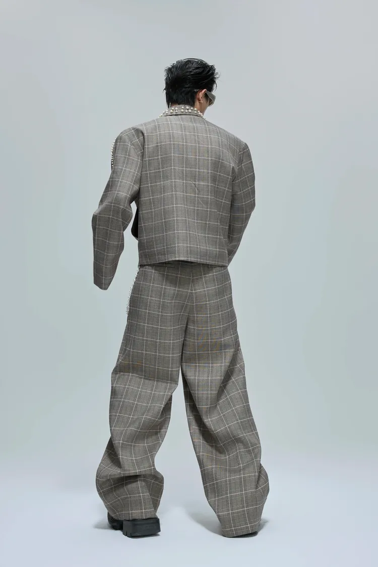 ARGUE 珍珠格紋 短版 翻領外套 西裝褲 套裝(卡其)