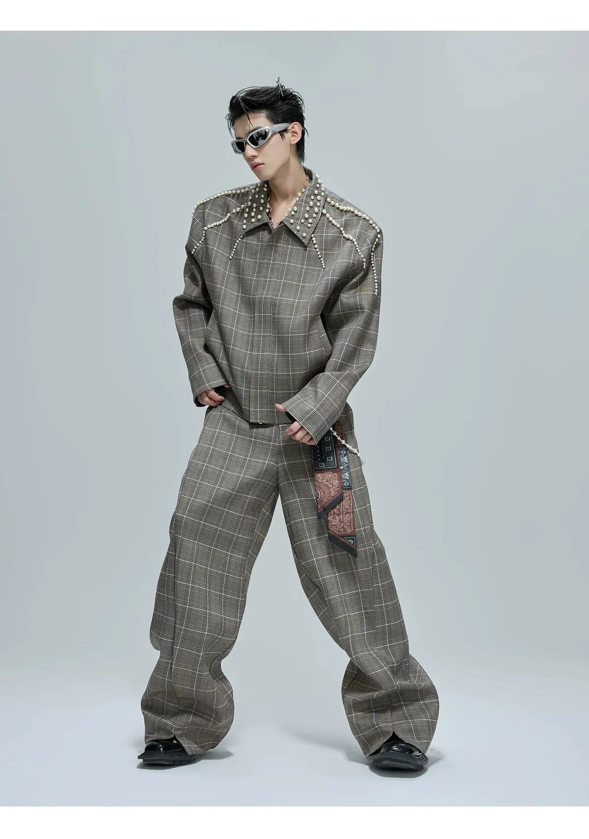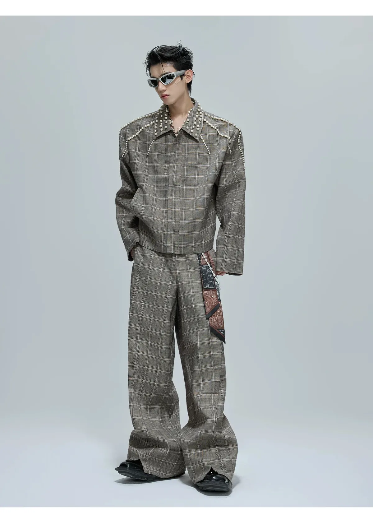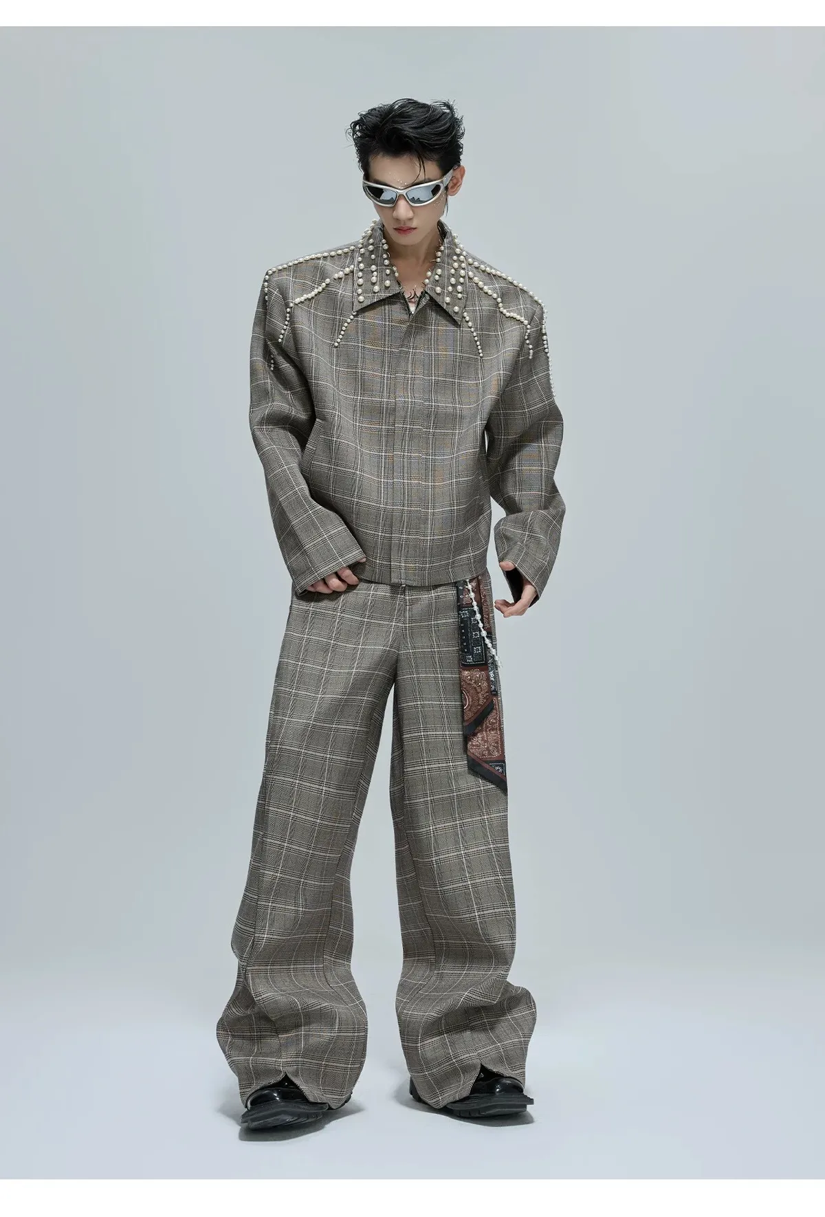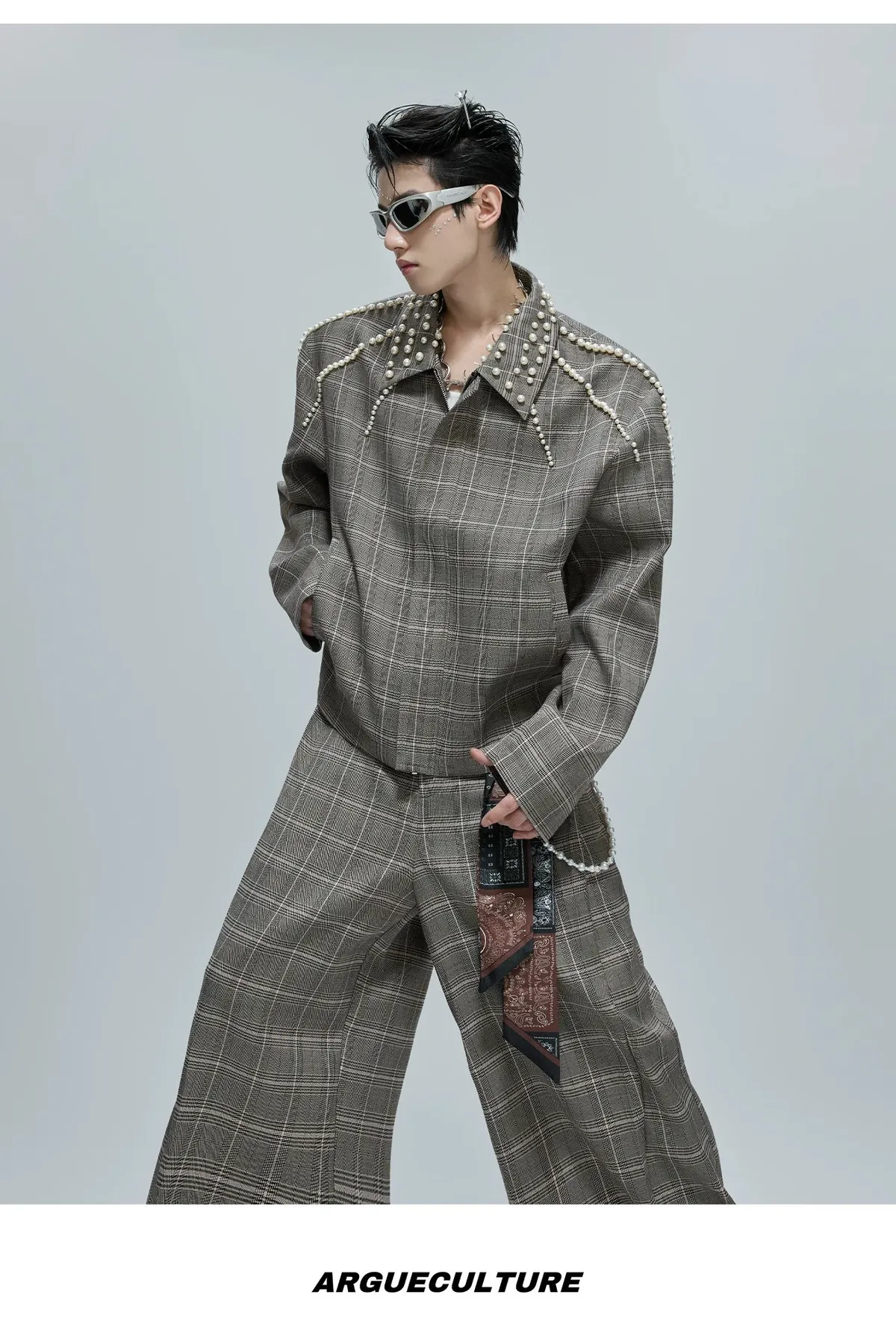 ARGUE 珍珠格紋 短版 翻領外套 西裝褲 套裝(卡其)
