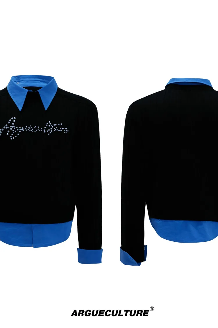 ARGUE 襯衫拼接 針織 V領毛衣(黑/灰)