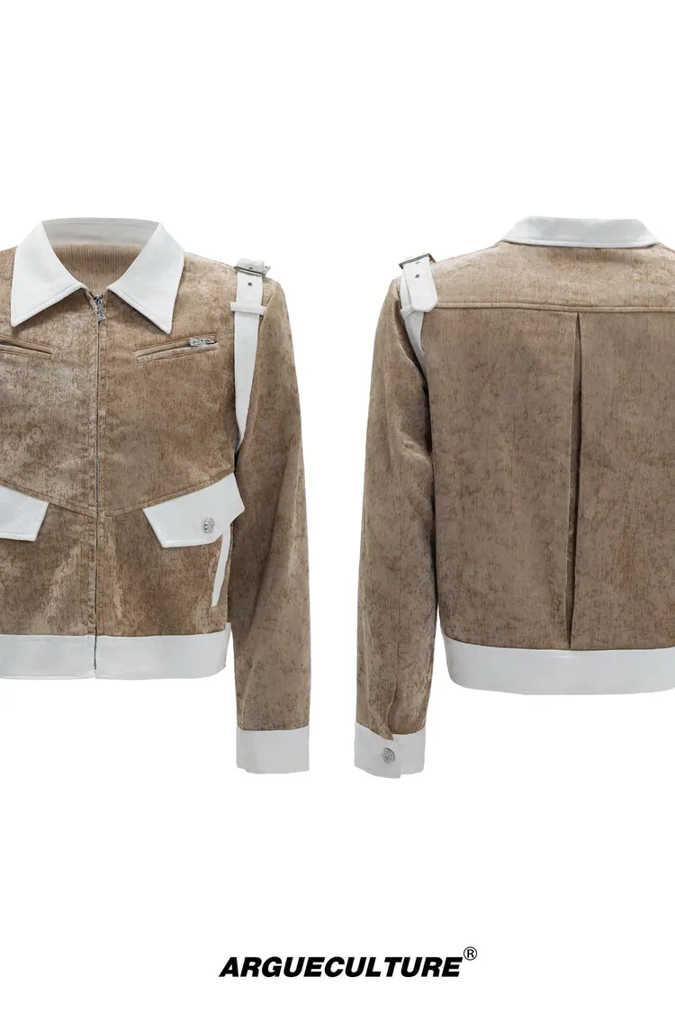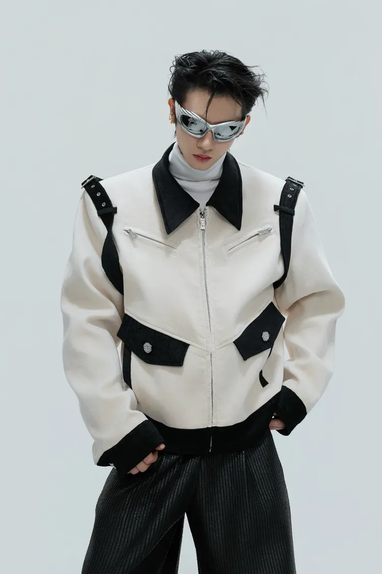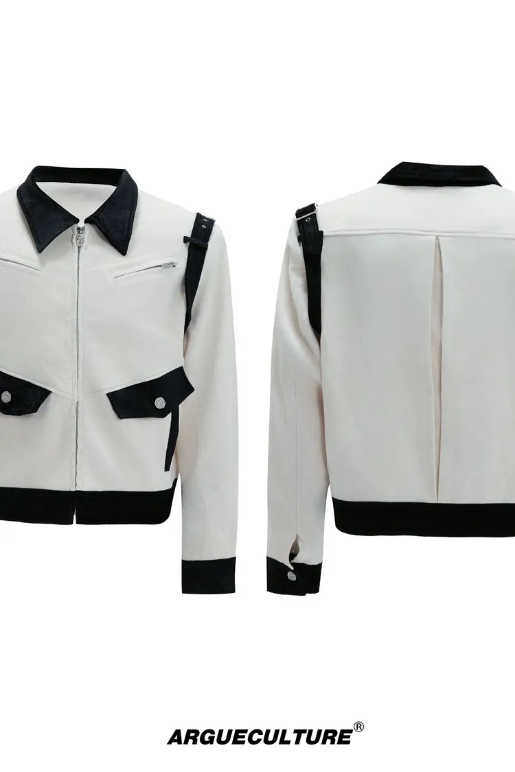 ARGUE 絲綢絨面 寬短大口袋 外套(白棕/黑白)