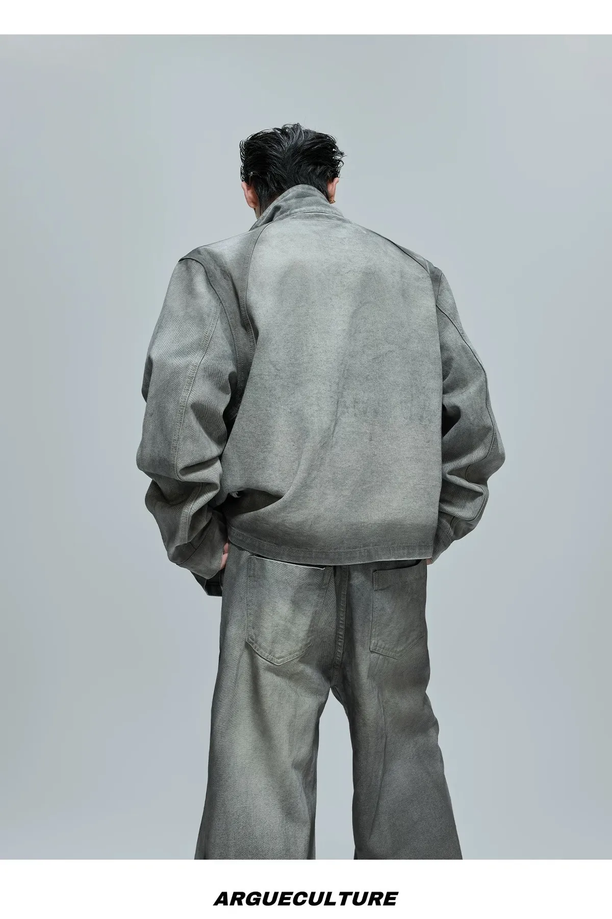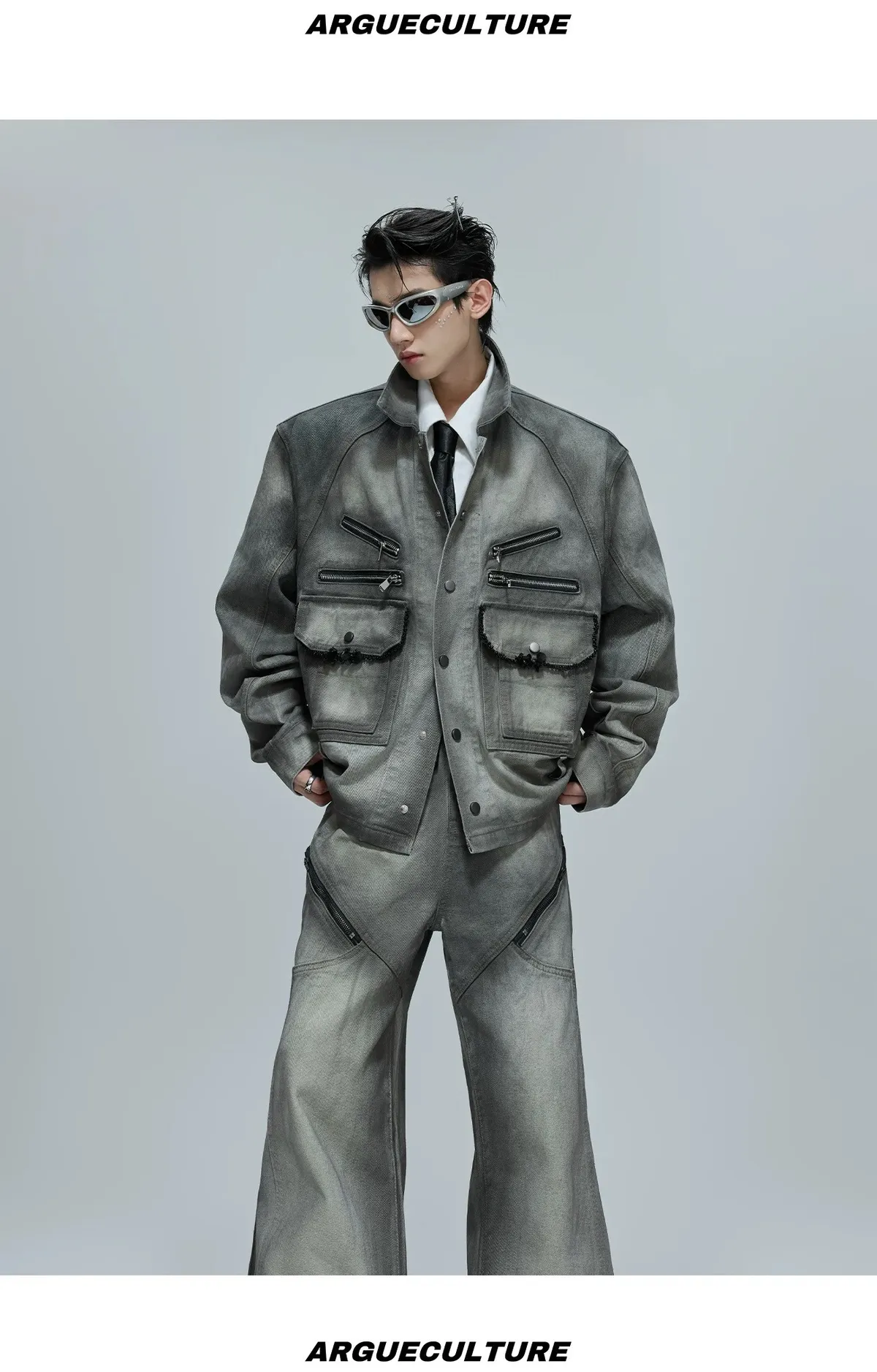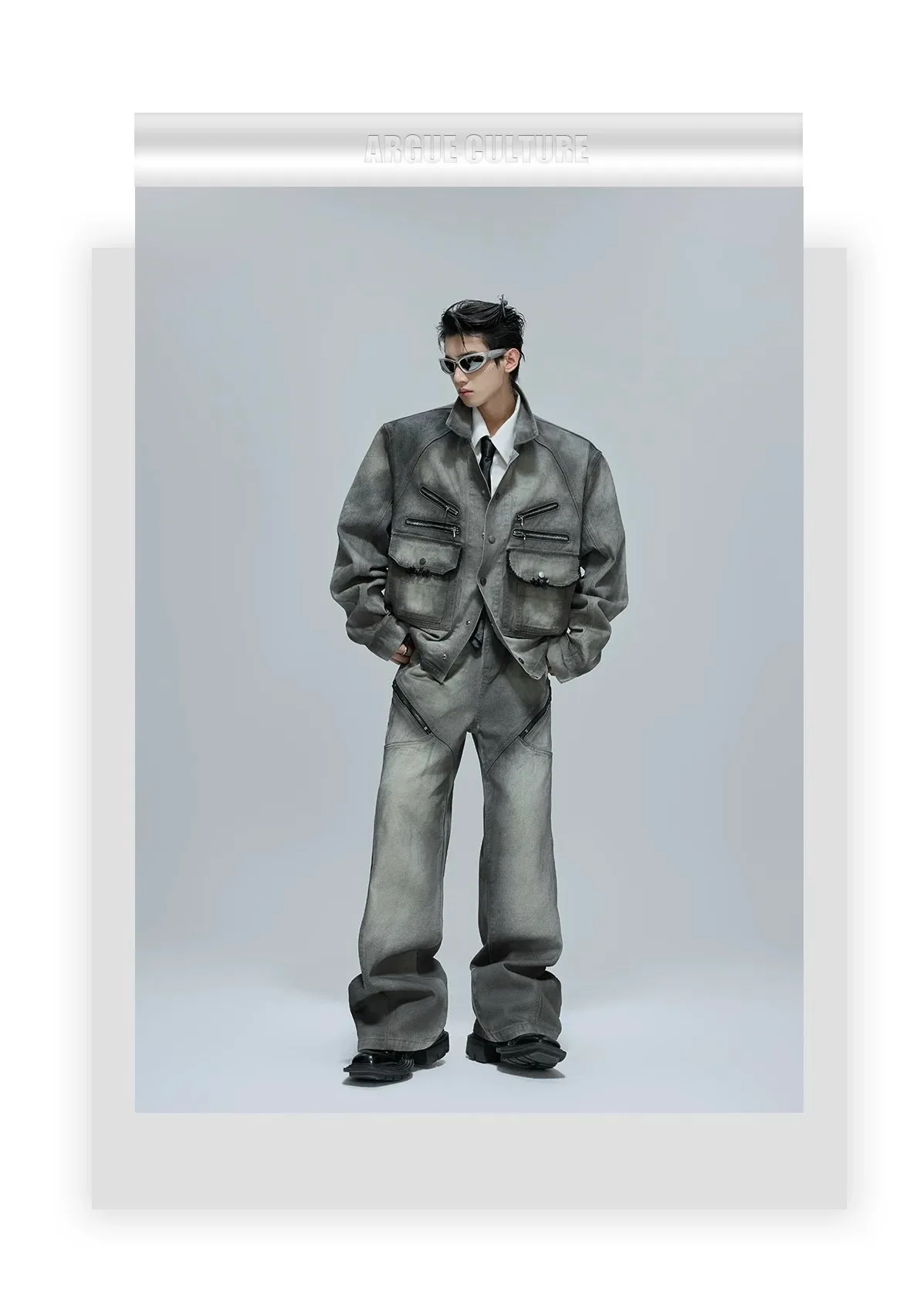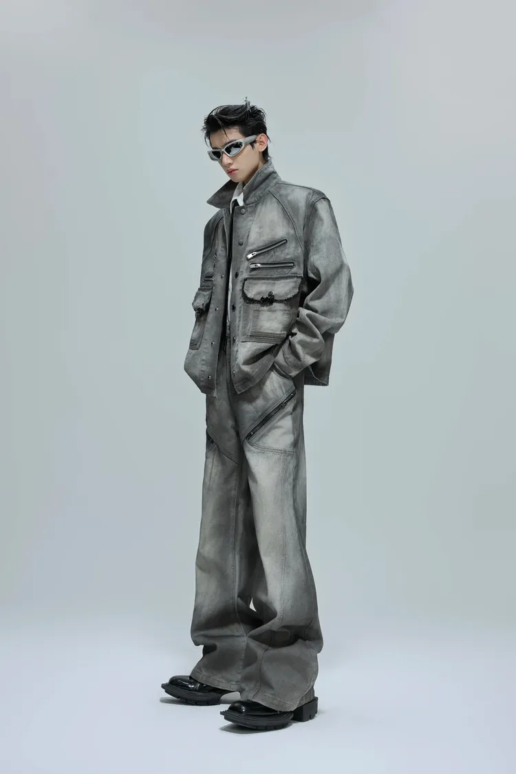 ARGUE 重工復古 廓形 牛仔外套 微喇叭 牛仔褲 套裝(水泥灰)