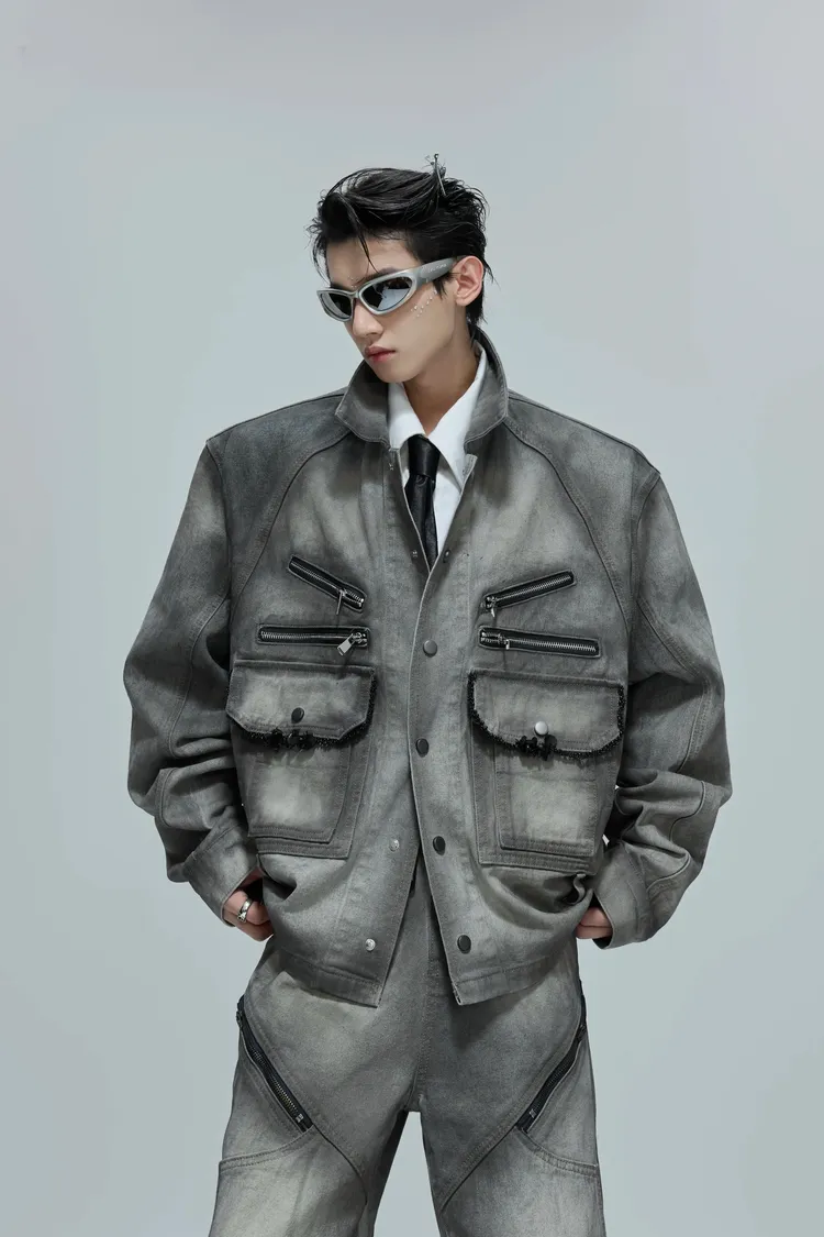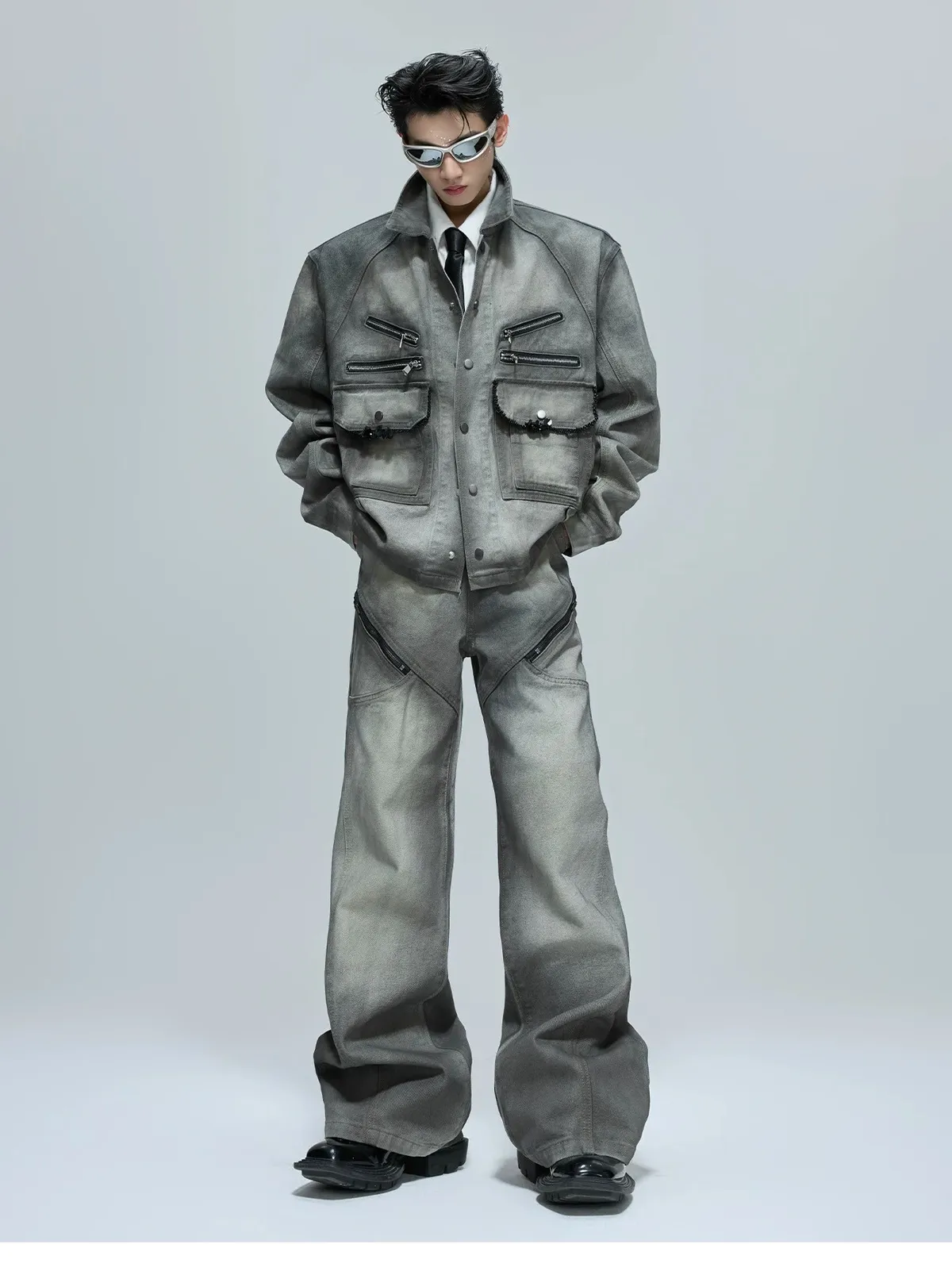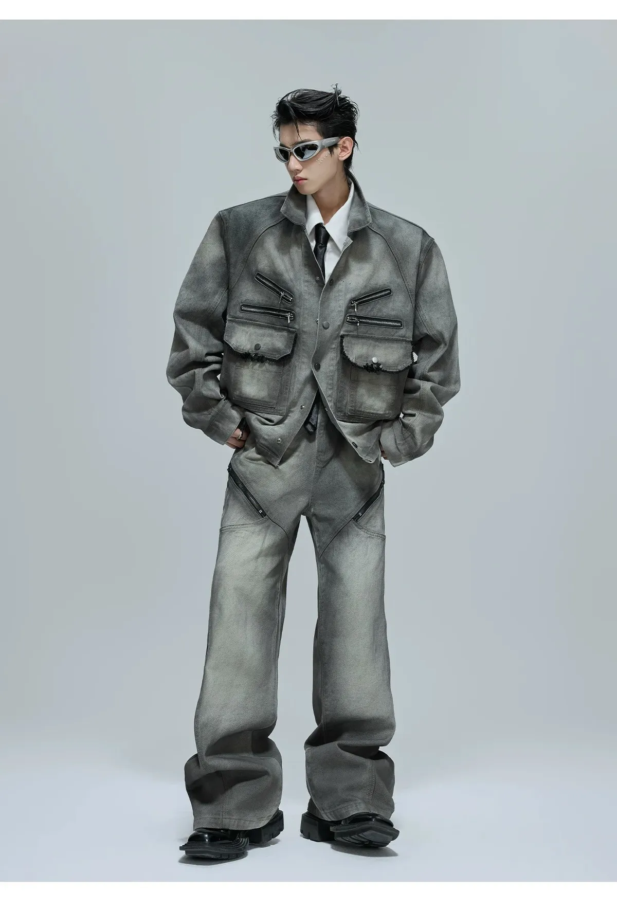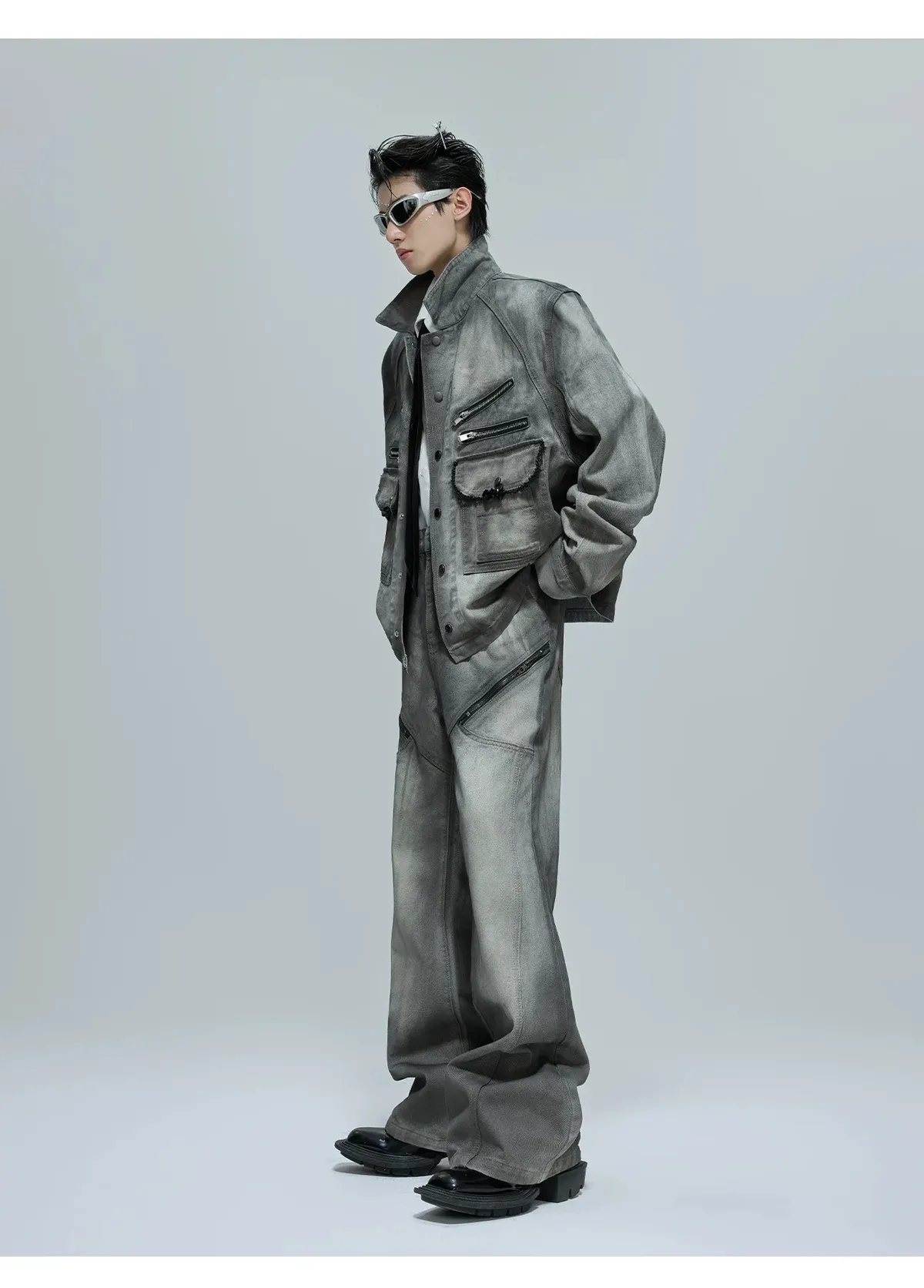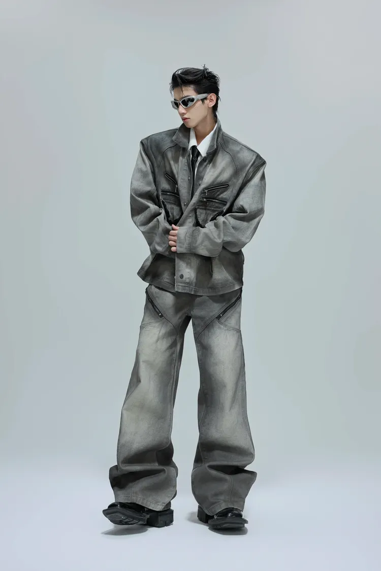 ARGUE 重工復古 廓形 牛仔外套 微喇叭 牛仔褲 套裝(水泥灰)