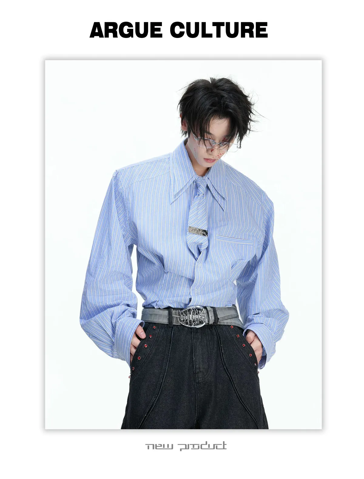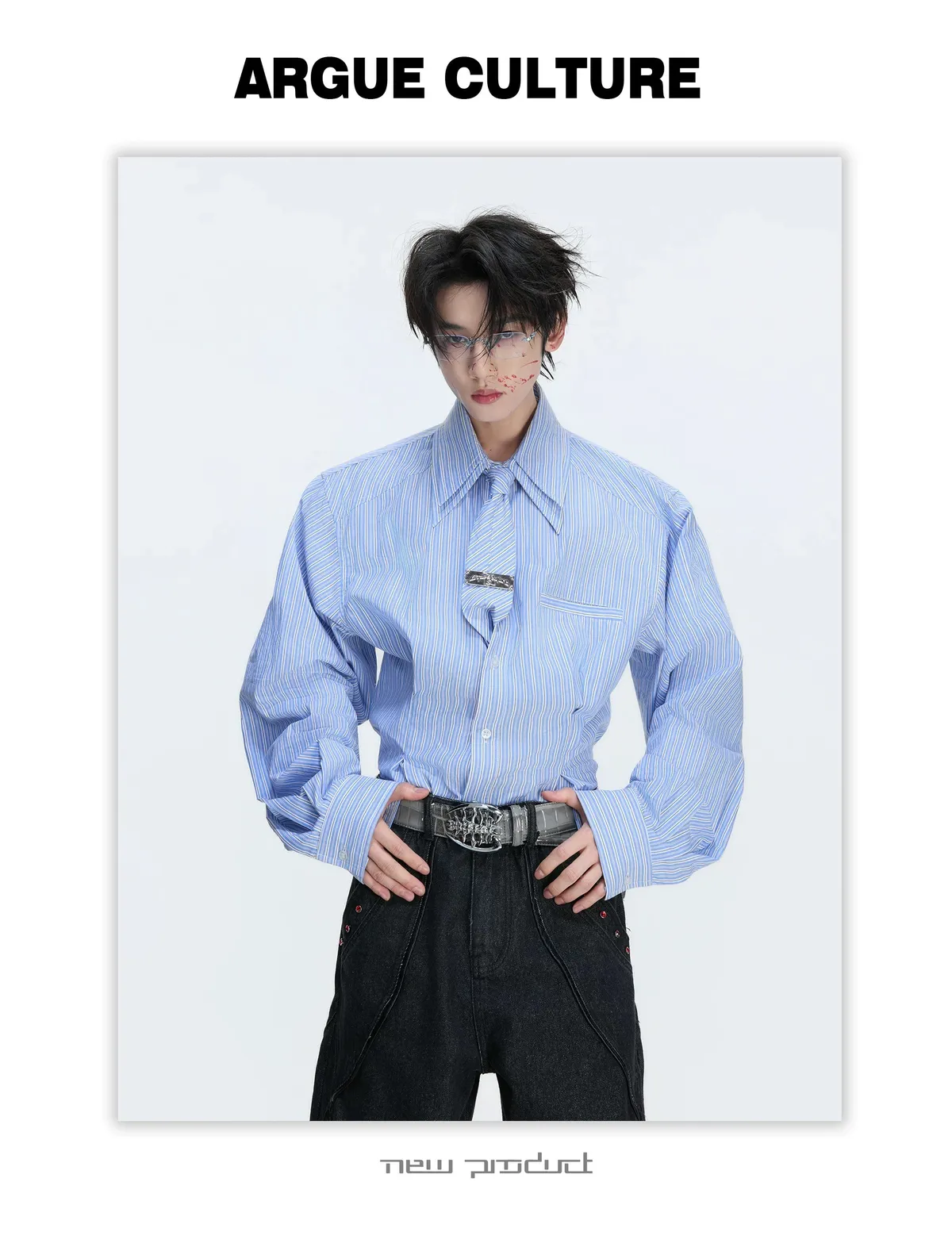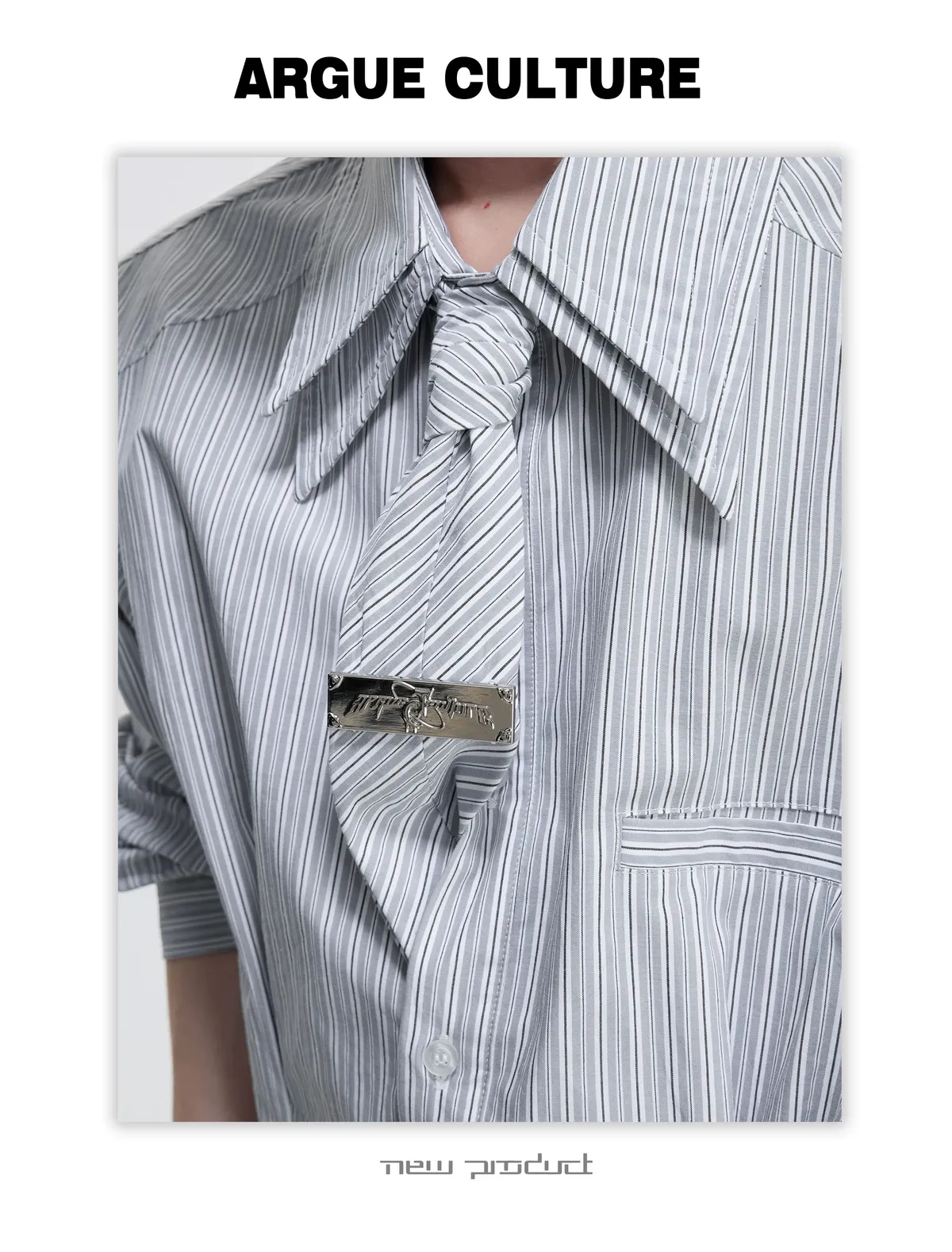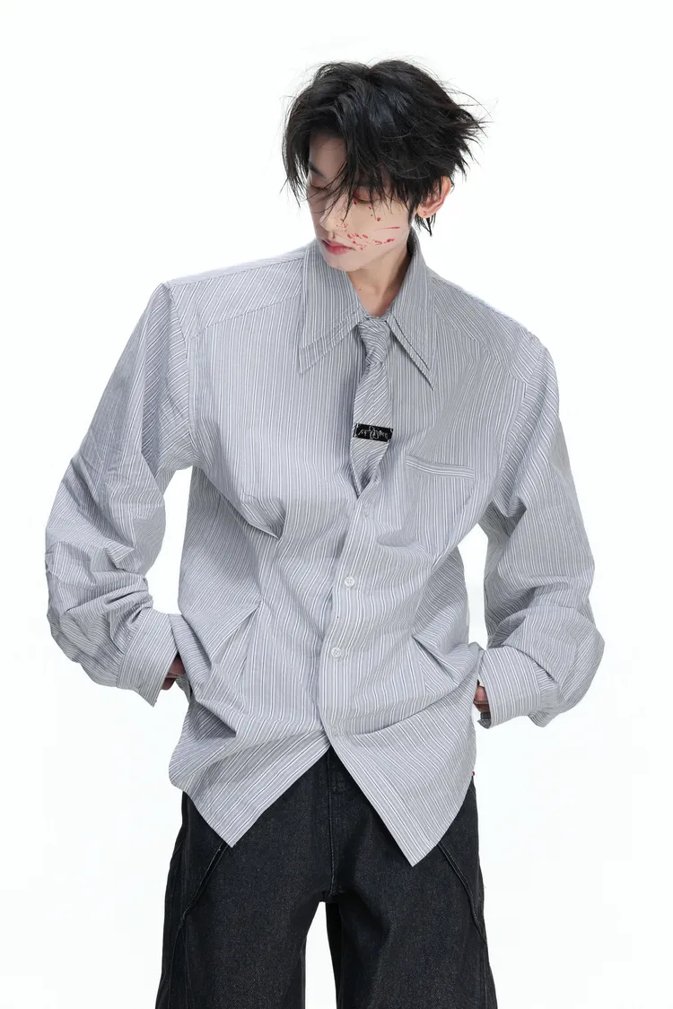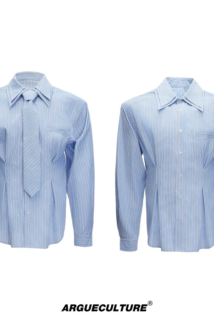 [LAX STUDIO] ARGUE 條紋收腰 雙層領 襯衫 附贈領帶(灰/藍)