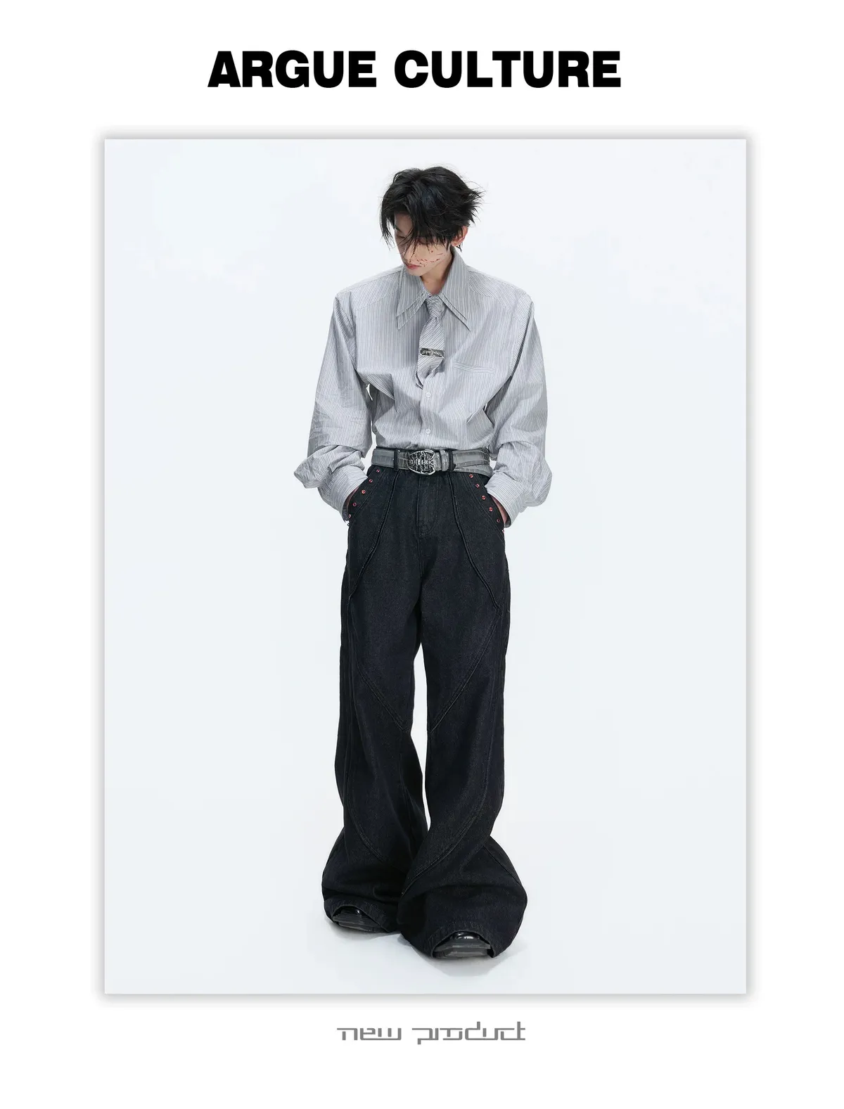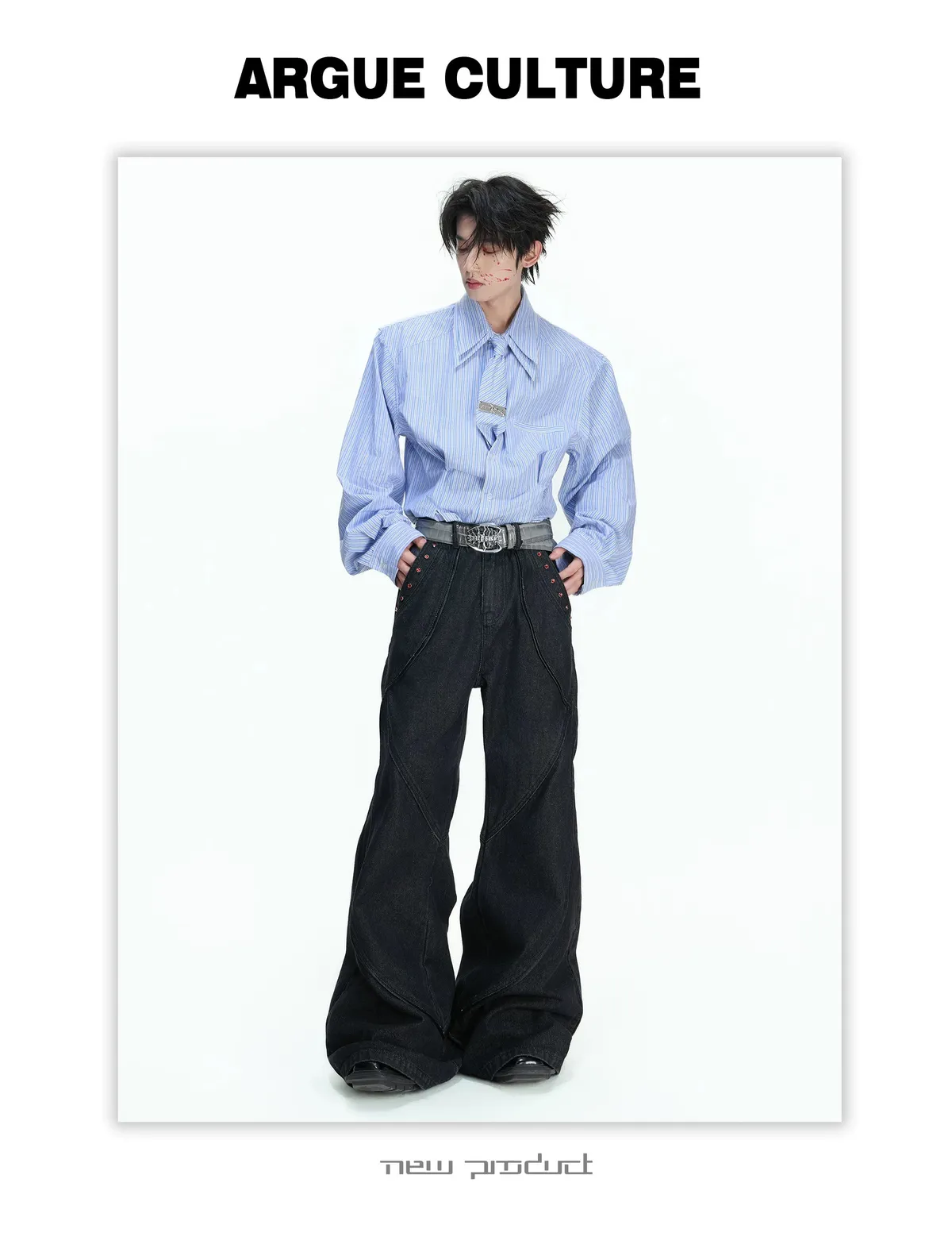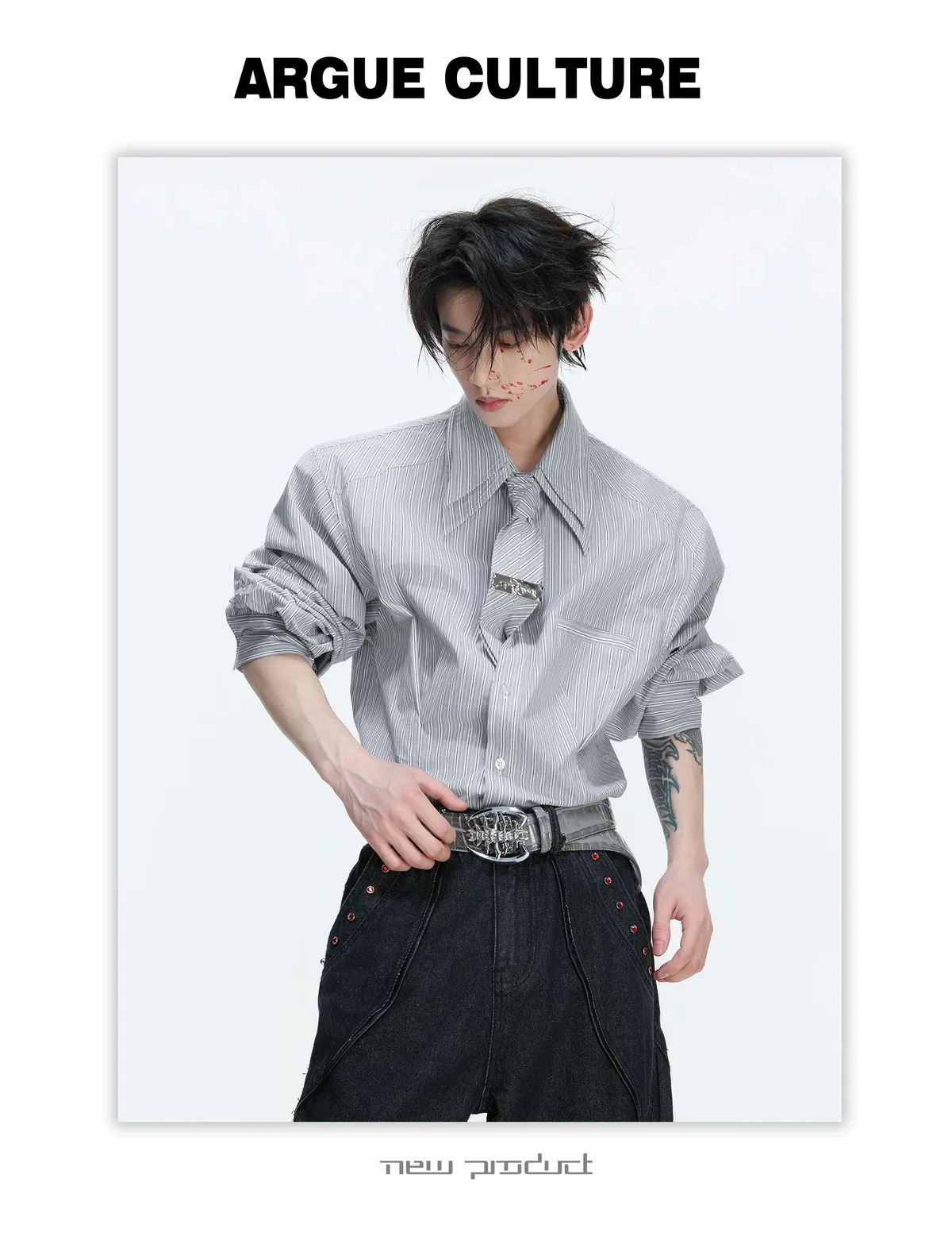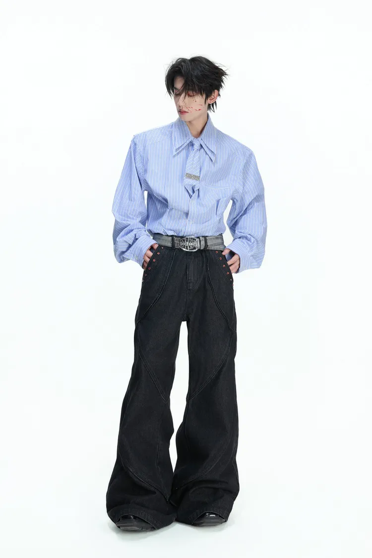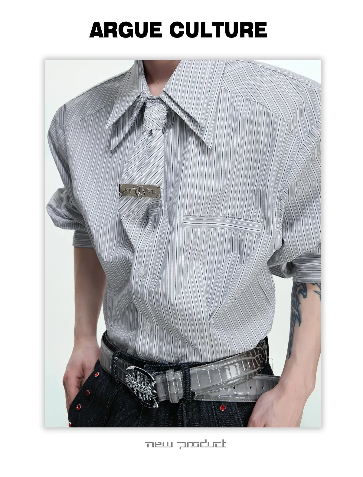 [LAX STUDIO] ARGUE 條紋收腰 雙層領 襯衫 附贈領帶(灰/藍)