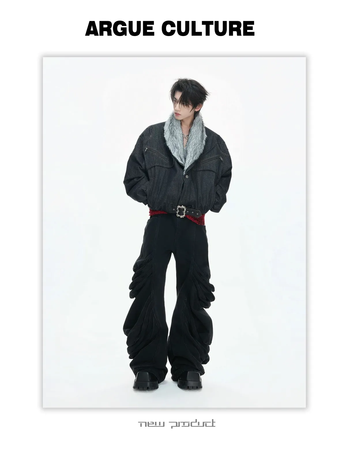 ARGUE 上蠟 消防釦 分割垂墜 皮褲(黑色)