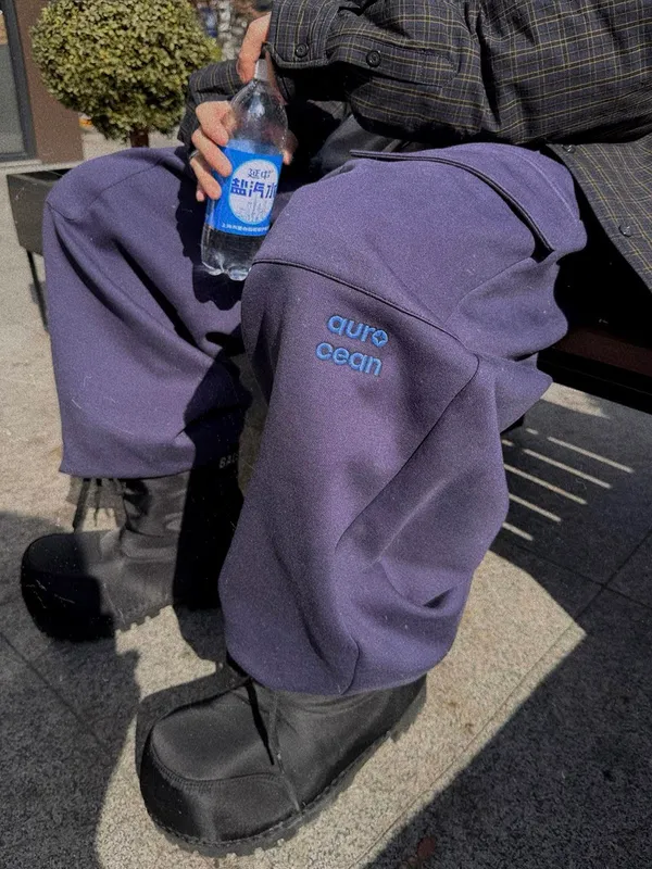 AUROCEAN 定染 撞色刺繡 加絨 棉褲(灰紫)