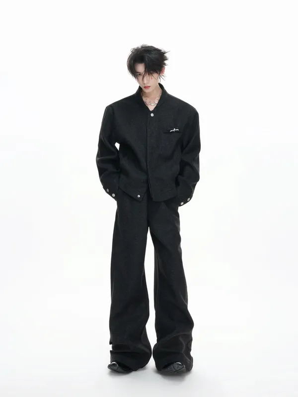 ARGUE 時裝優雅 毛呢 寬短外套 長褲 套裝(黑/灰)