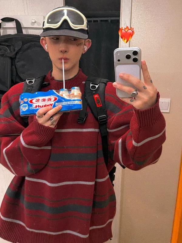 AUROCEAN 奶帥少年 破壞 撞色條紋 毛衣(紅)