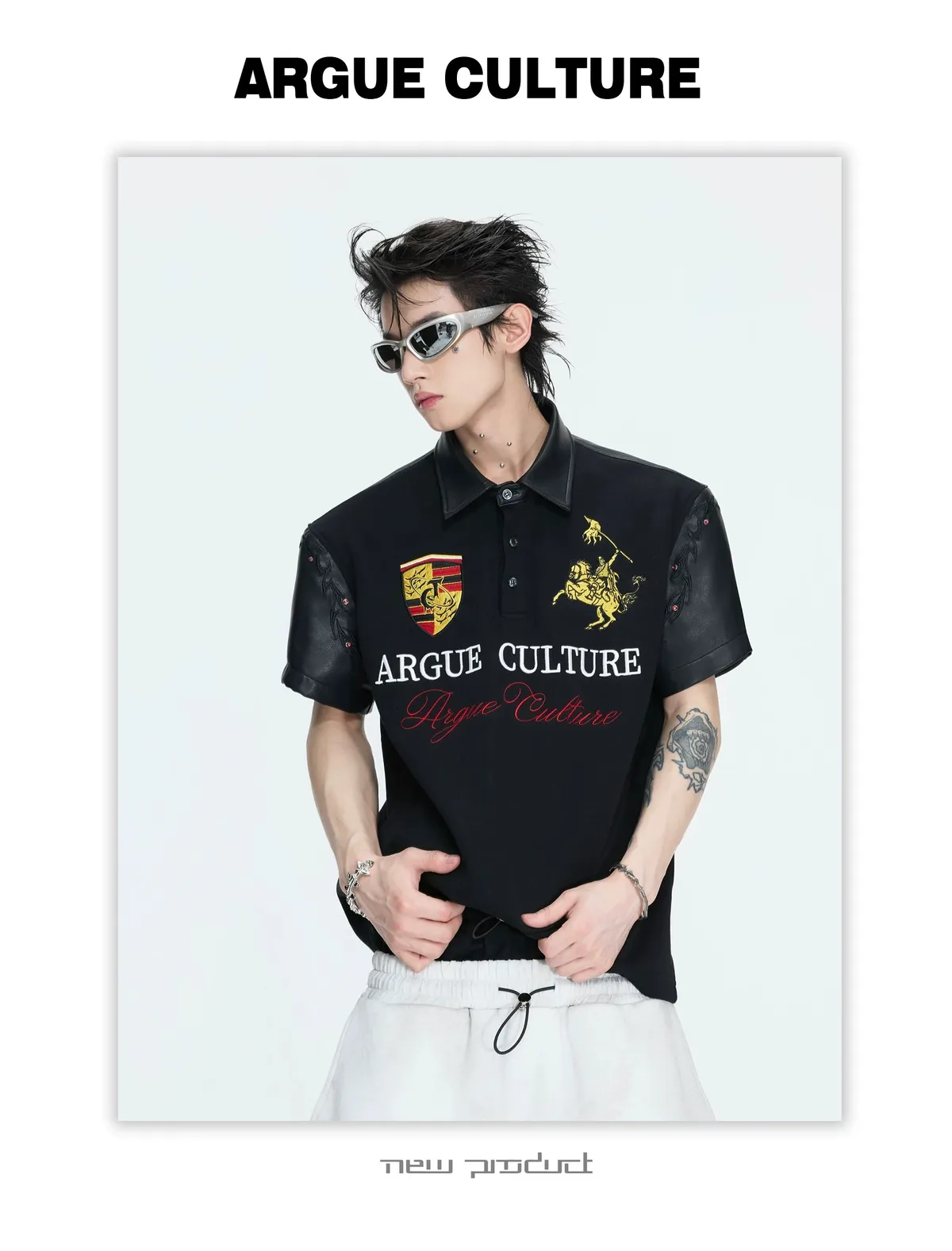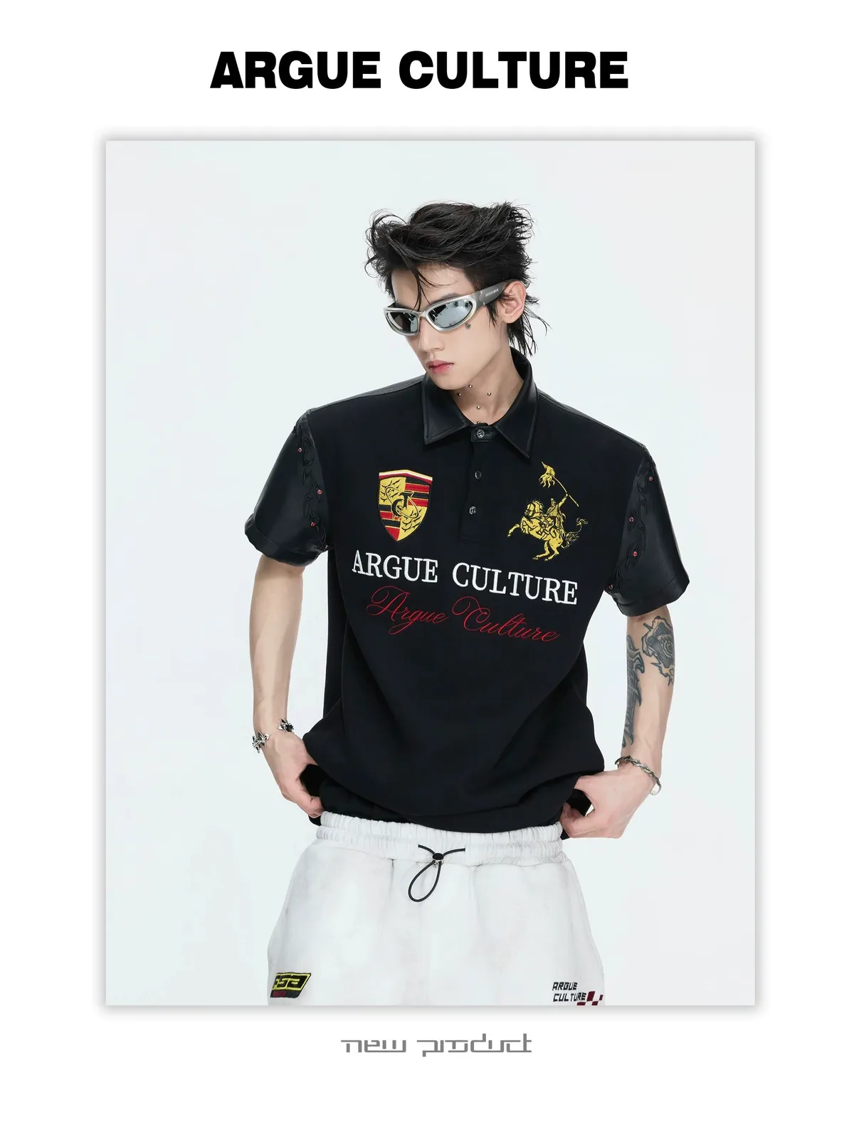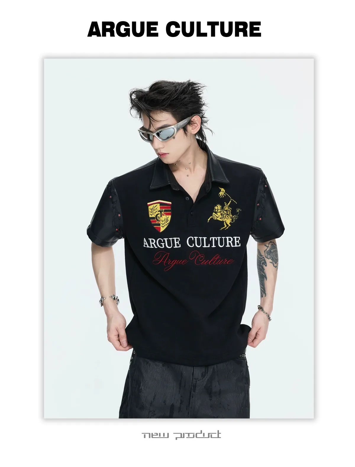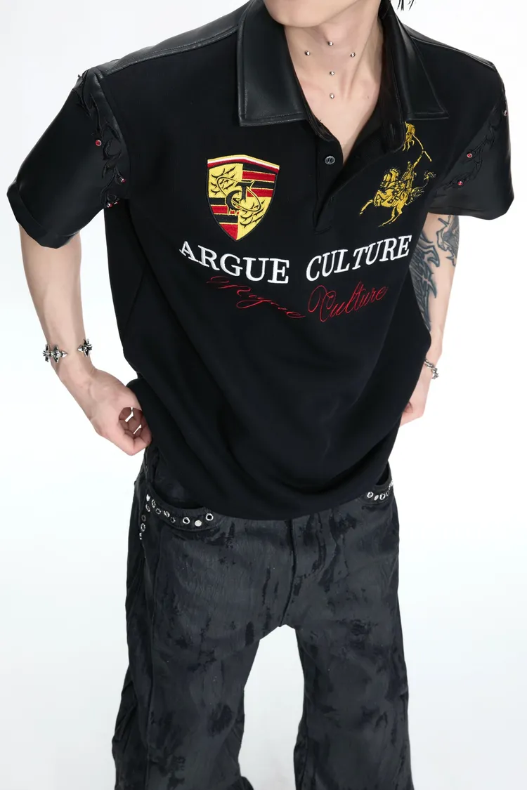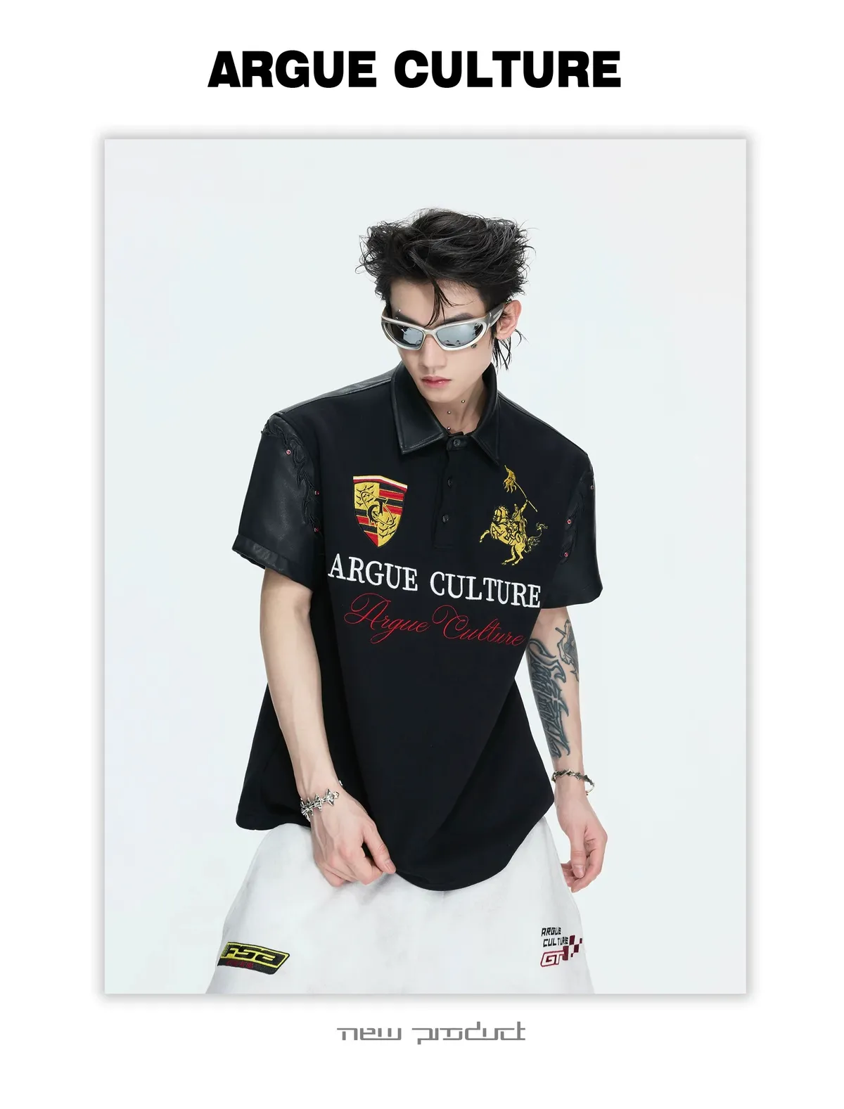 ARGUE 皮革拼接 賽車刺繡 POLO(黑色)