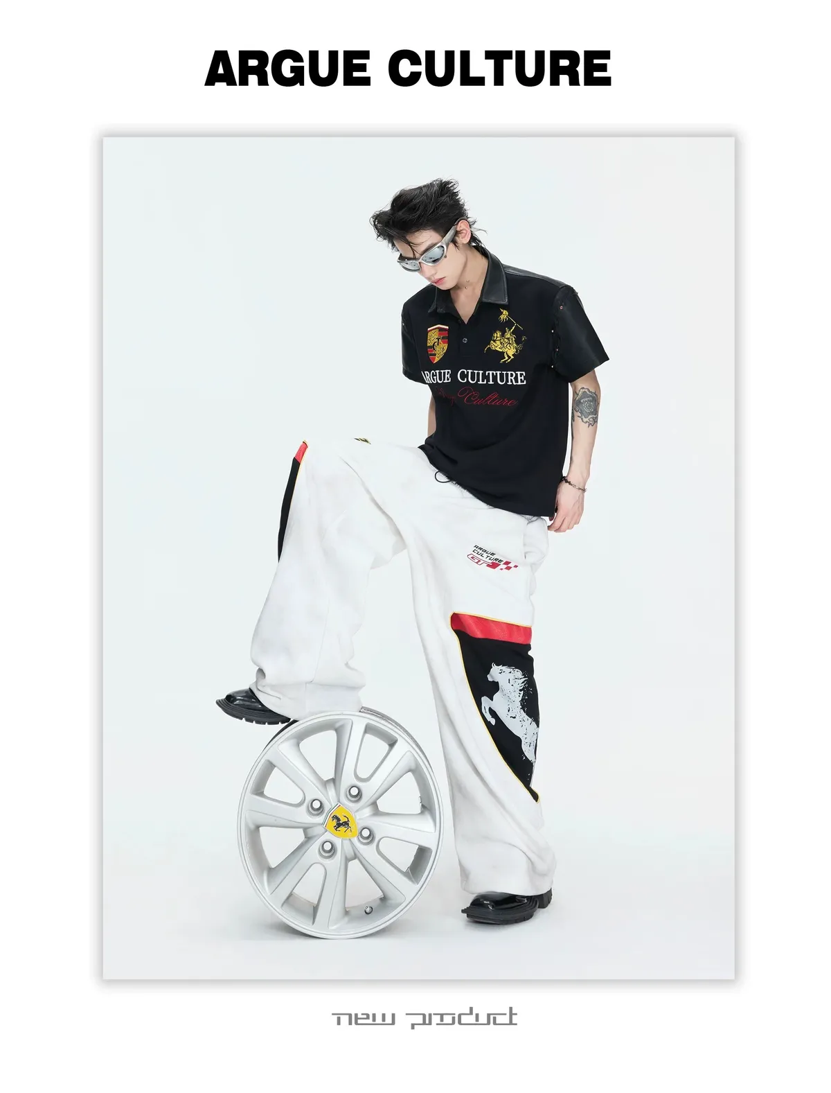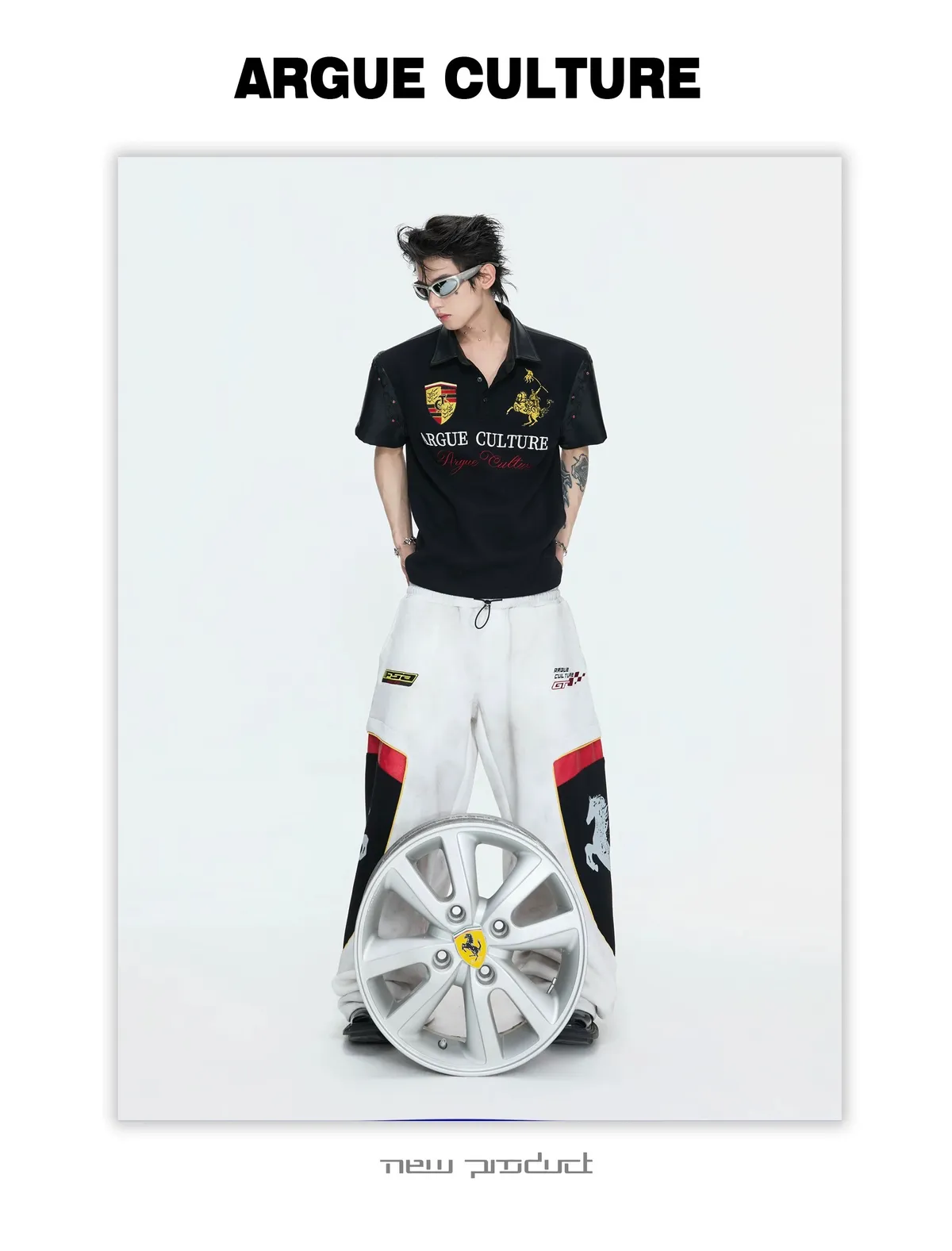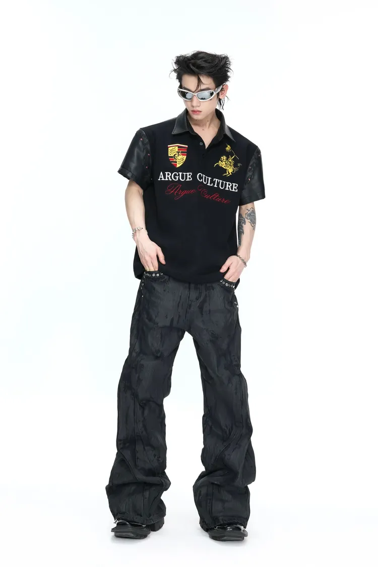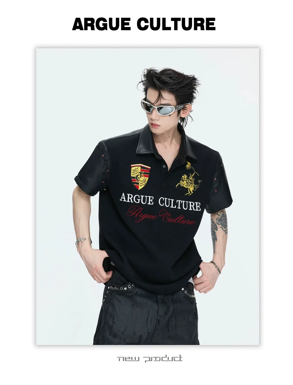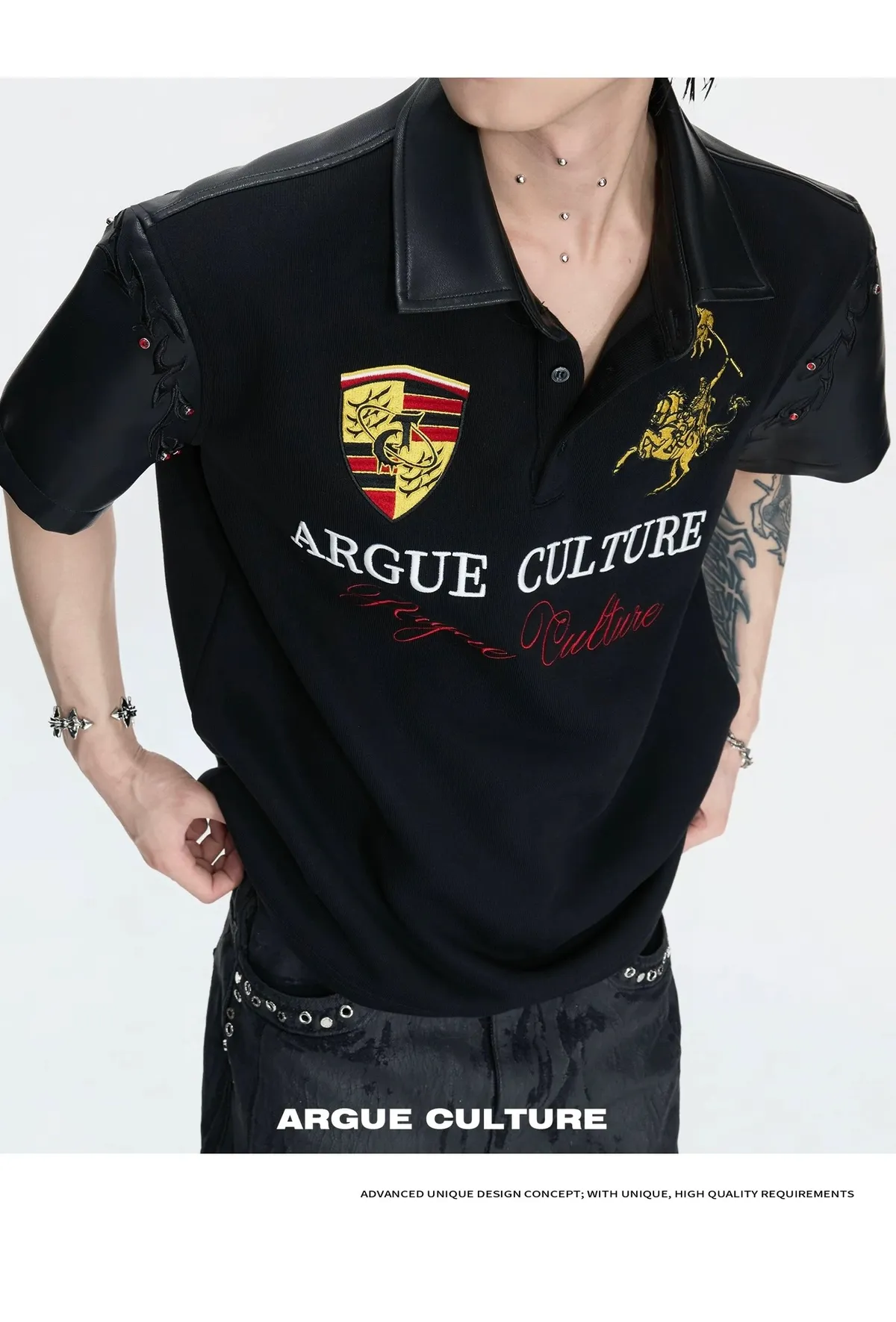 ARGUE 皮革拼接 賽車刺繡 POLO(黑色)