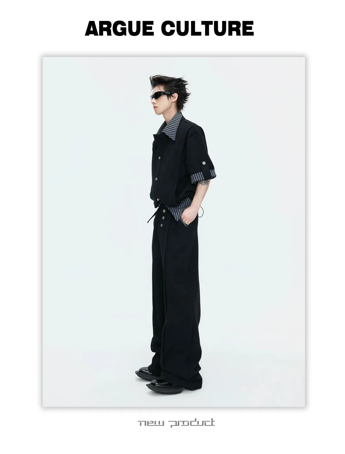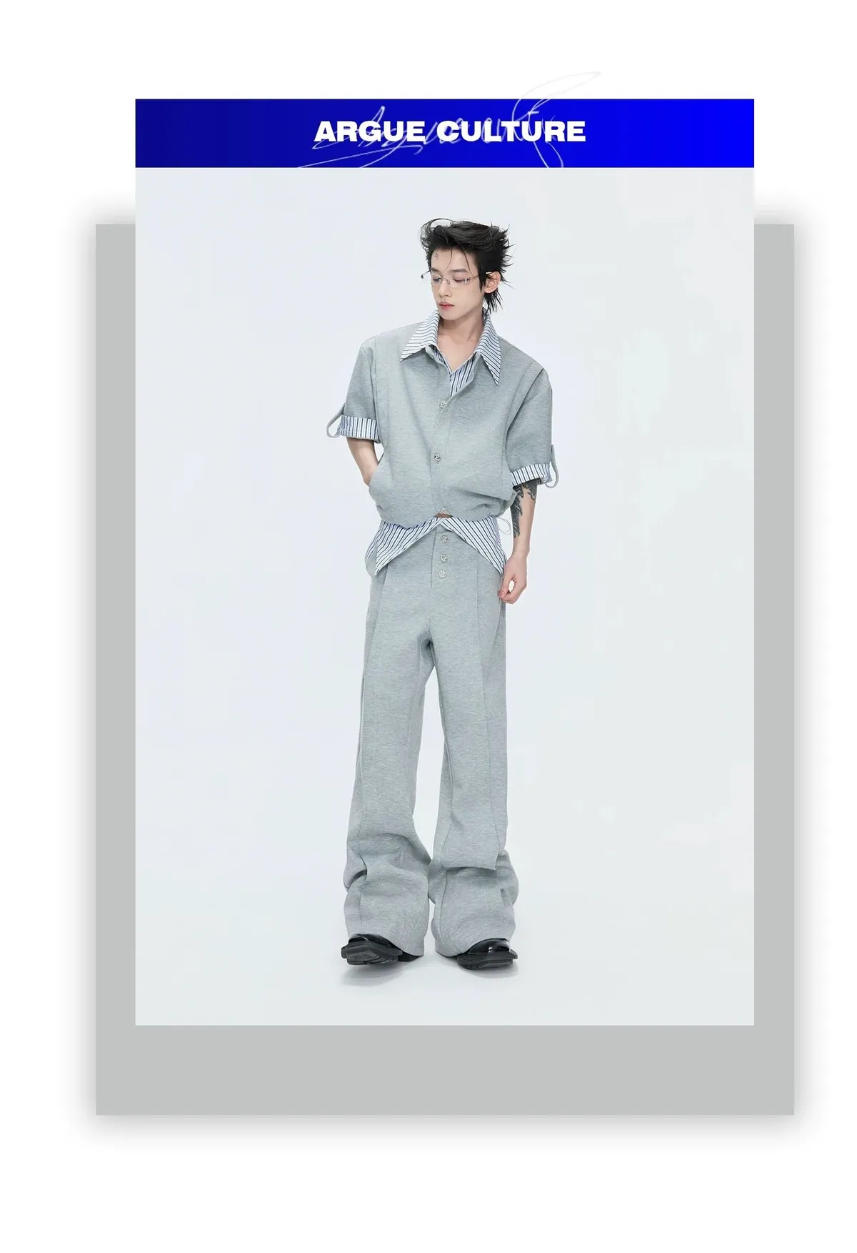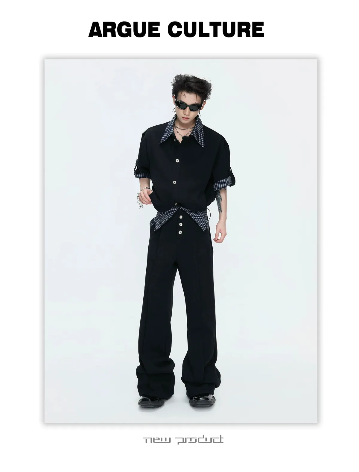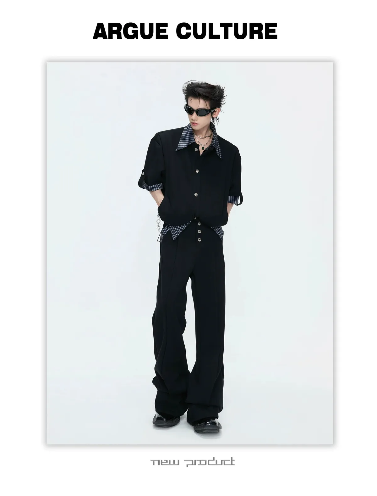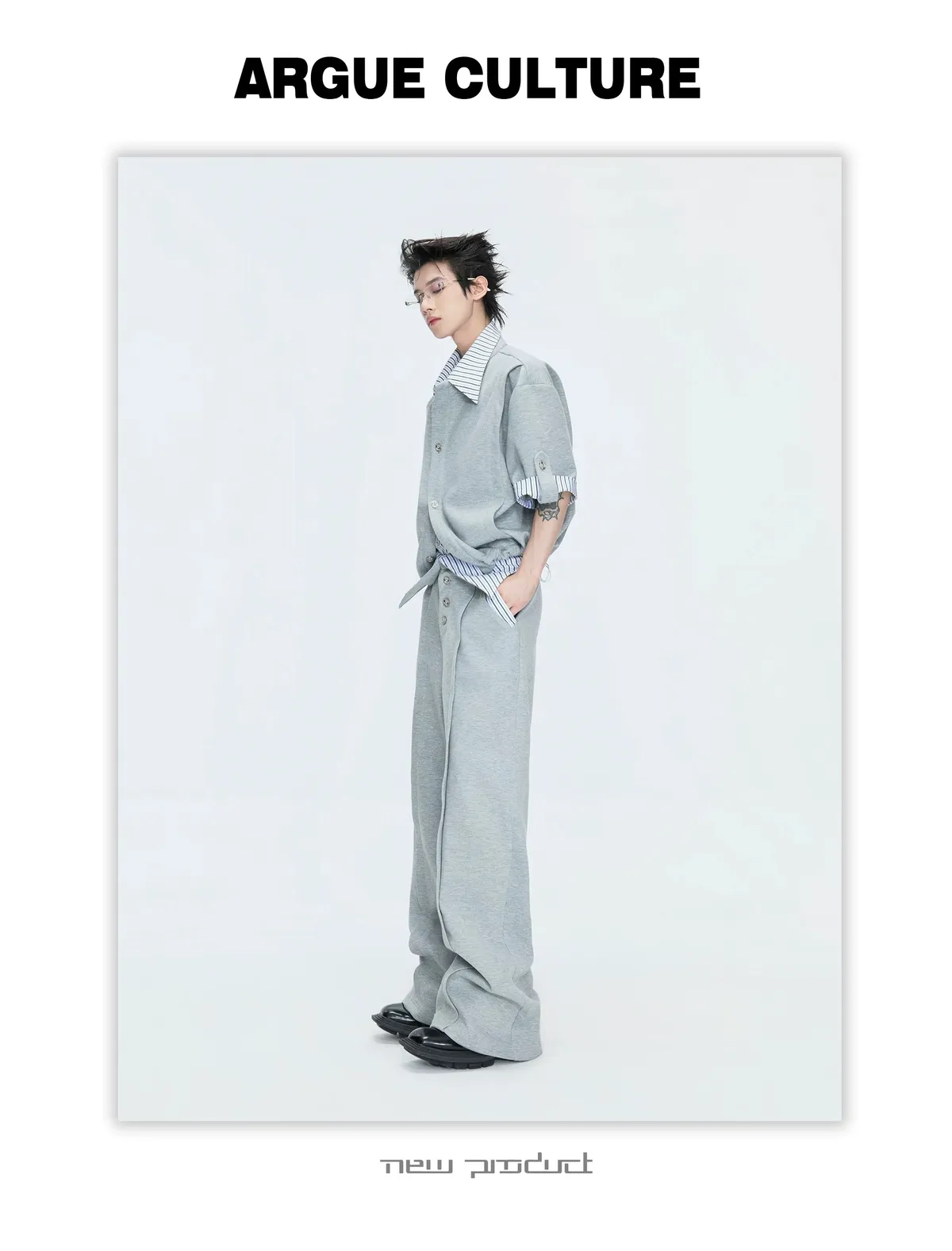 ARGUE 條紋假兩件 涼感套裝 襯衫 棉褲(黑/灰)