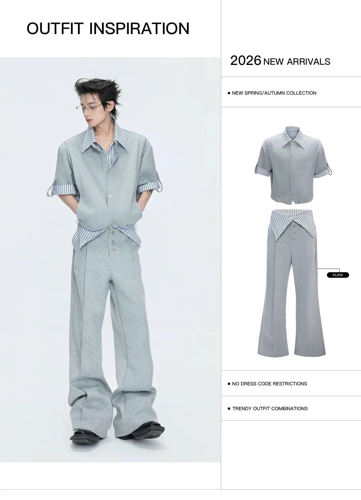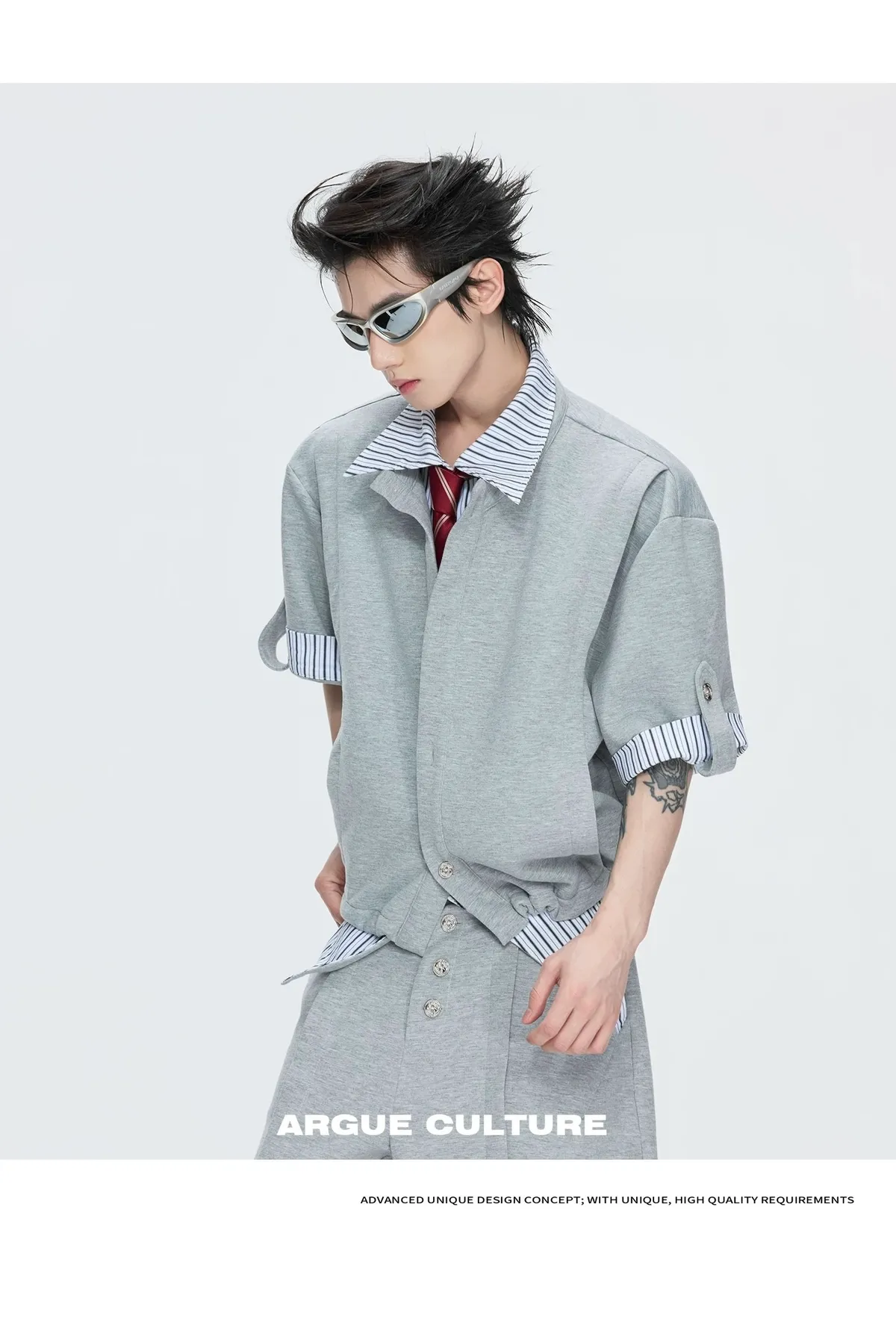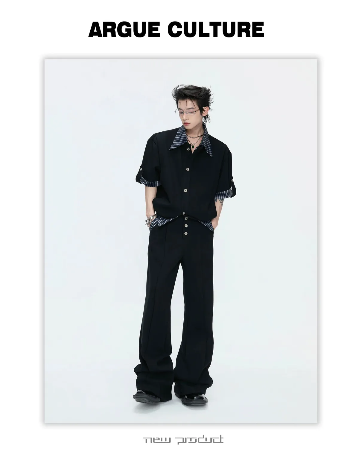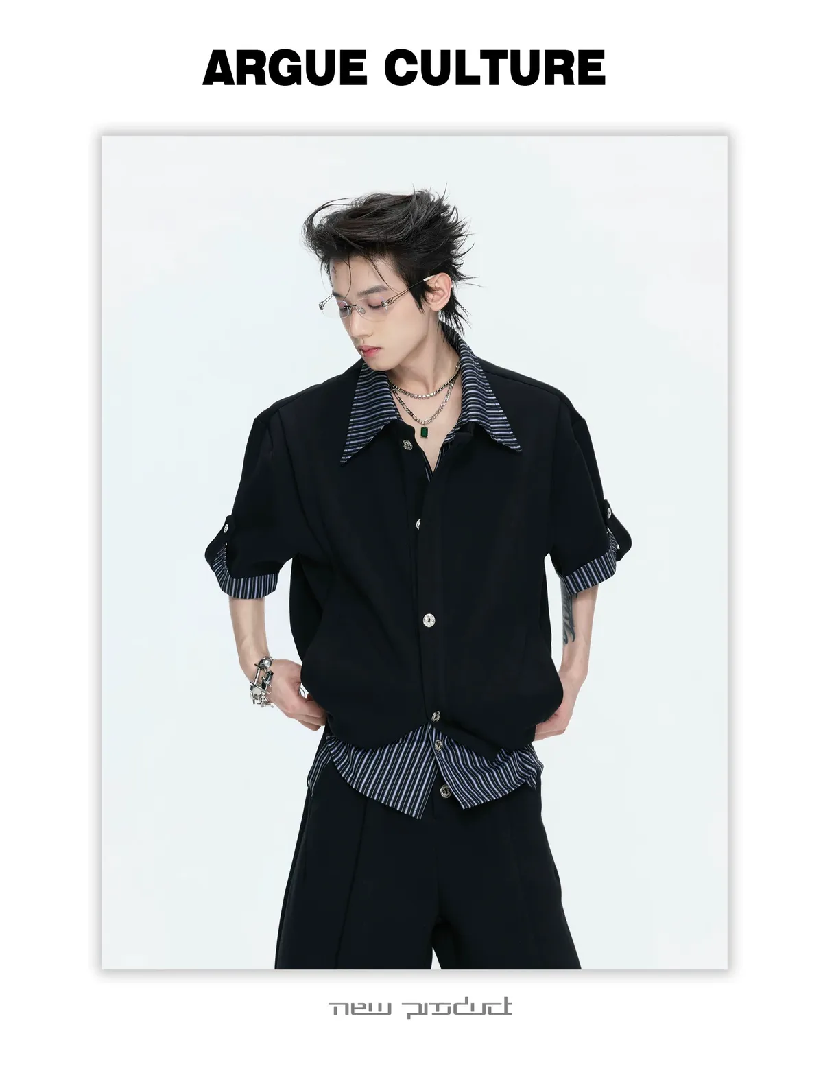 ARGUE 條紋假兩件 涼感套裝 襯衫 棉褲(黑/灰)