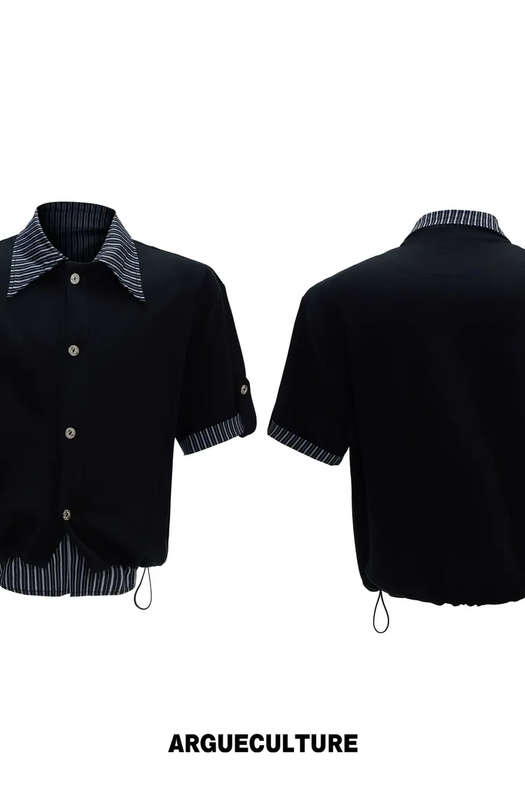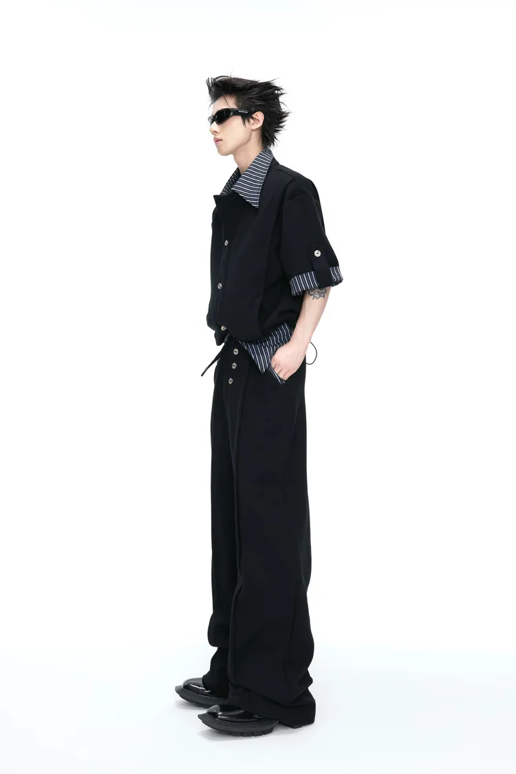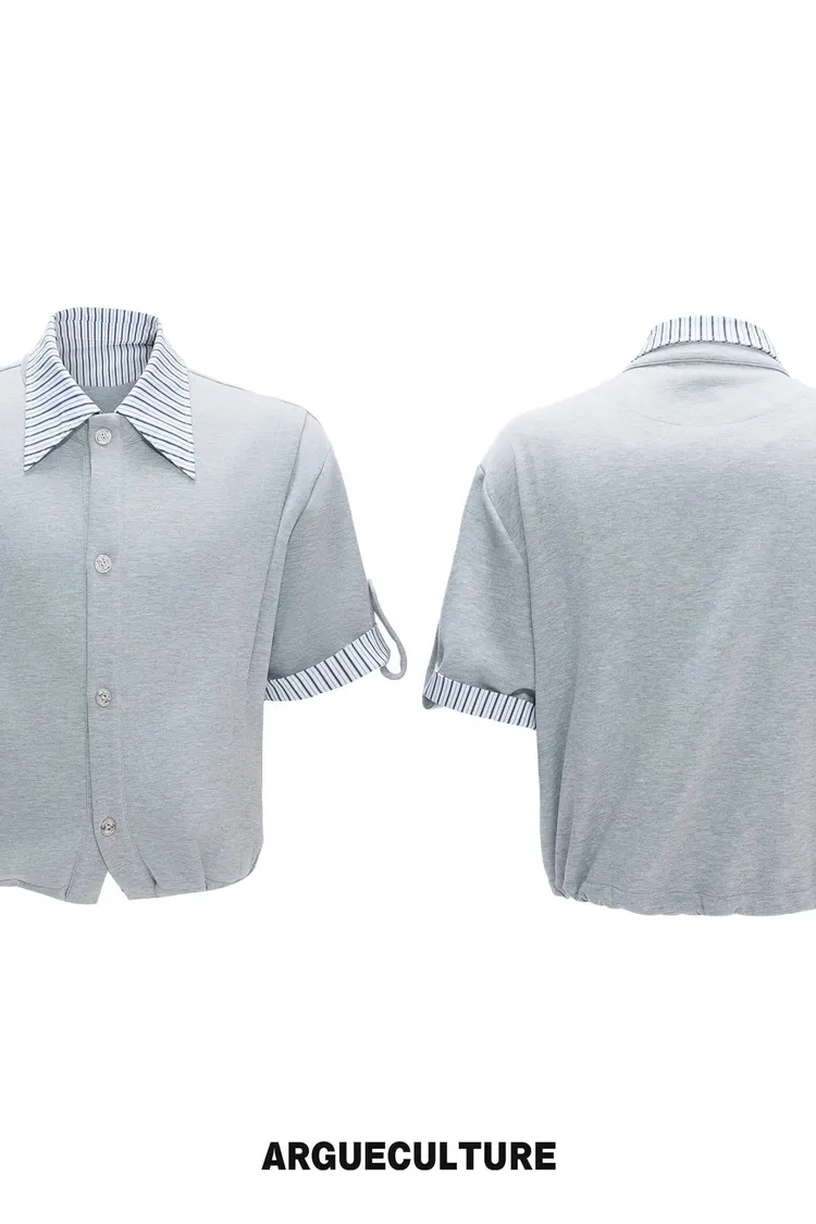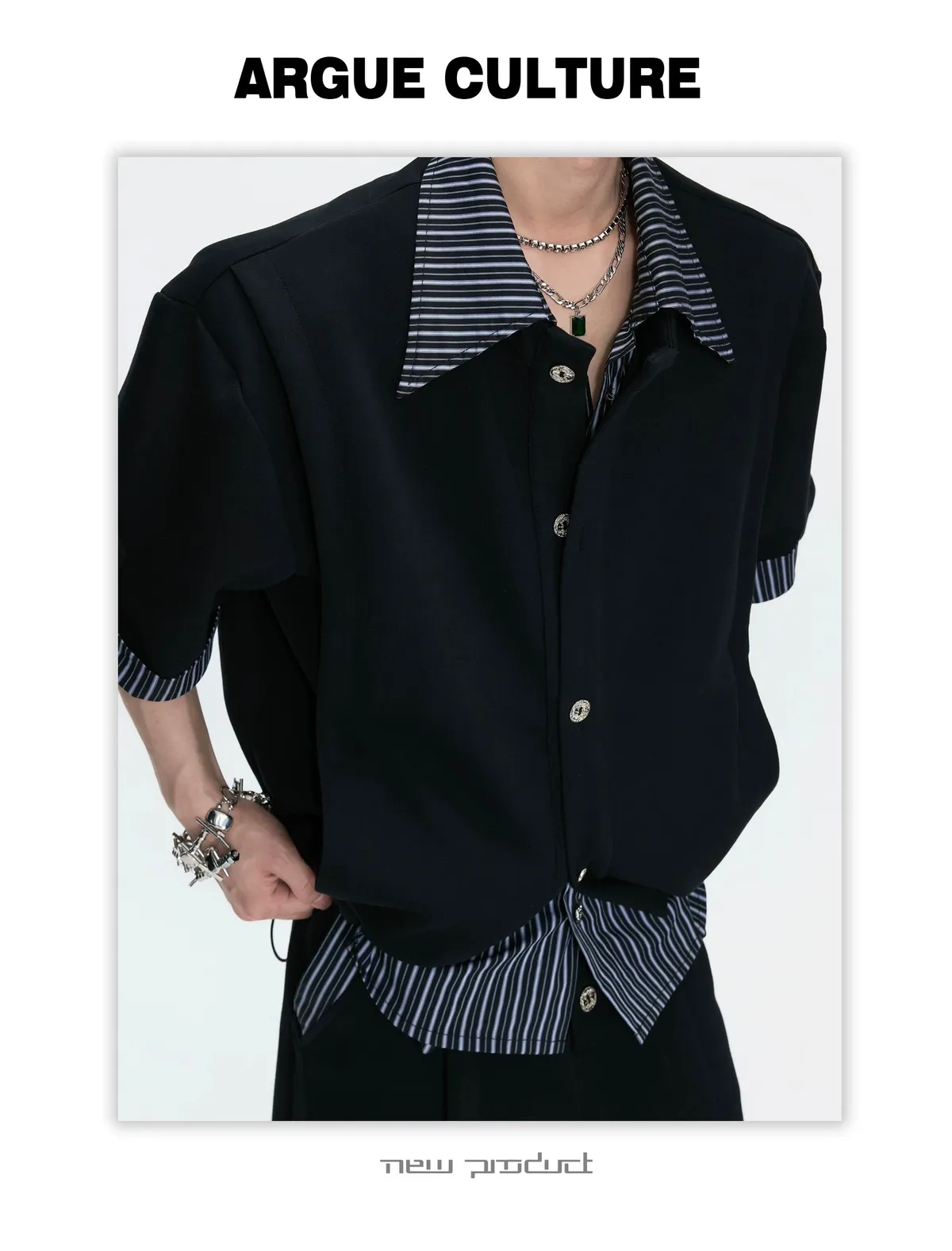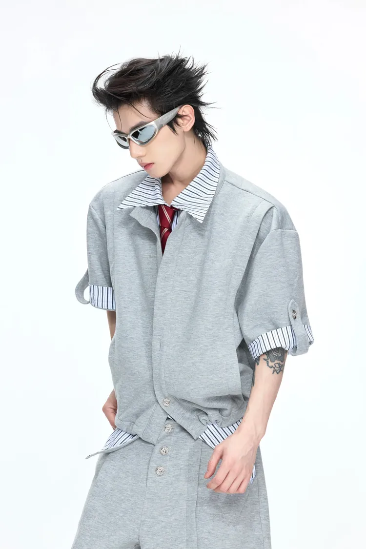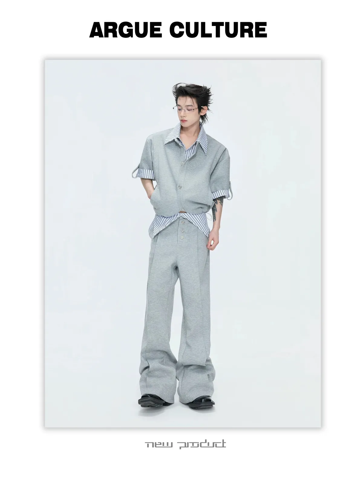 ARGUE 條紋假兩件 涼感套裝 襯衫 棉褲(黑/灰)