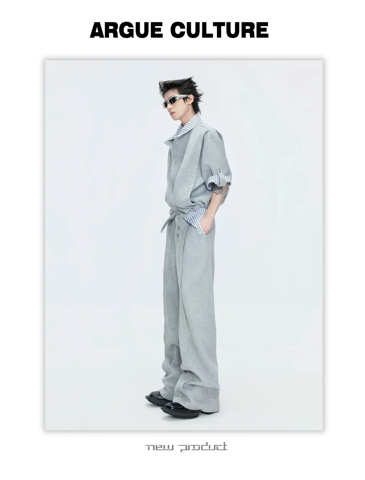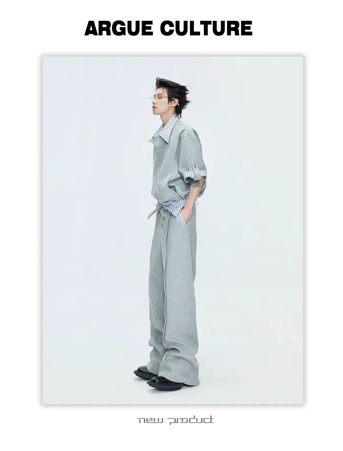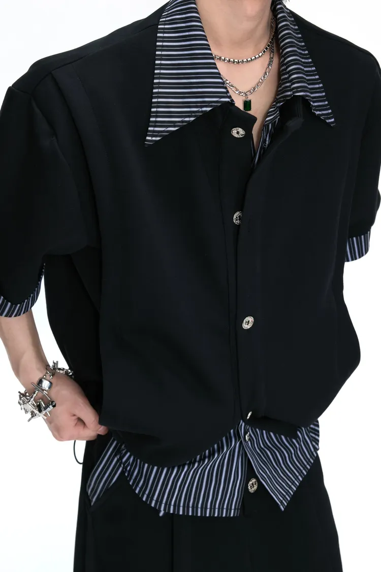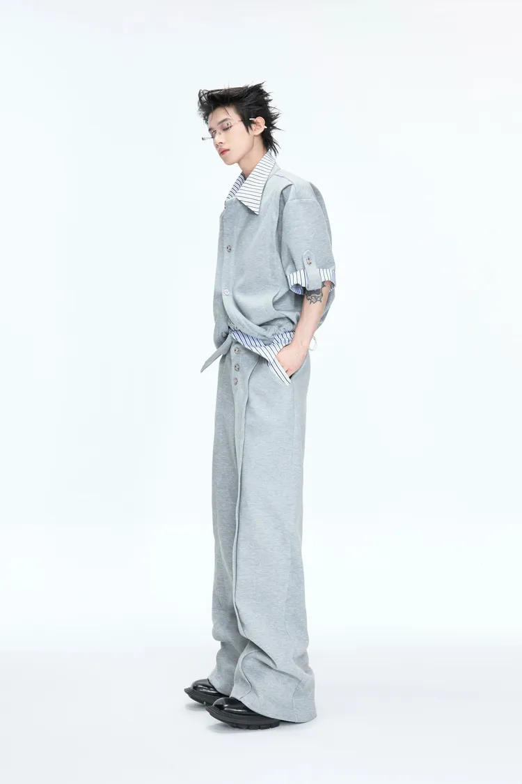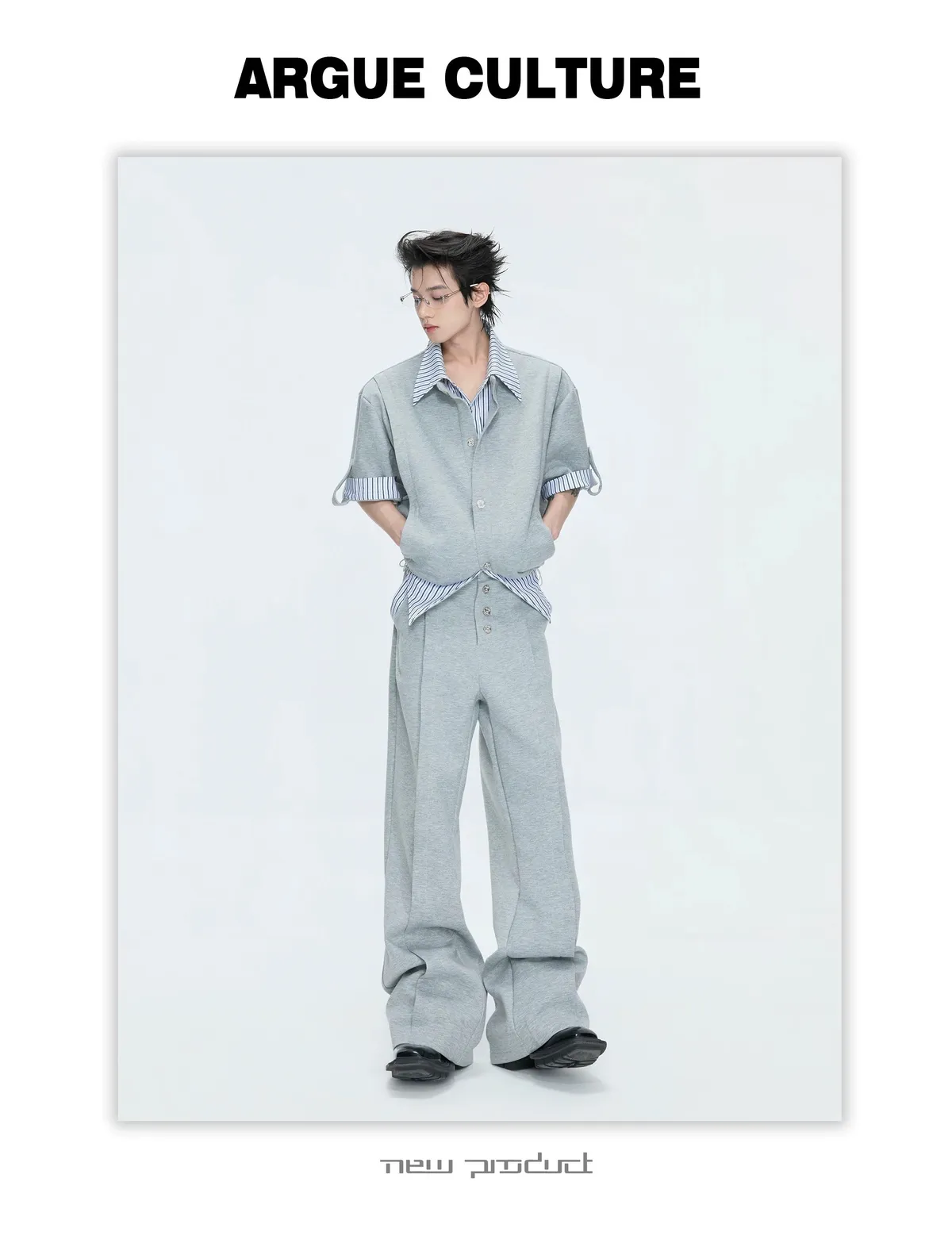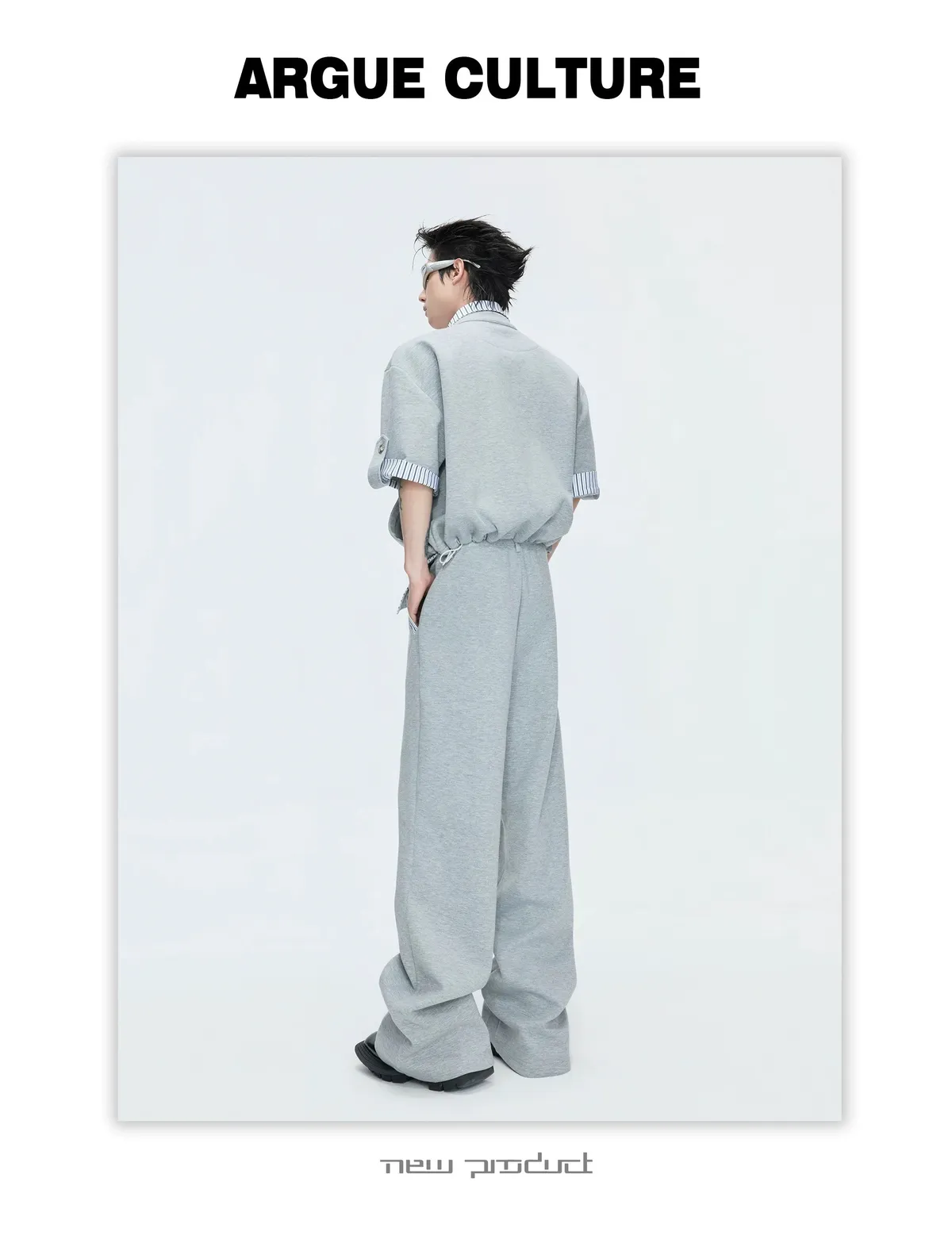 ARGUE 條紋假兩件 涼感套裝 襯衫 棉褲(黑/灰)