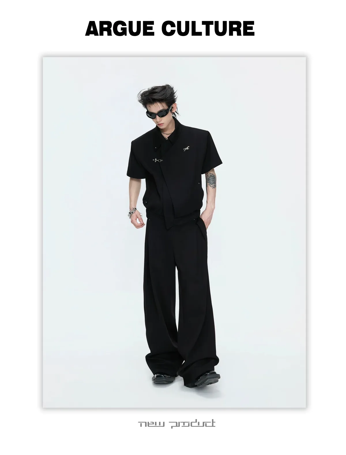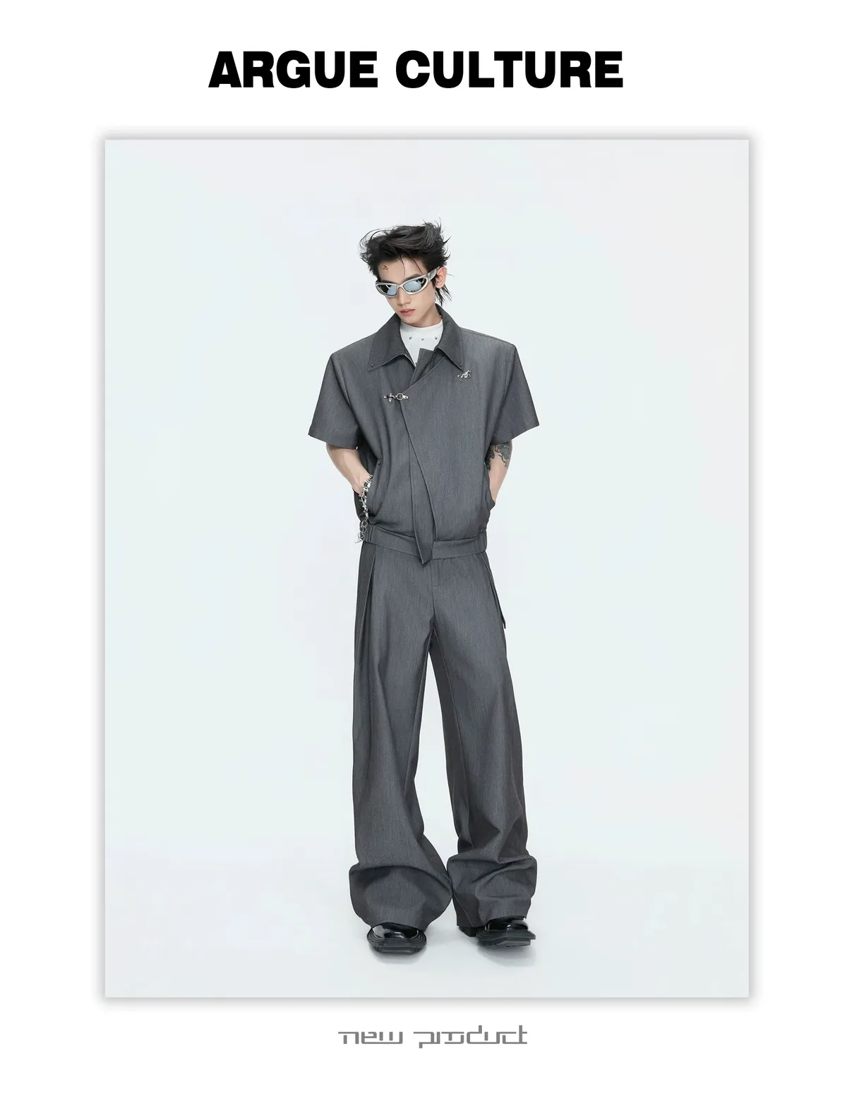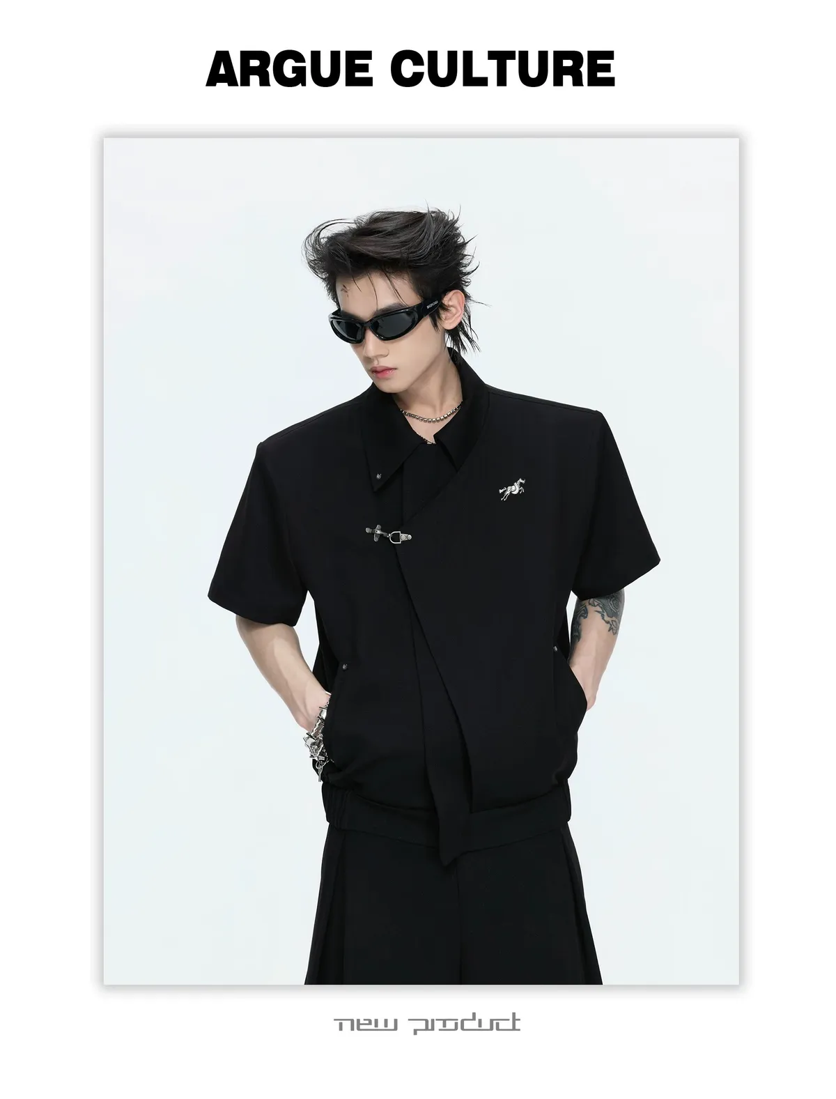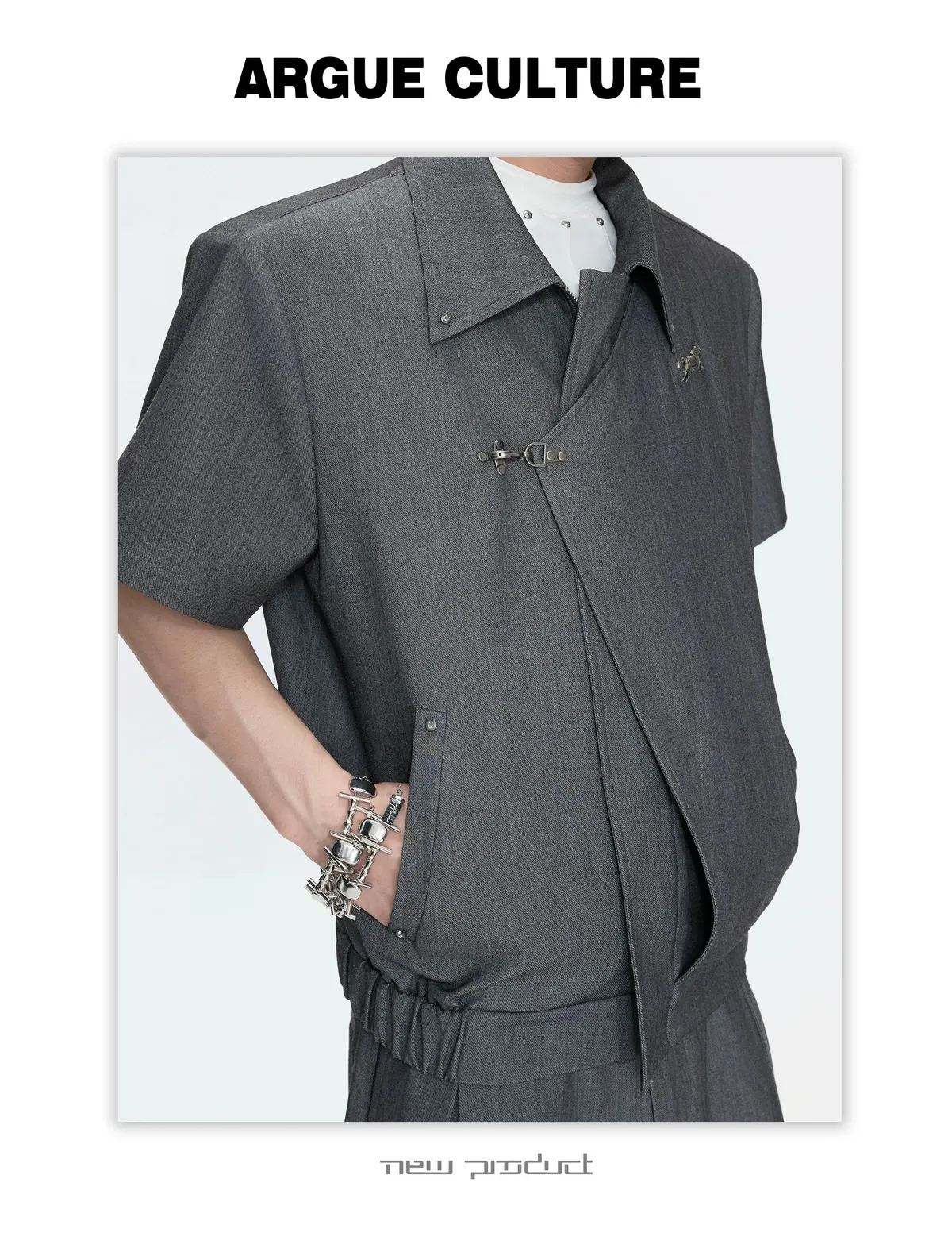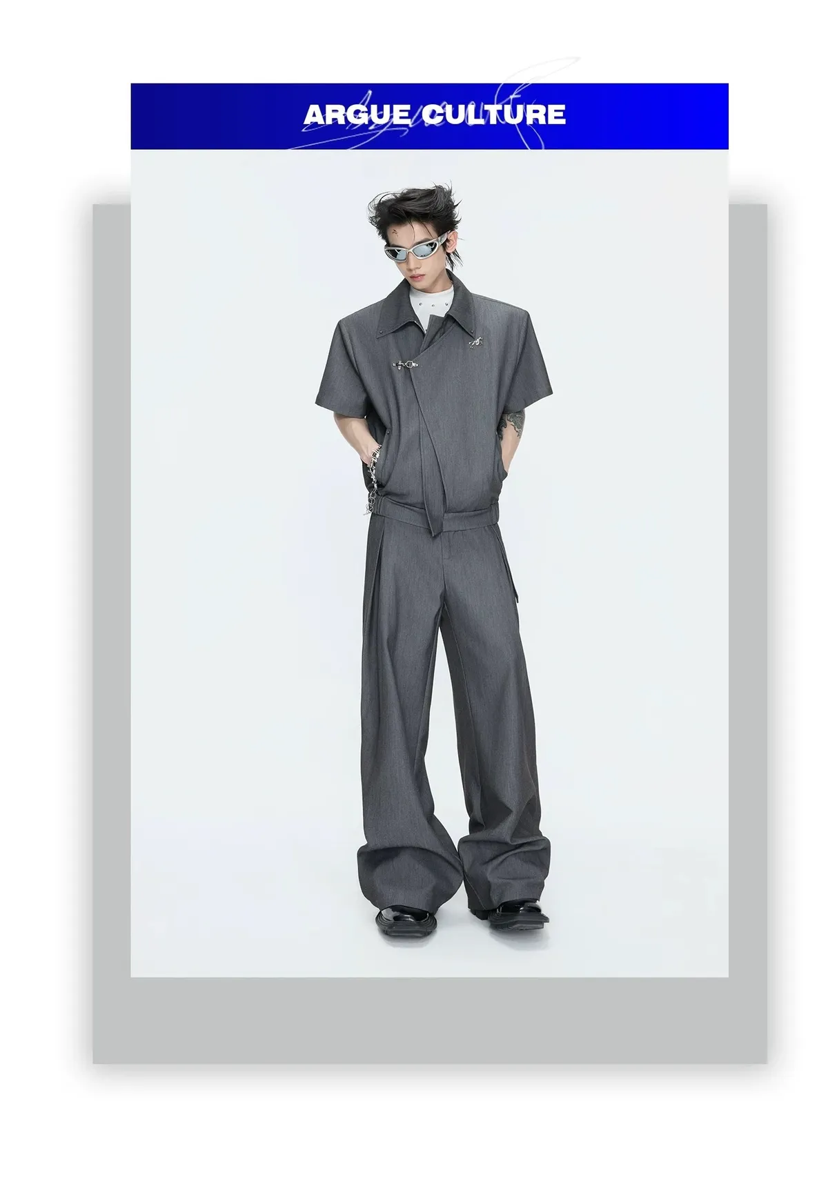 ARGUE 不規則假兩件 金屬標 套裝 BOXY短袖 西裝褲(黑/灰)