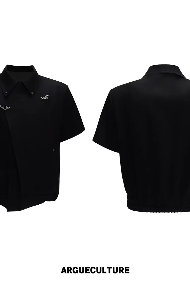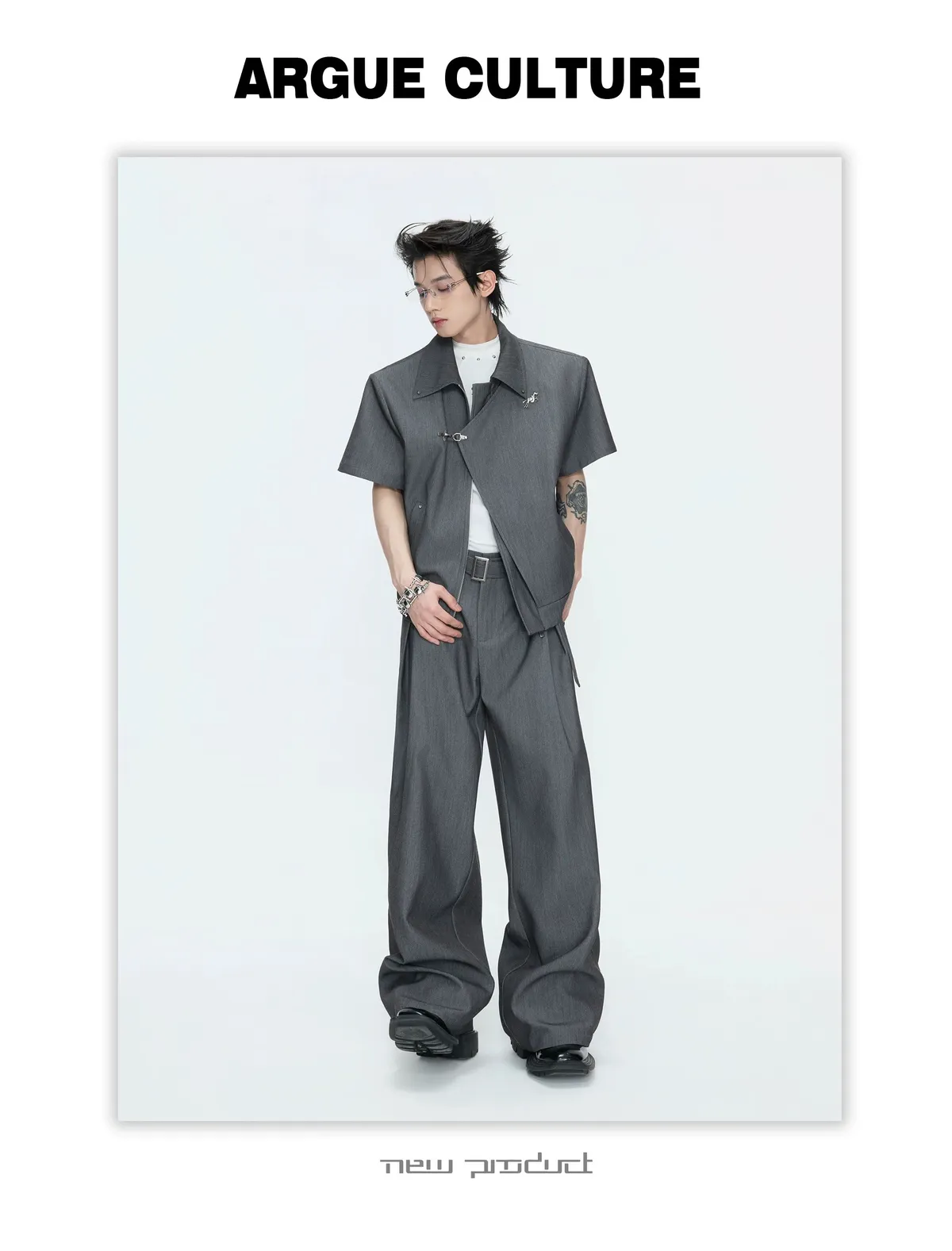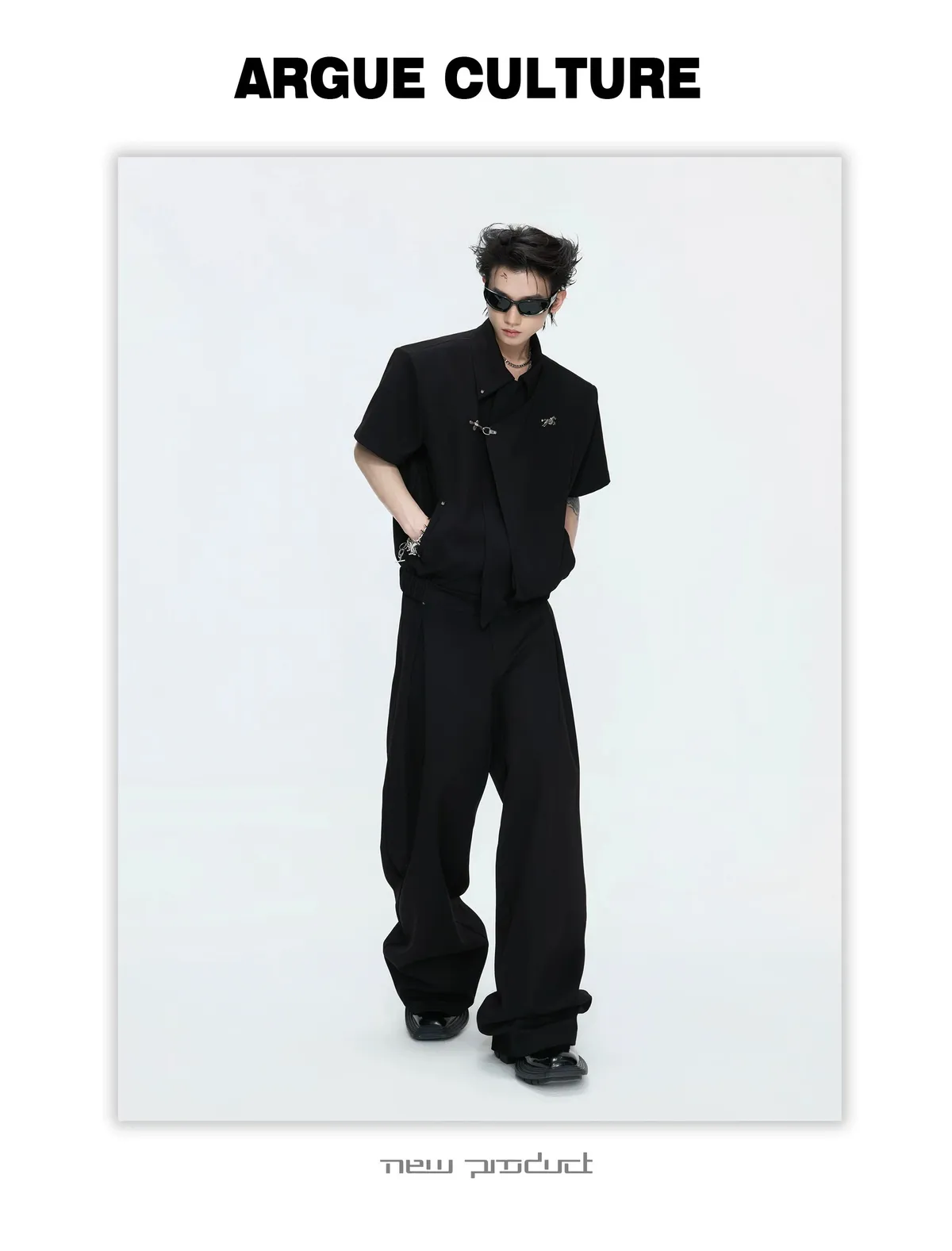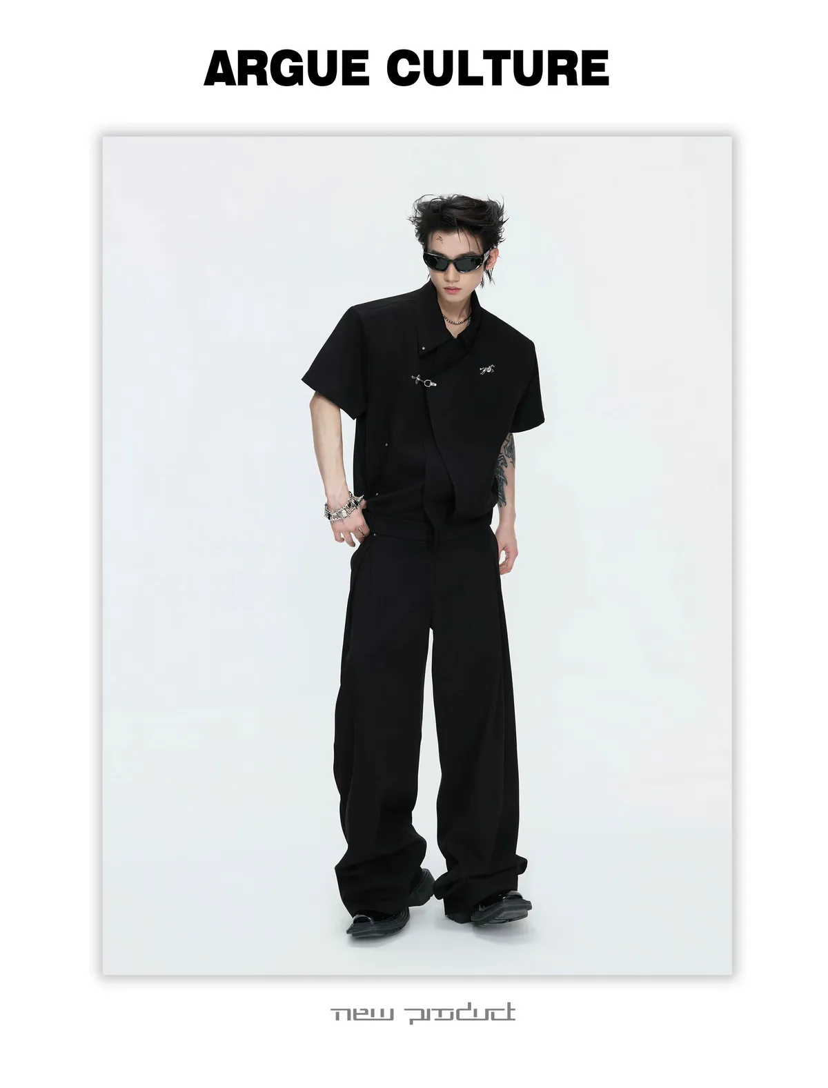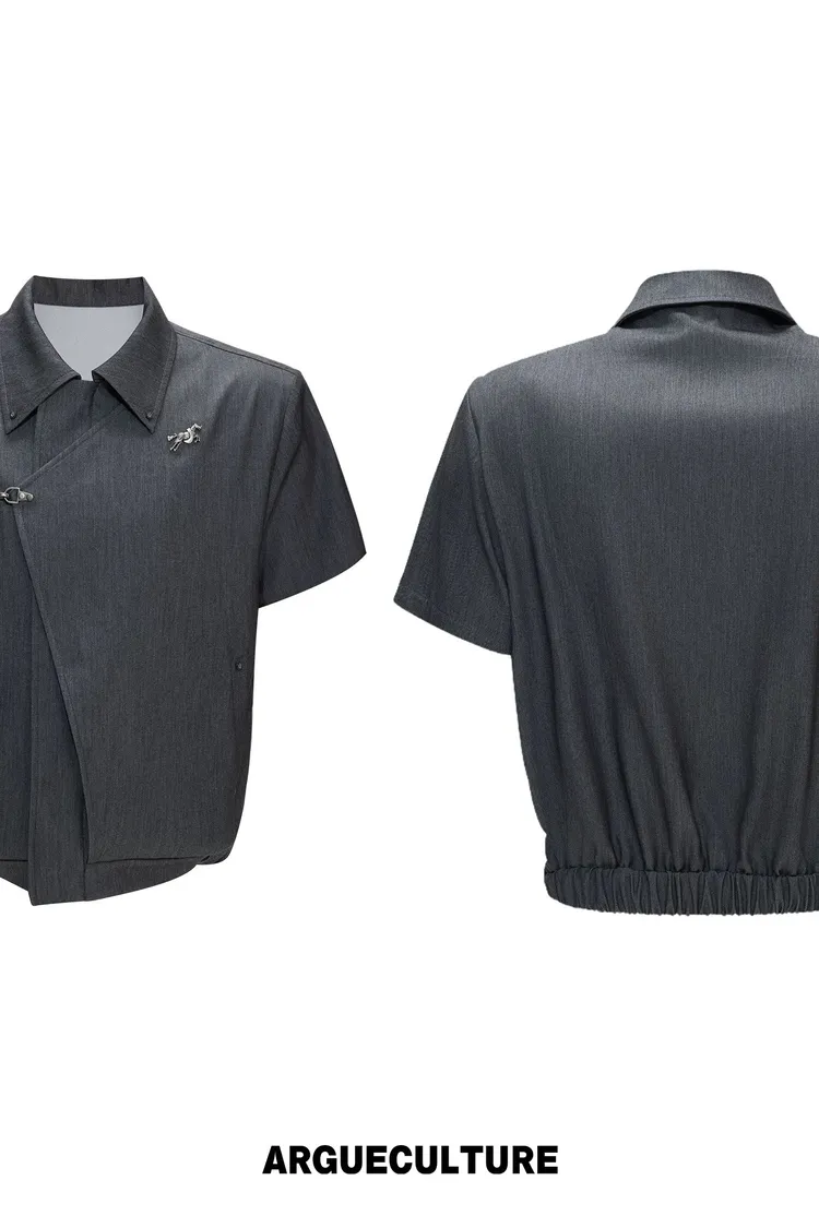 ARGUE 不規則假兩件 金屬標 套裝 BOXY短袖 西裝褲(黑/灰)
