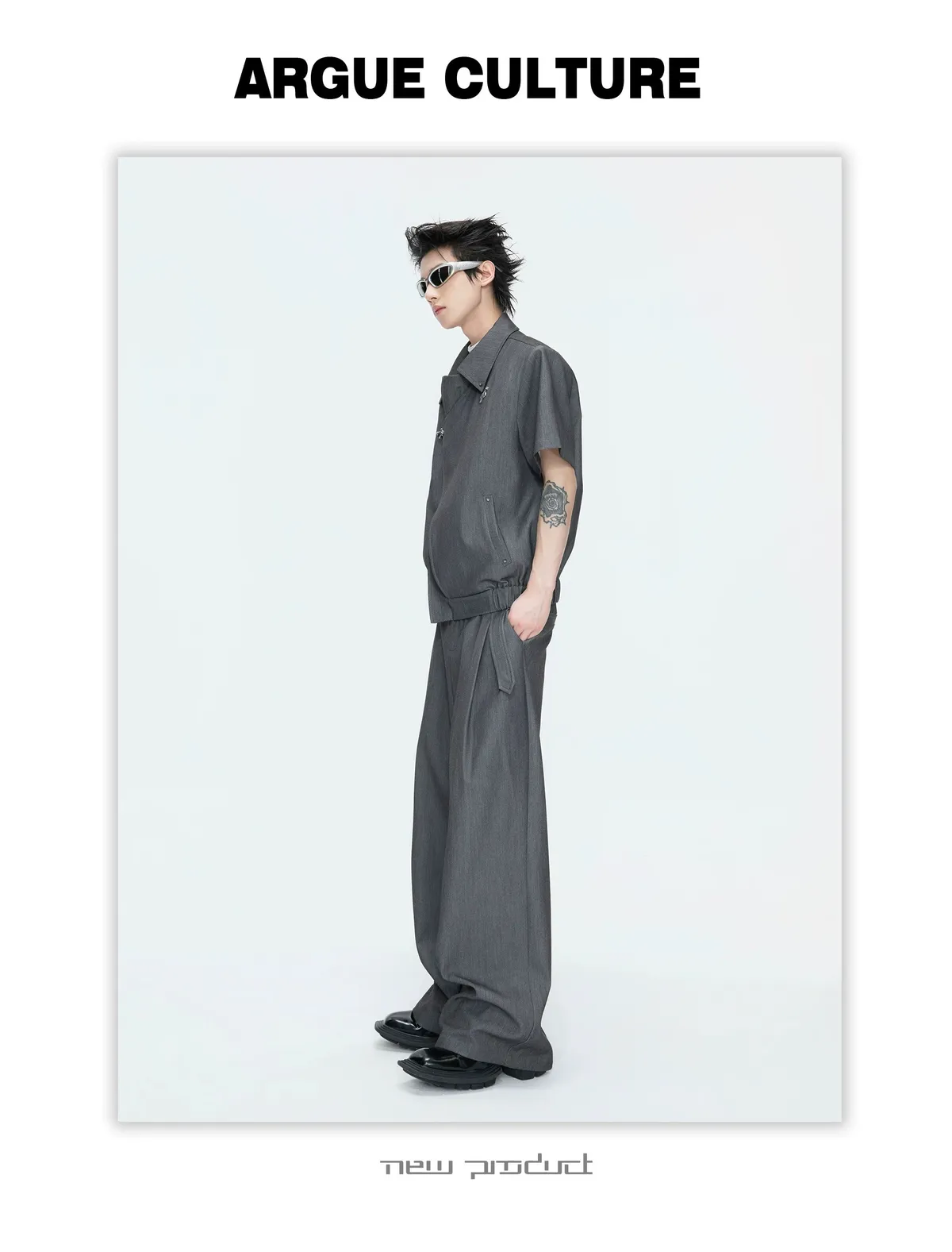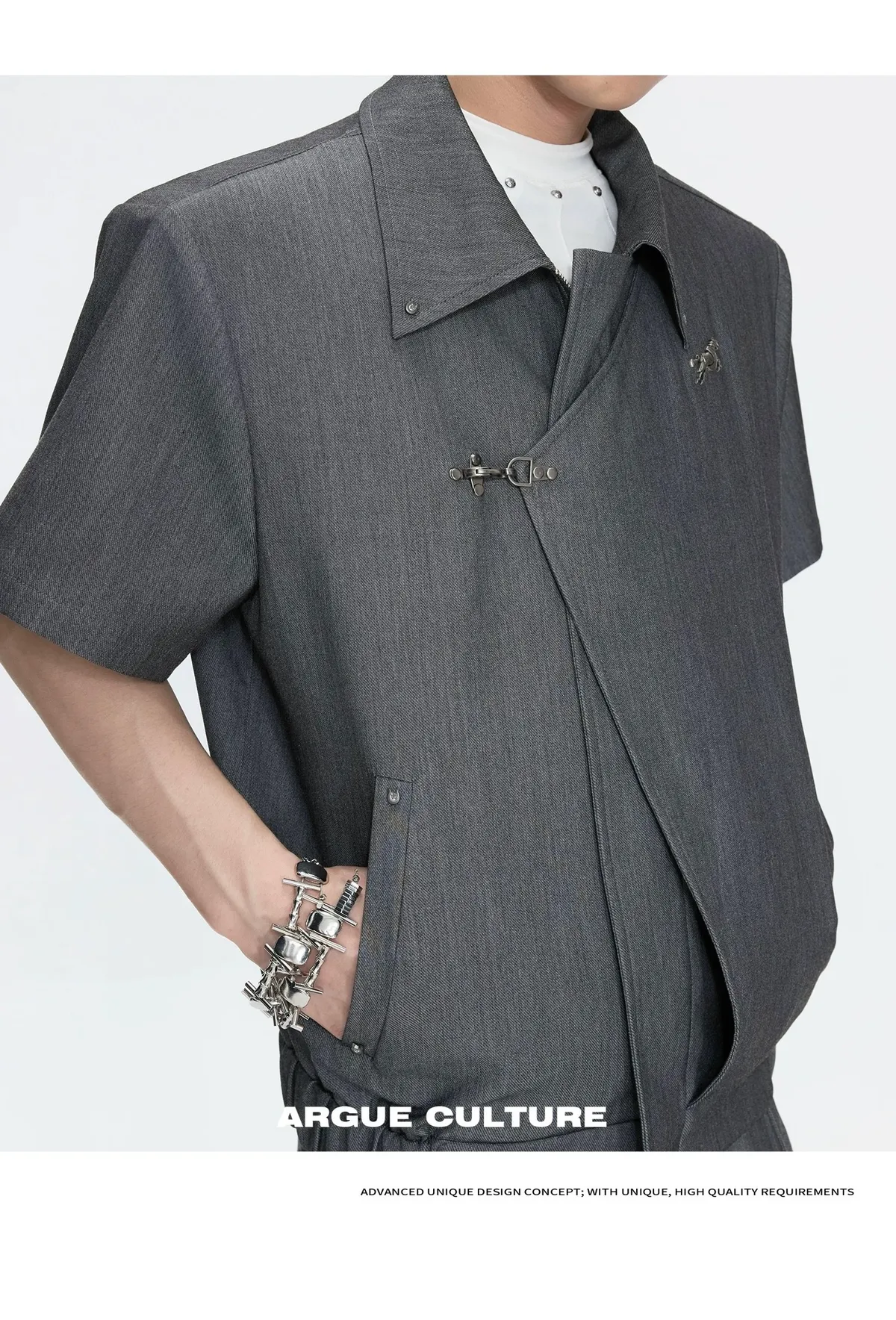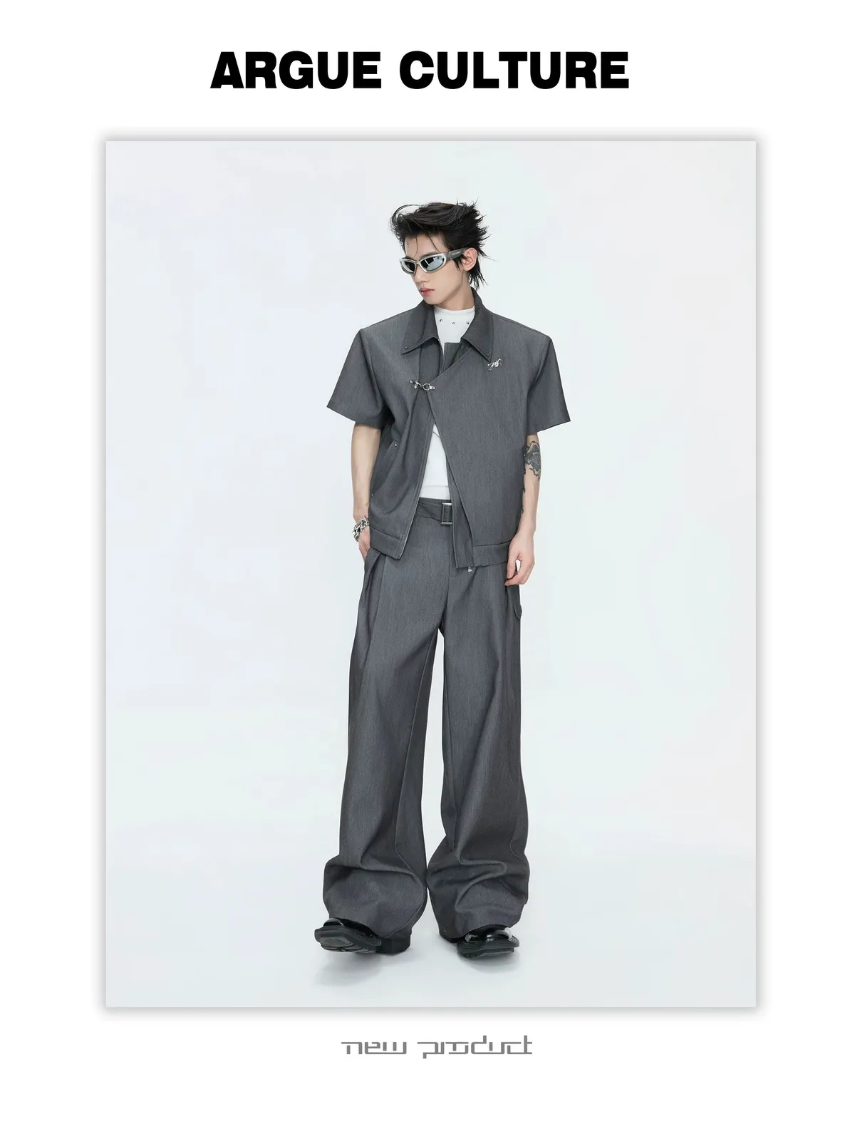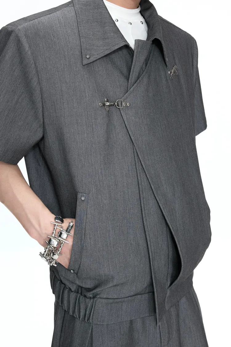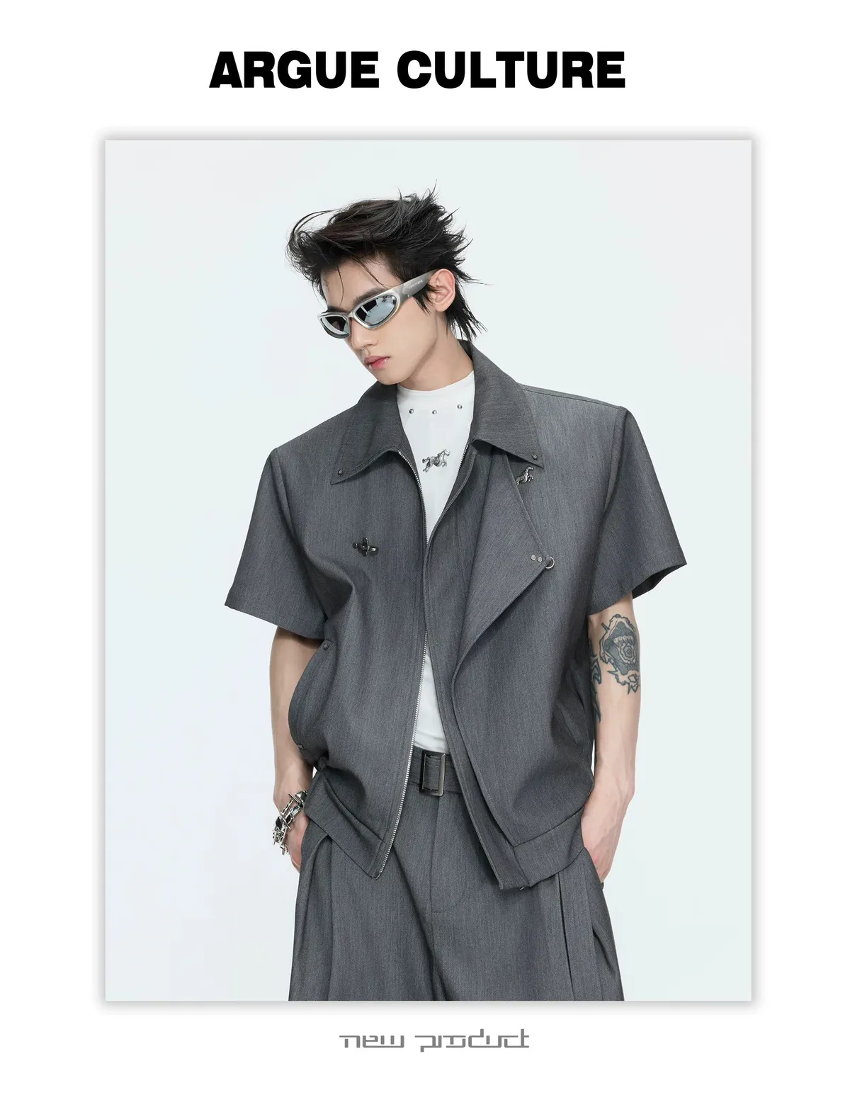 ARGUE 不規則假兩件 金屬標 套裝 BOXY短袖 西裝褲(黑/灰)