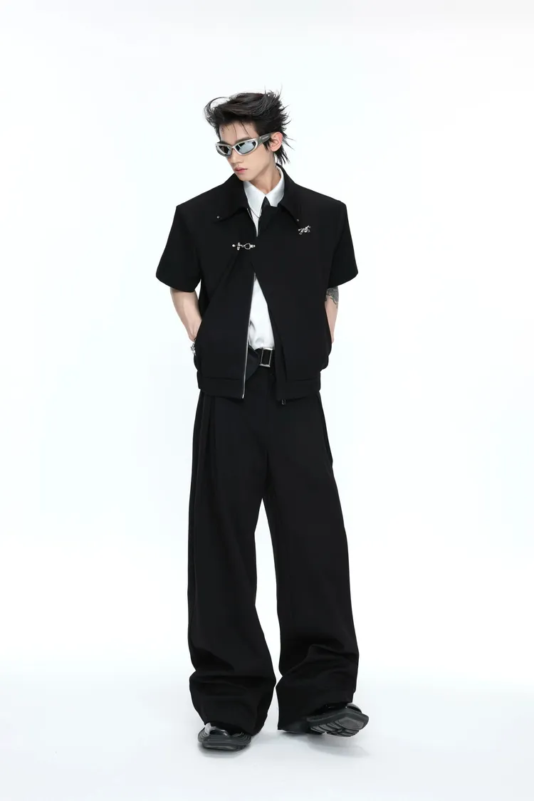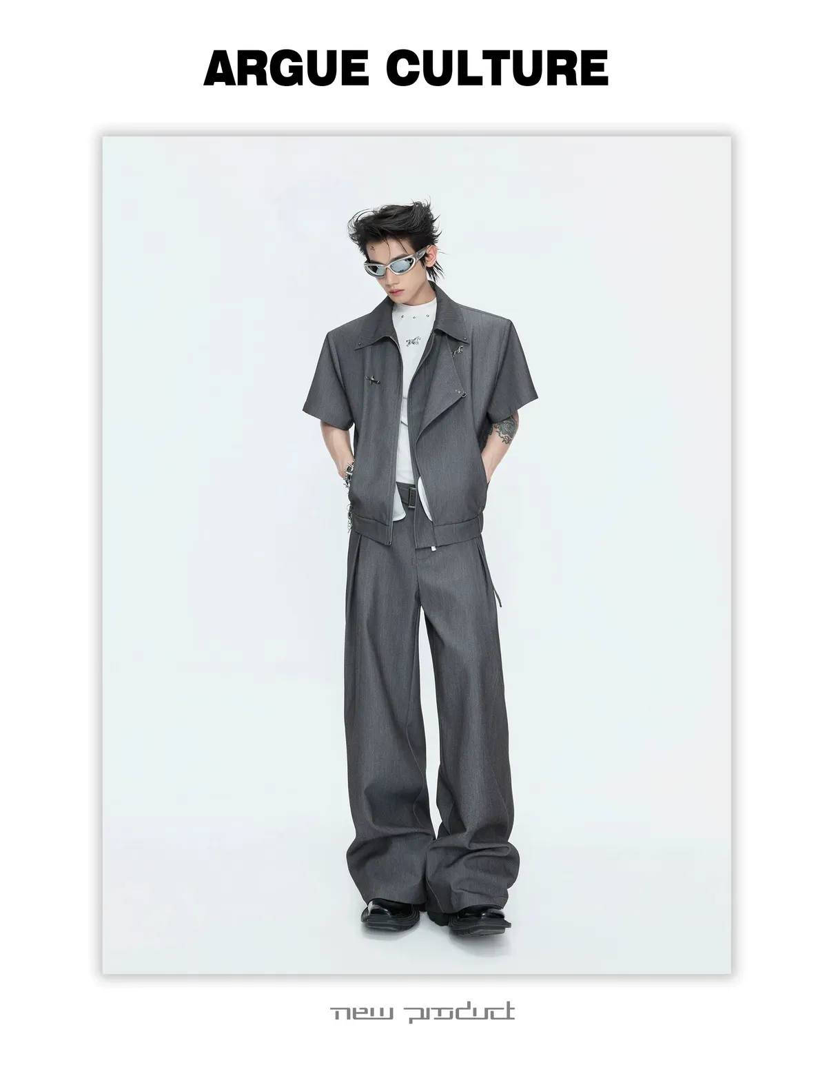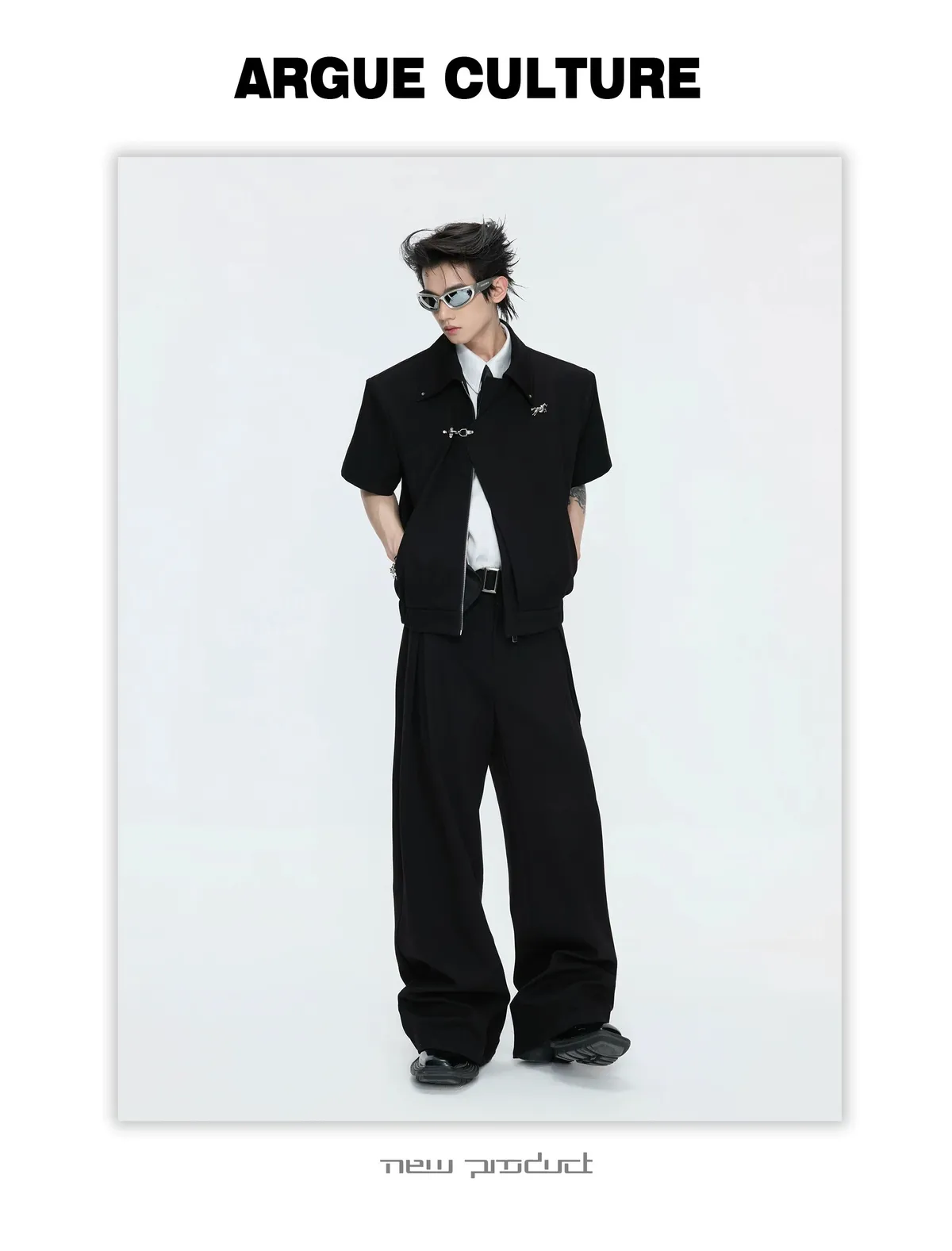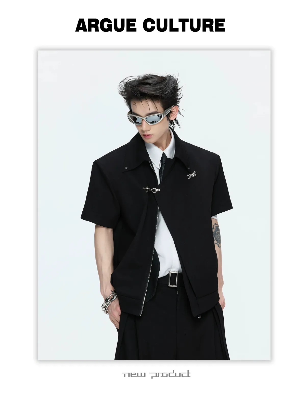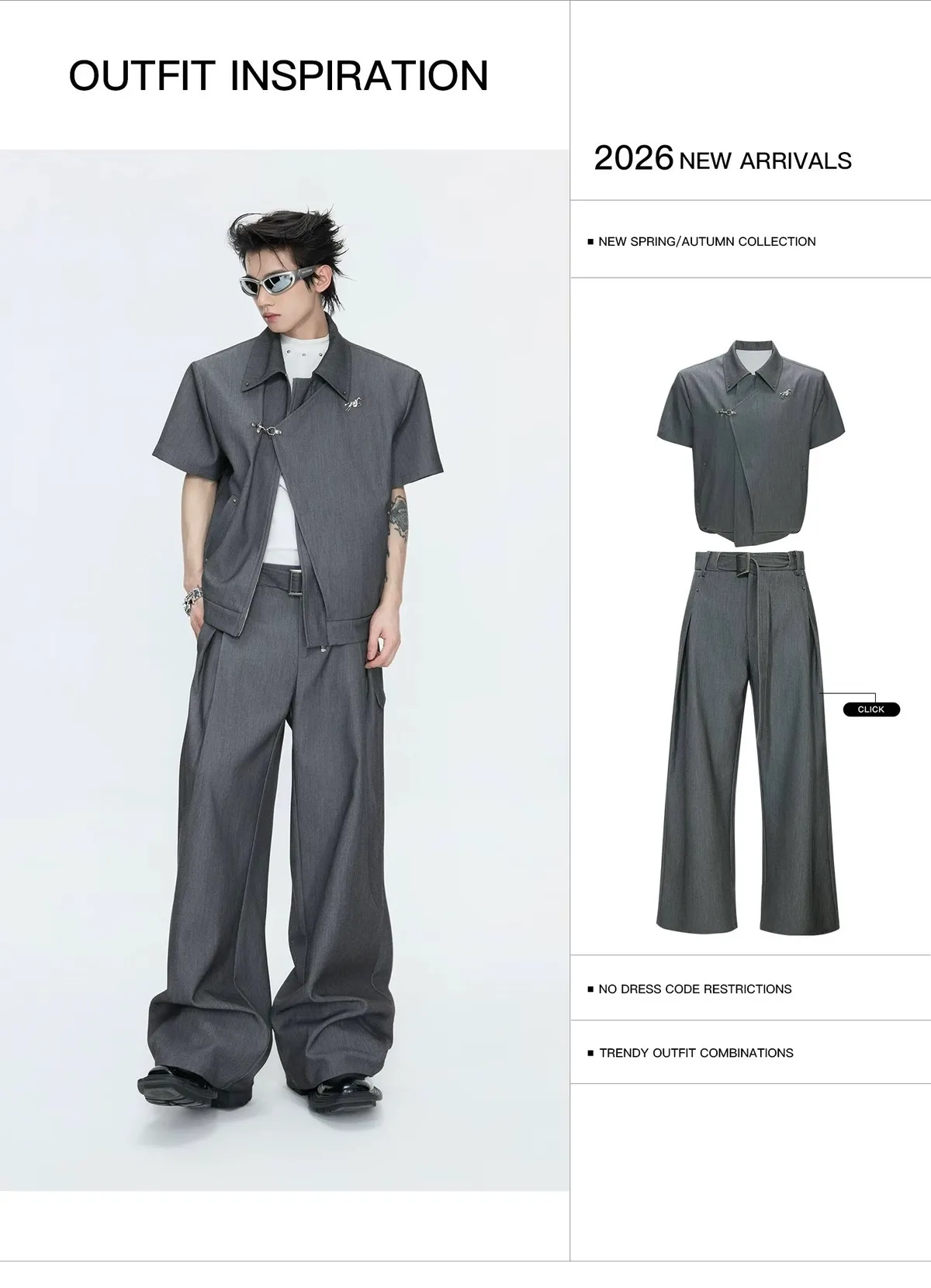 ARGUE 不規則假兩件 金屬標 套裝 BOXY短袖 西裝褲(黑/灰)