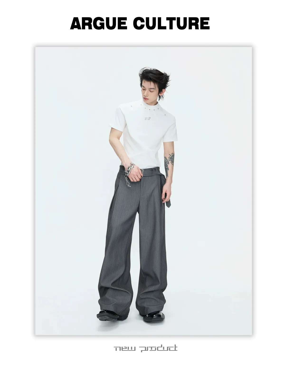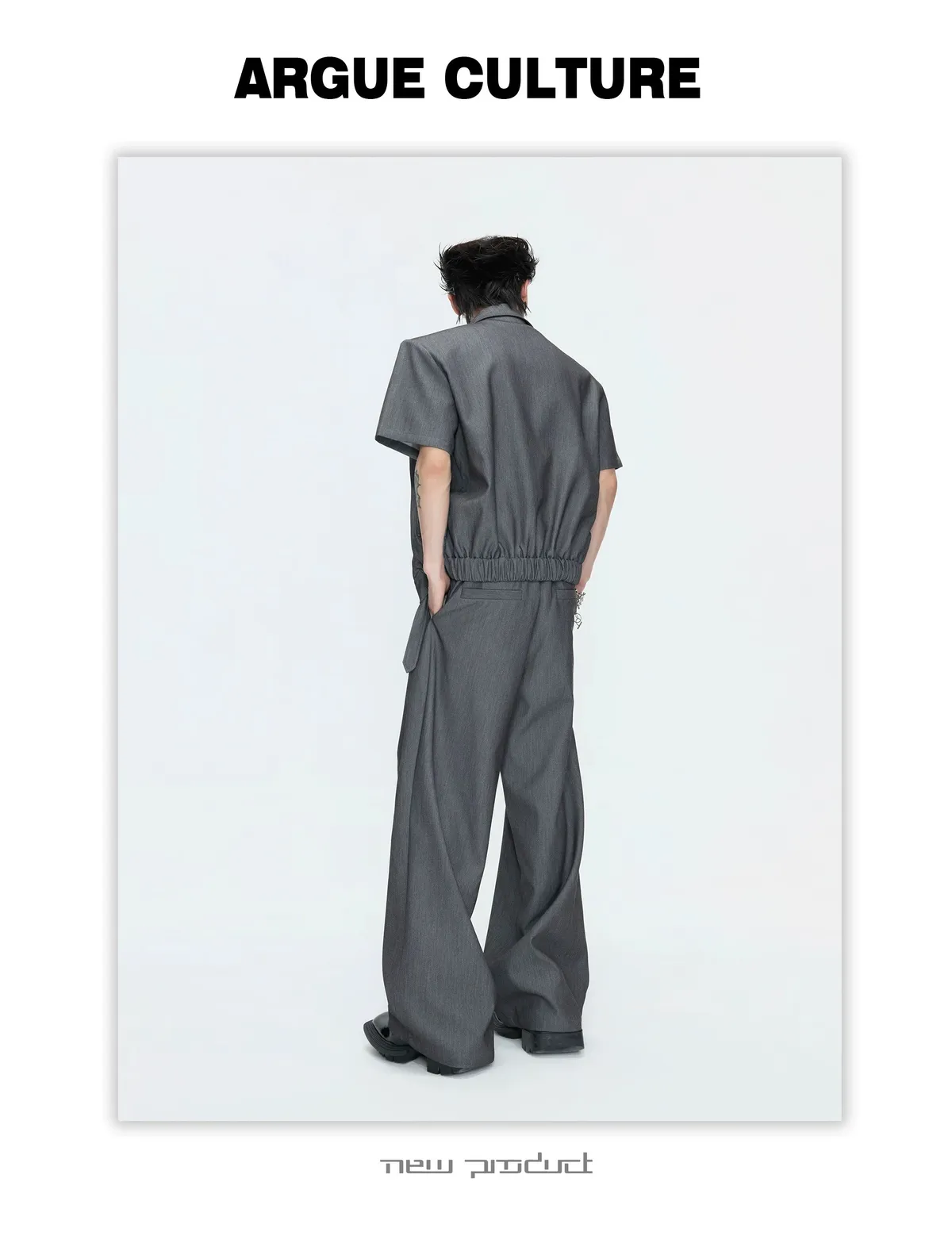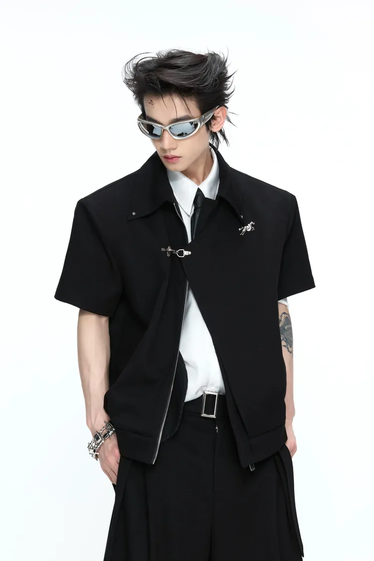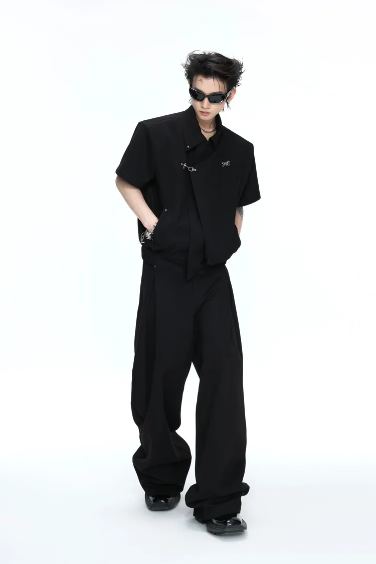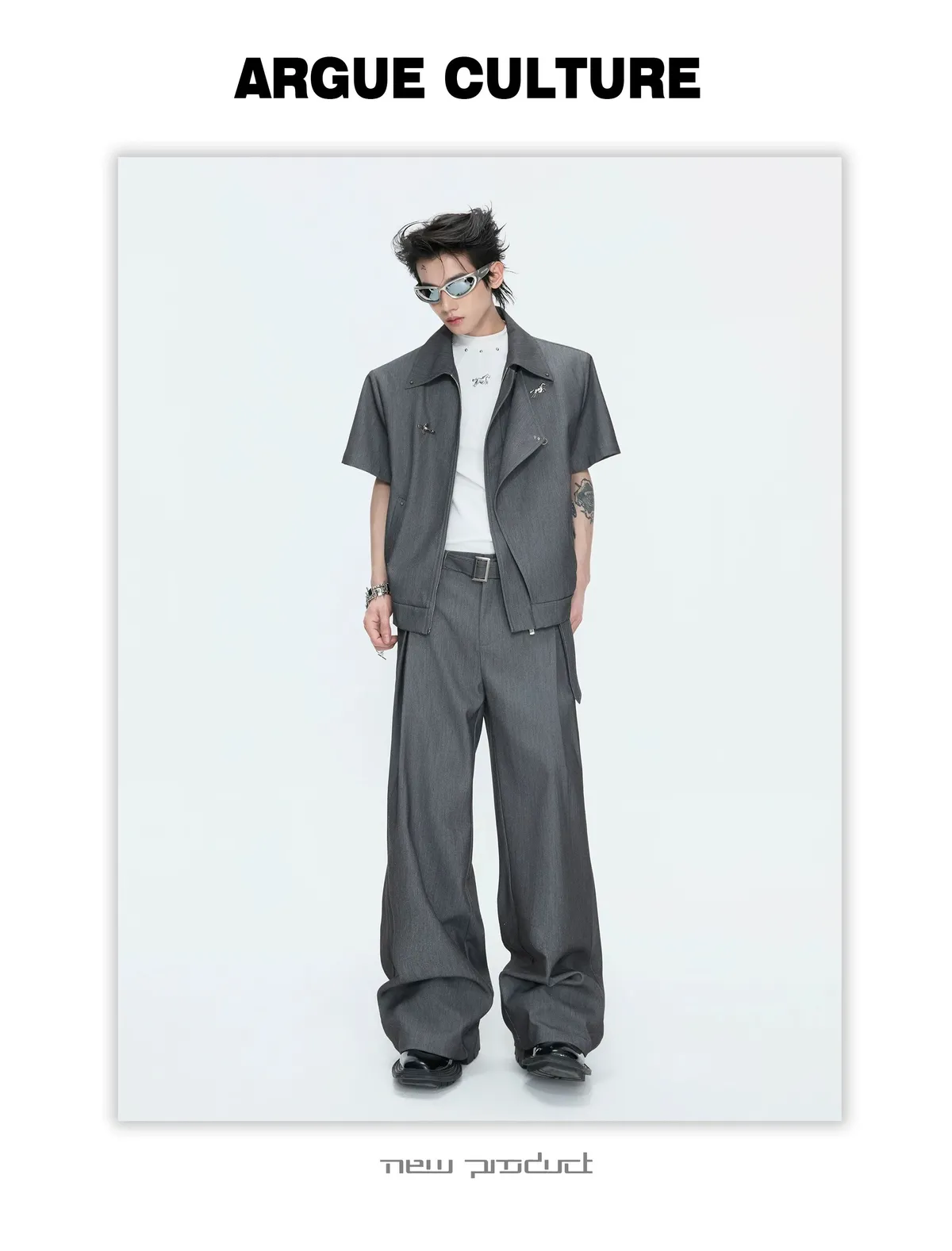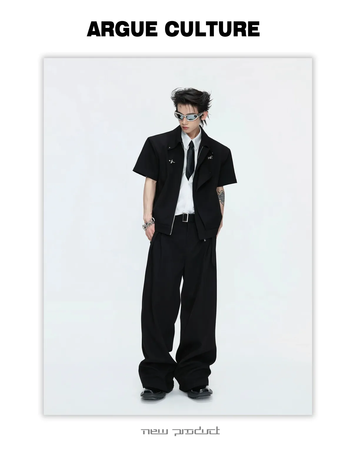 ARGUE 不規則假兩件 金屬標 套裝 BOXY短袖 西裝褲(黑/灰)
