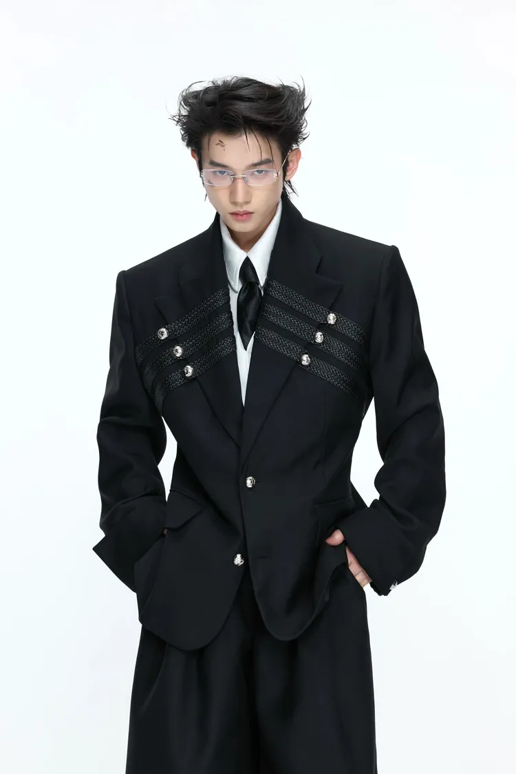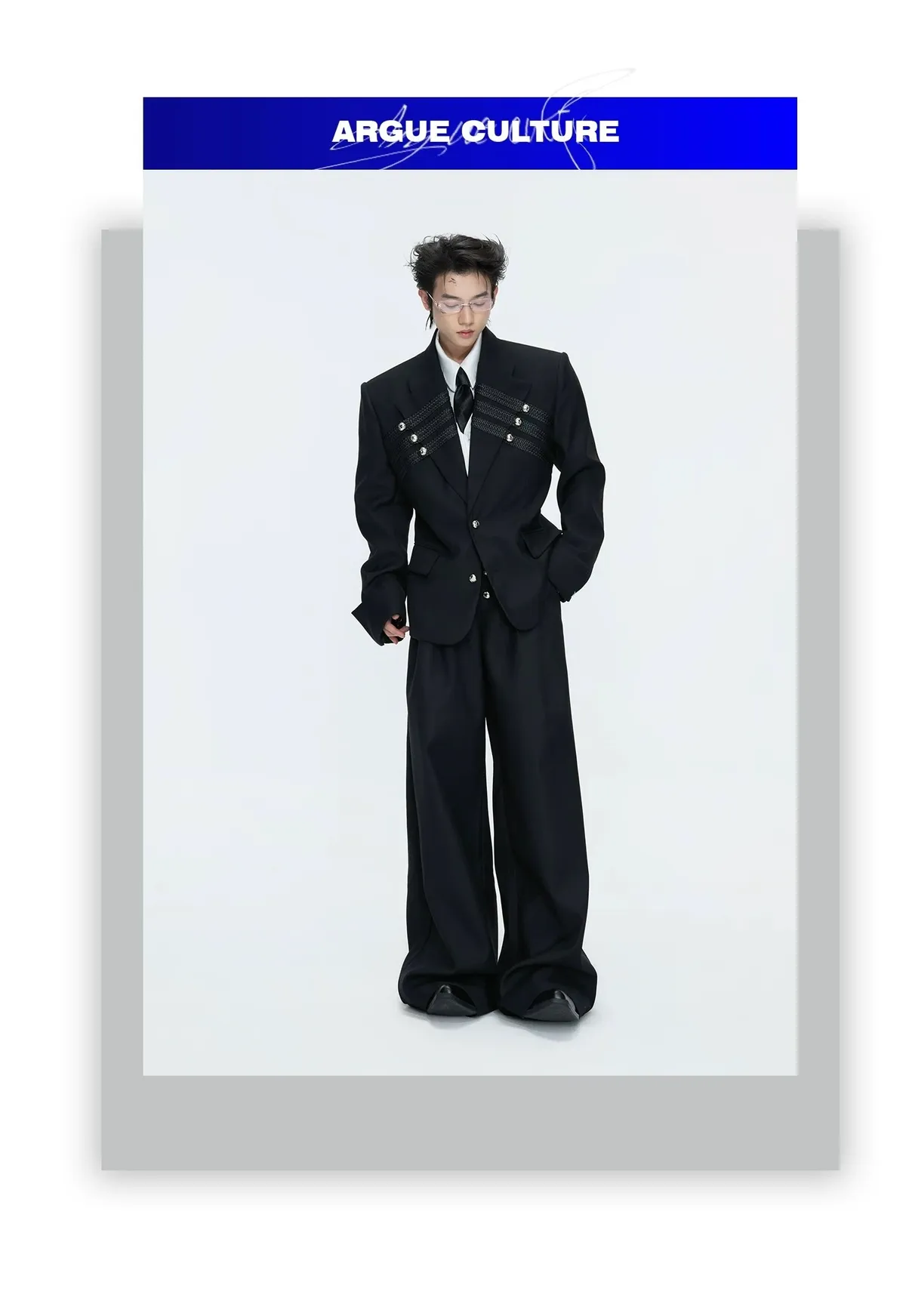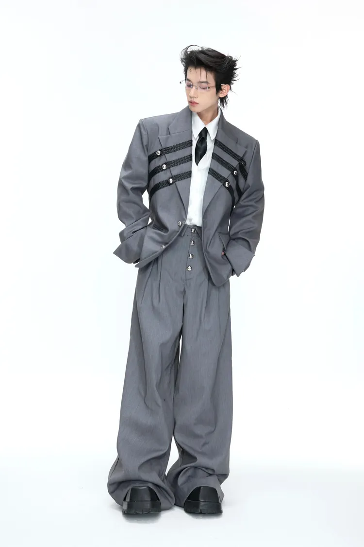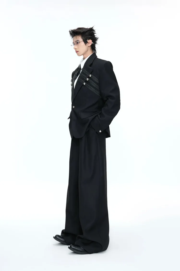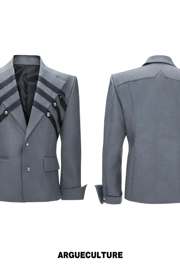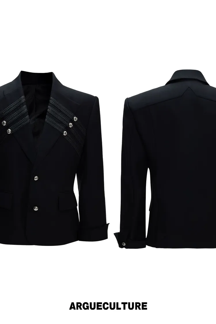 ARGUE 宮廷編織 金屬釘 雙排扣收腰西裝外套 西裝褲 套裝(黑/灰)