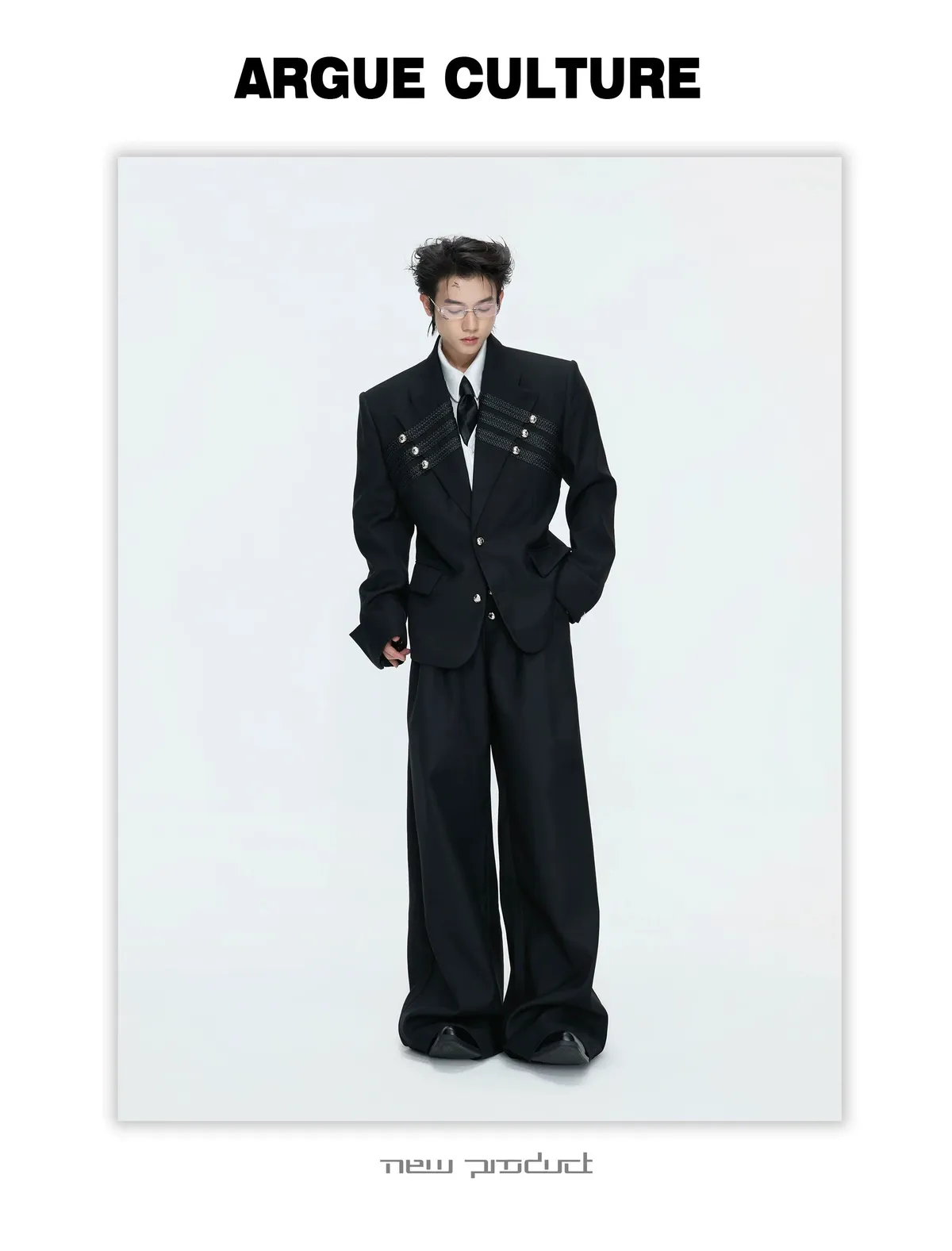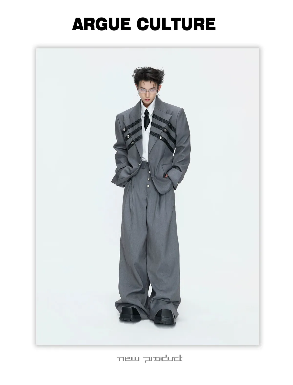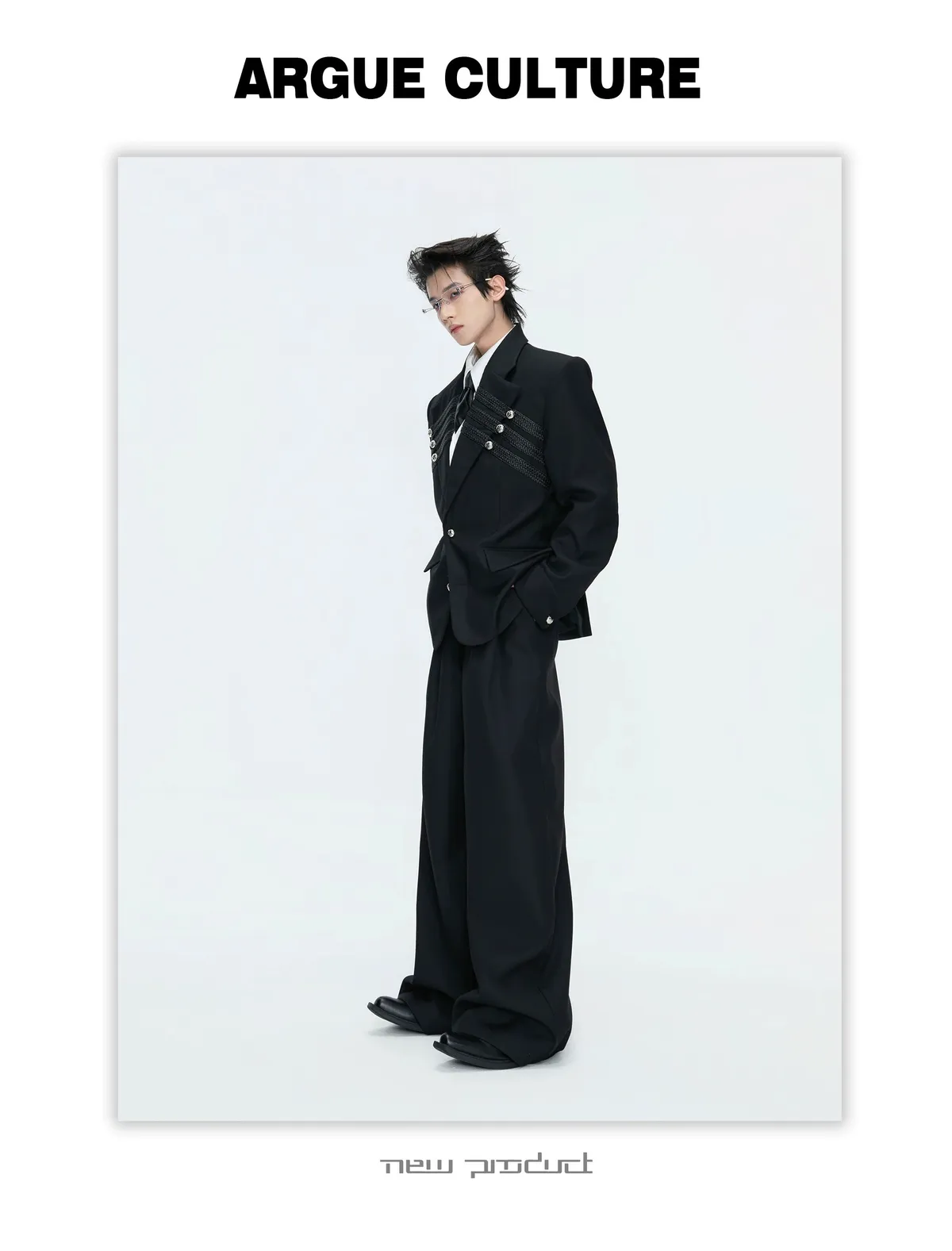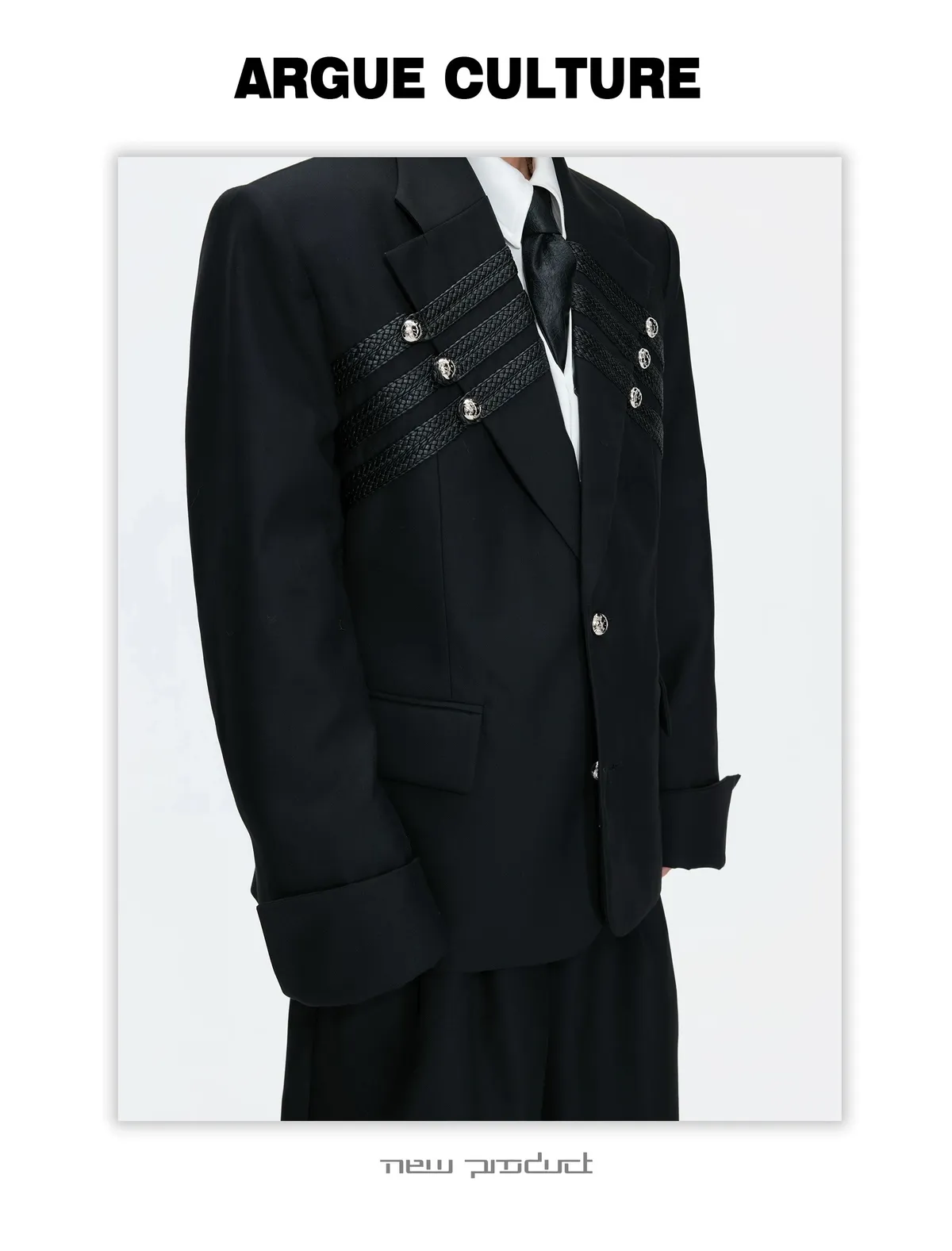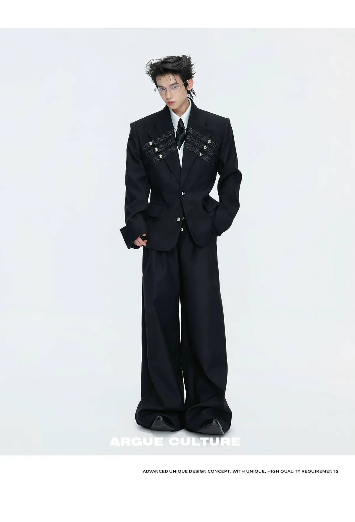 ARGUE 宮廷編織 金屬釘 雙排扣收腰西裝外套 西裝褲 套裝(黑/灰)