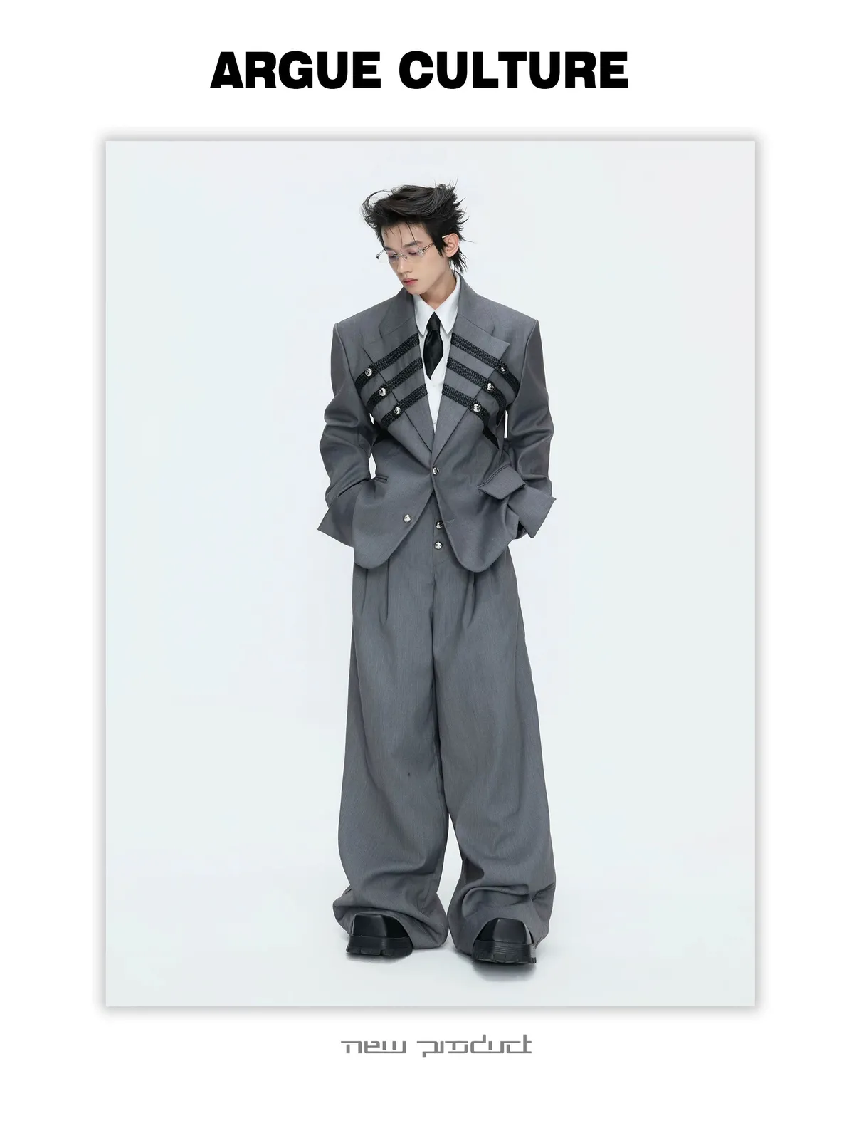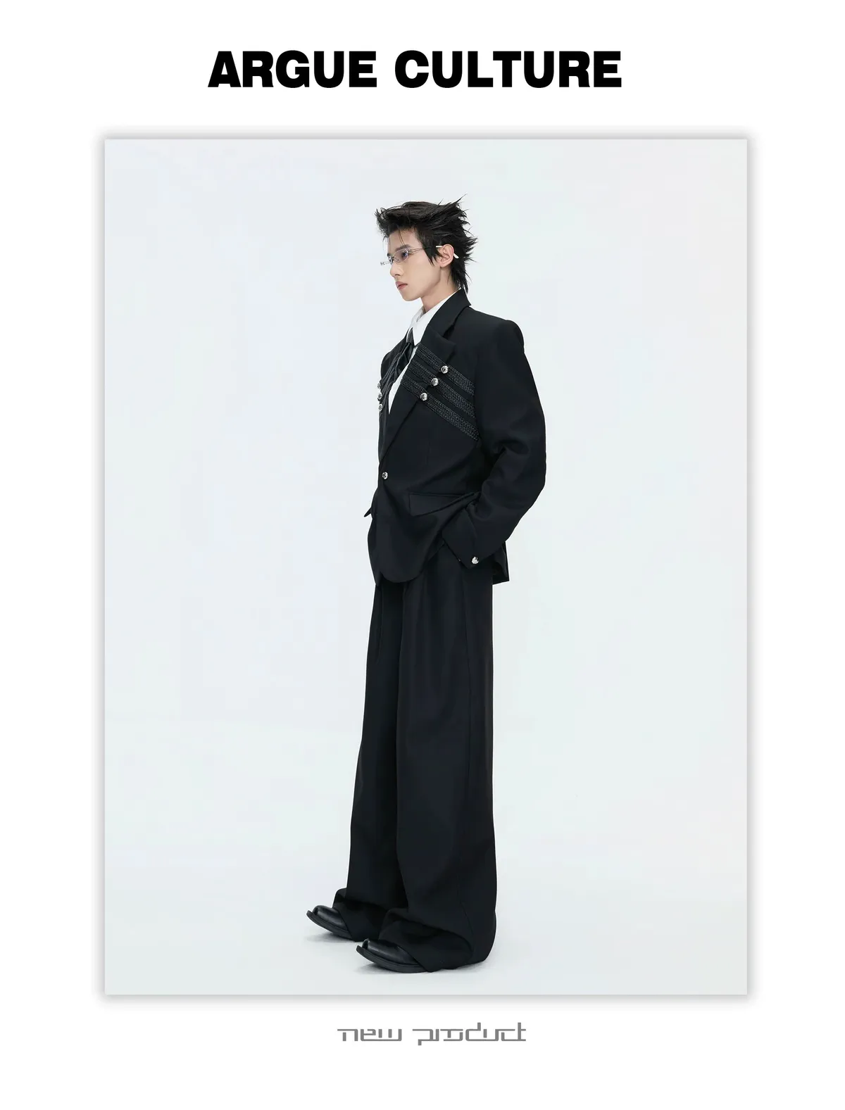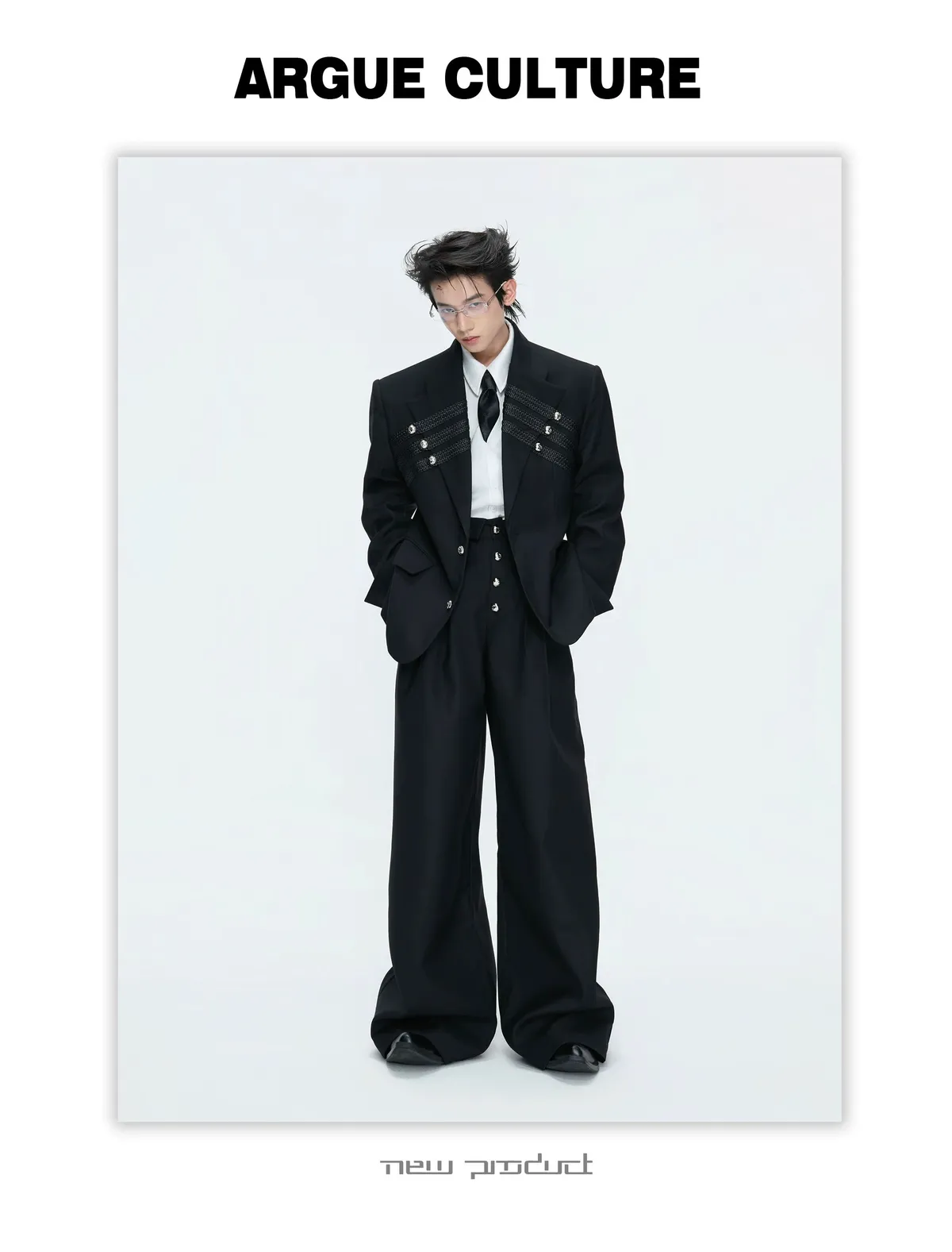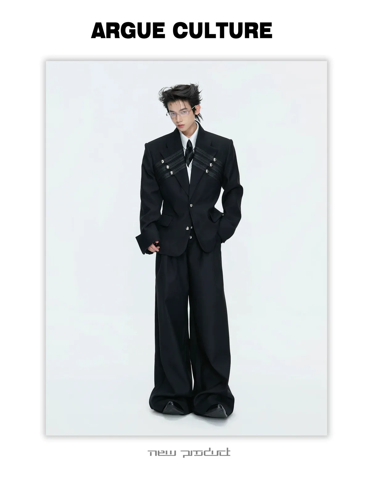 ARGUE 宮廷編織 金屬釘 雙排扣收腰西裝外套 西裝褲 套裝(黑/灰)