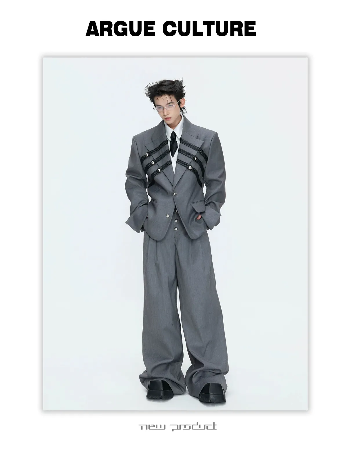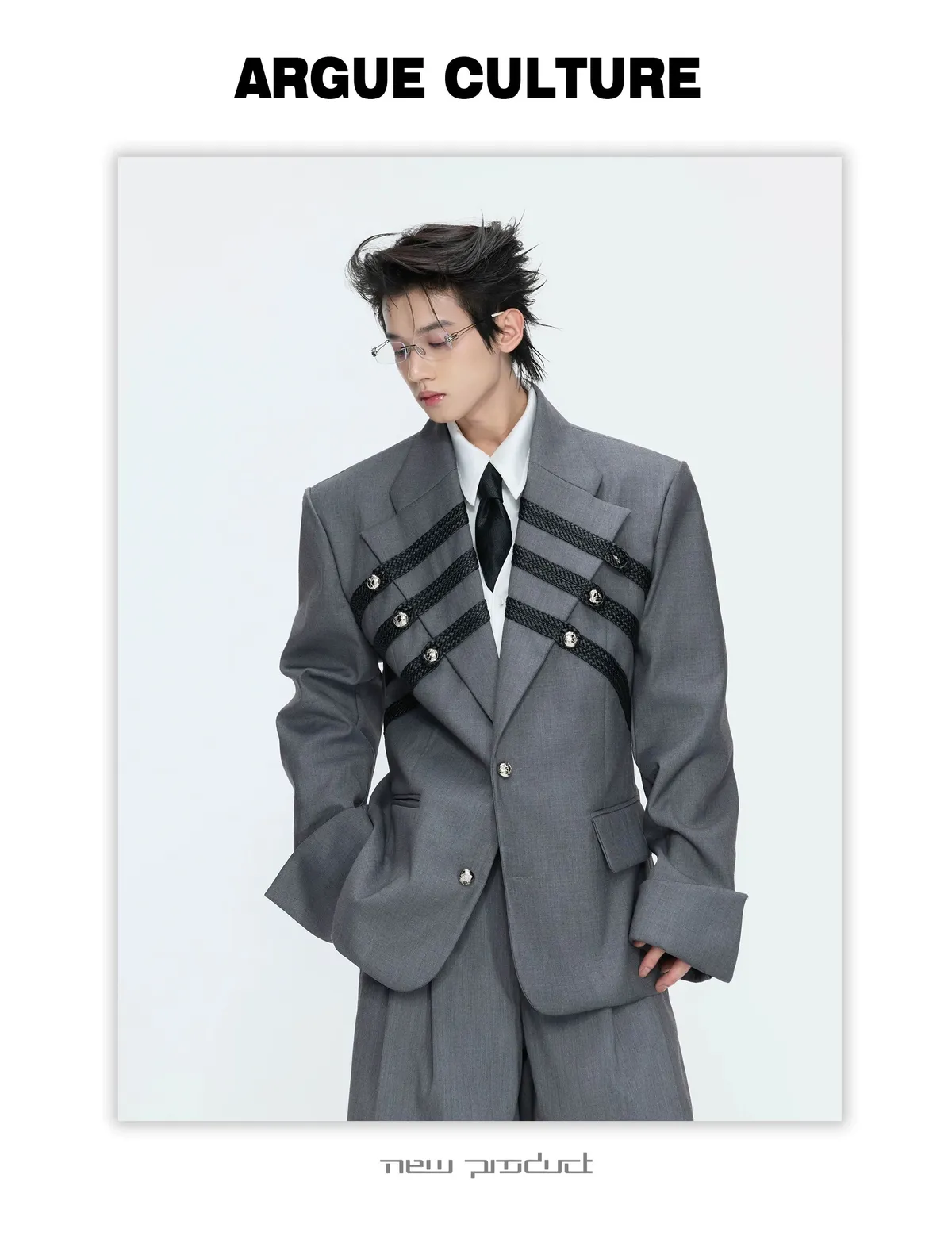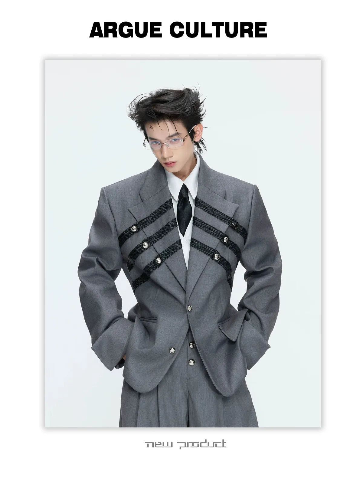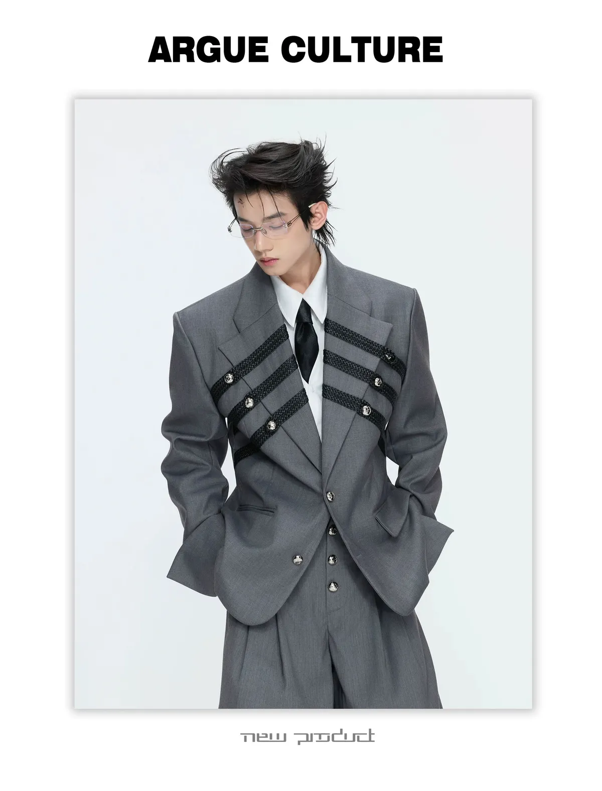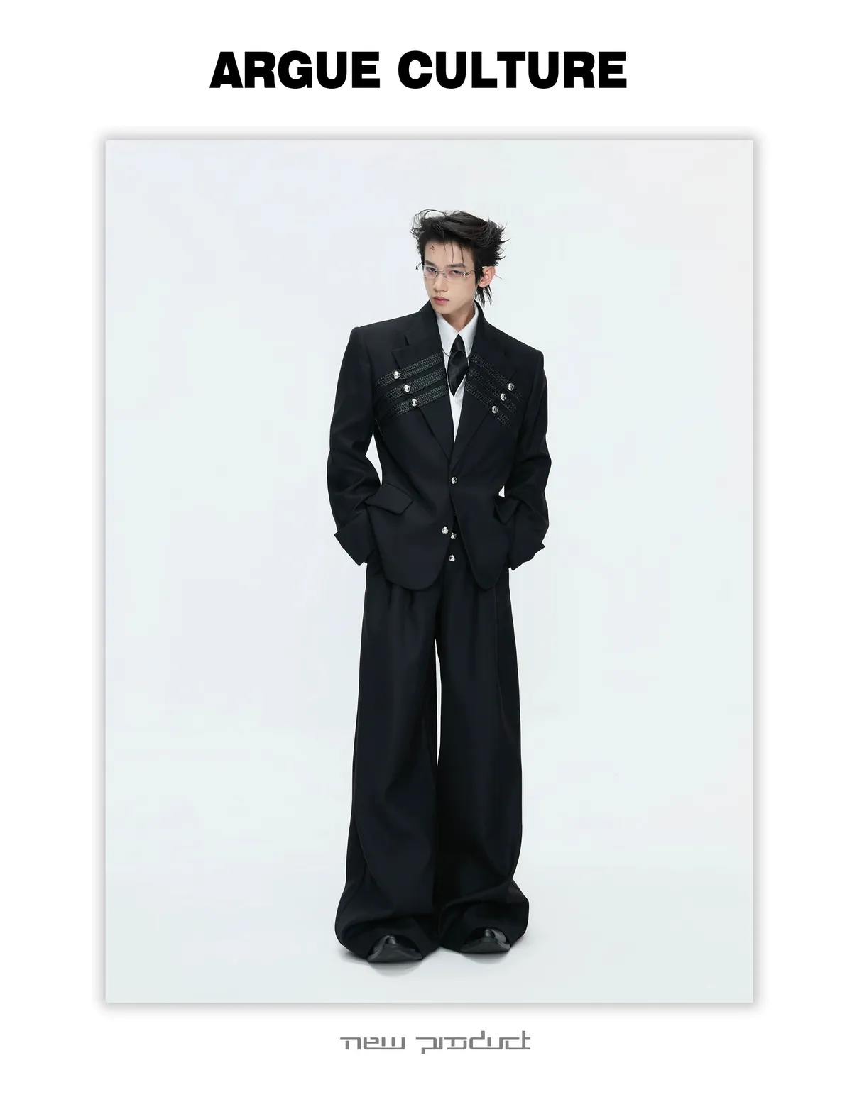 ARGUE 宮廷編織 金屬釘 雙排扣收腰西裝外套 西裝褲 套裝(黑/灰)