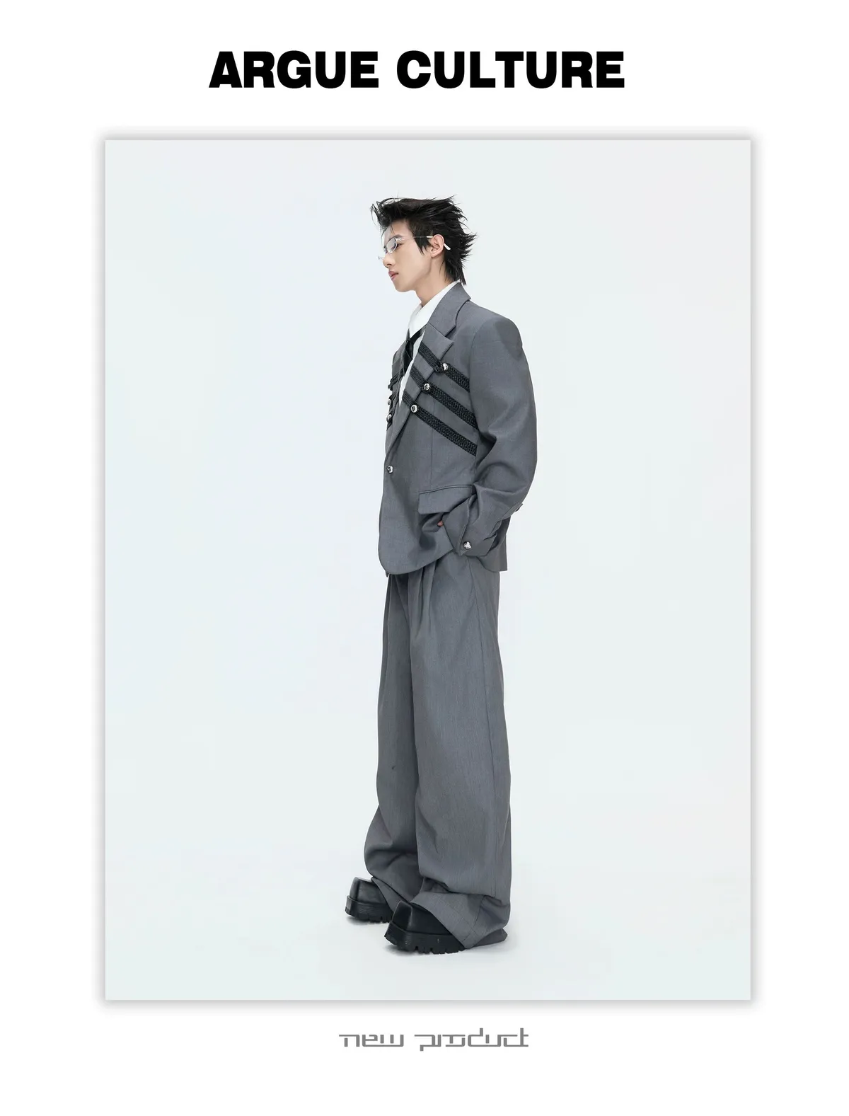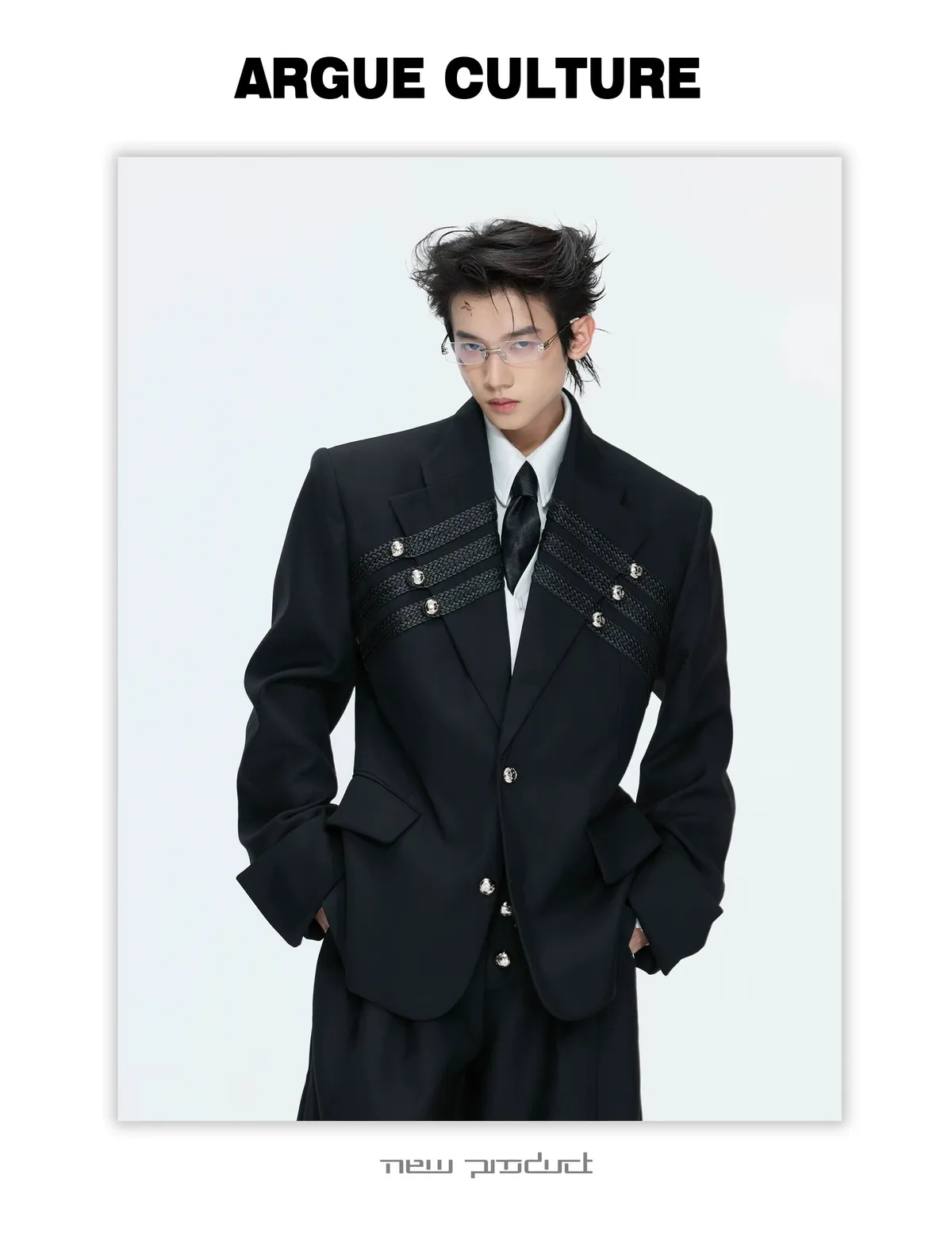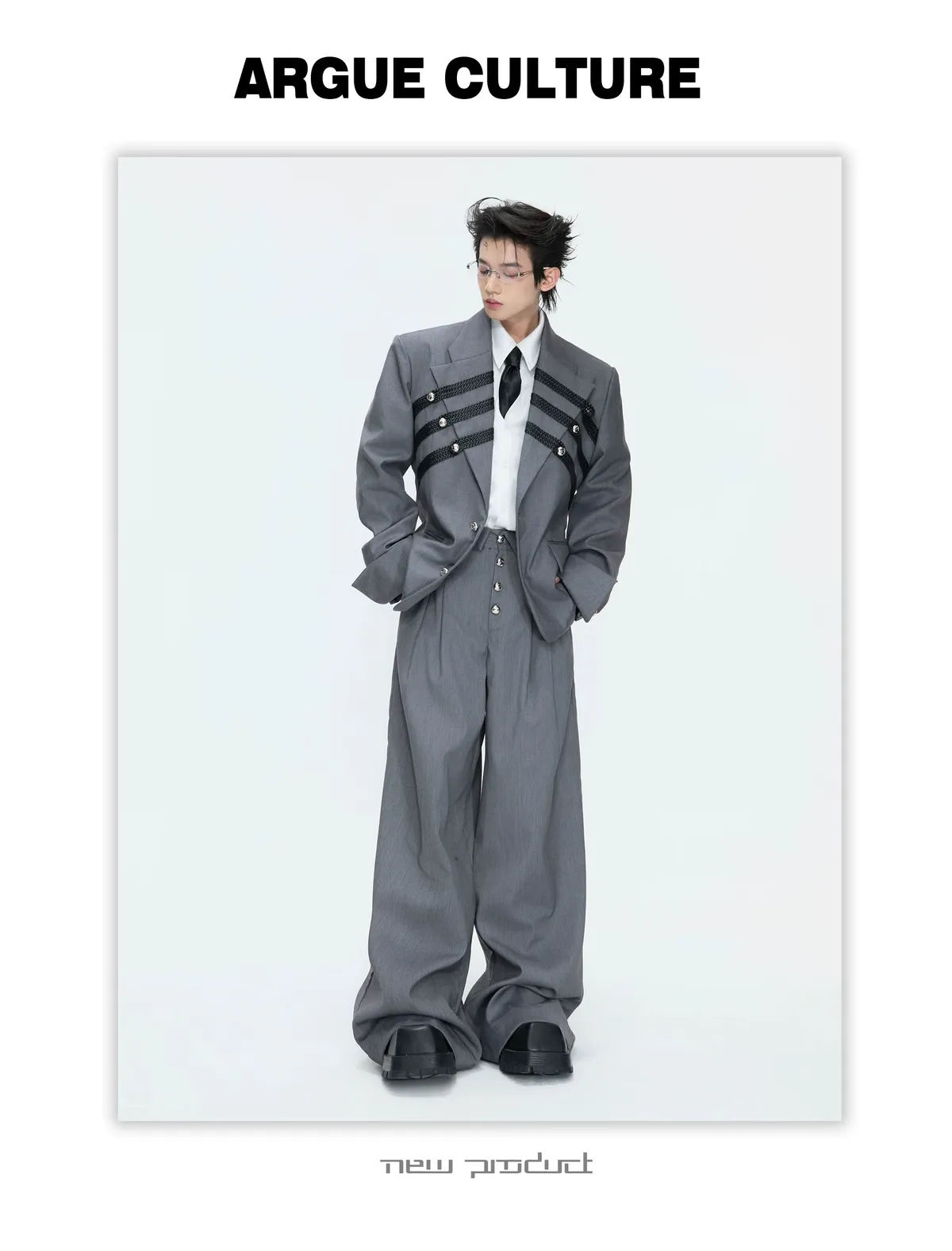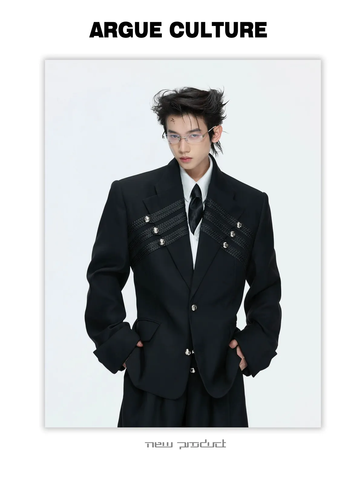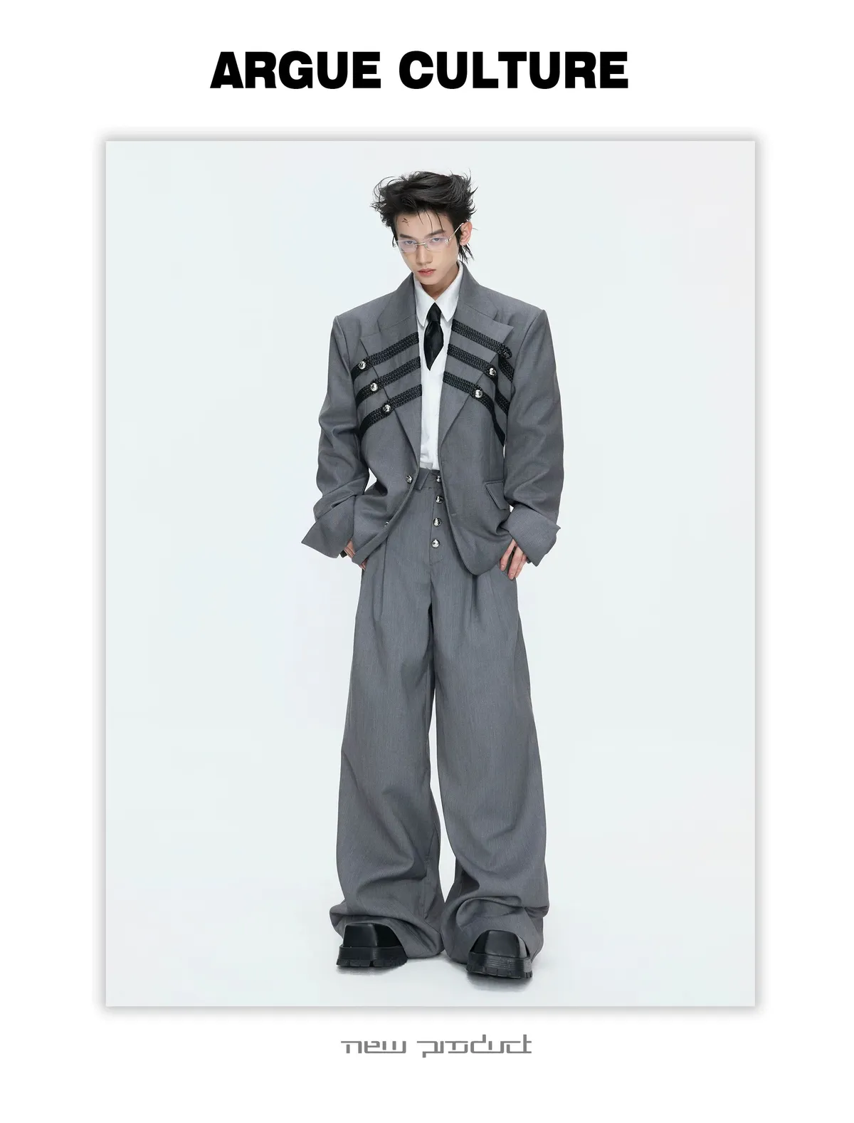 ARGUE 宮廷編織 金屬釘 雙排扣收腰西裝外套 西裝褲 套裝(黑/灰)