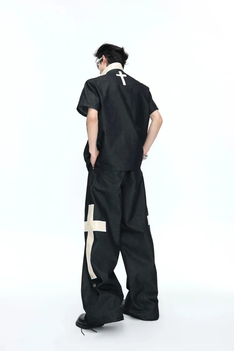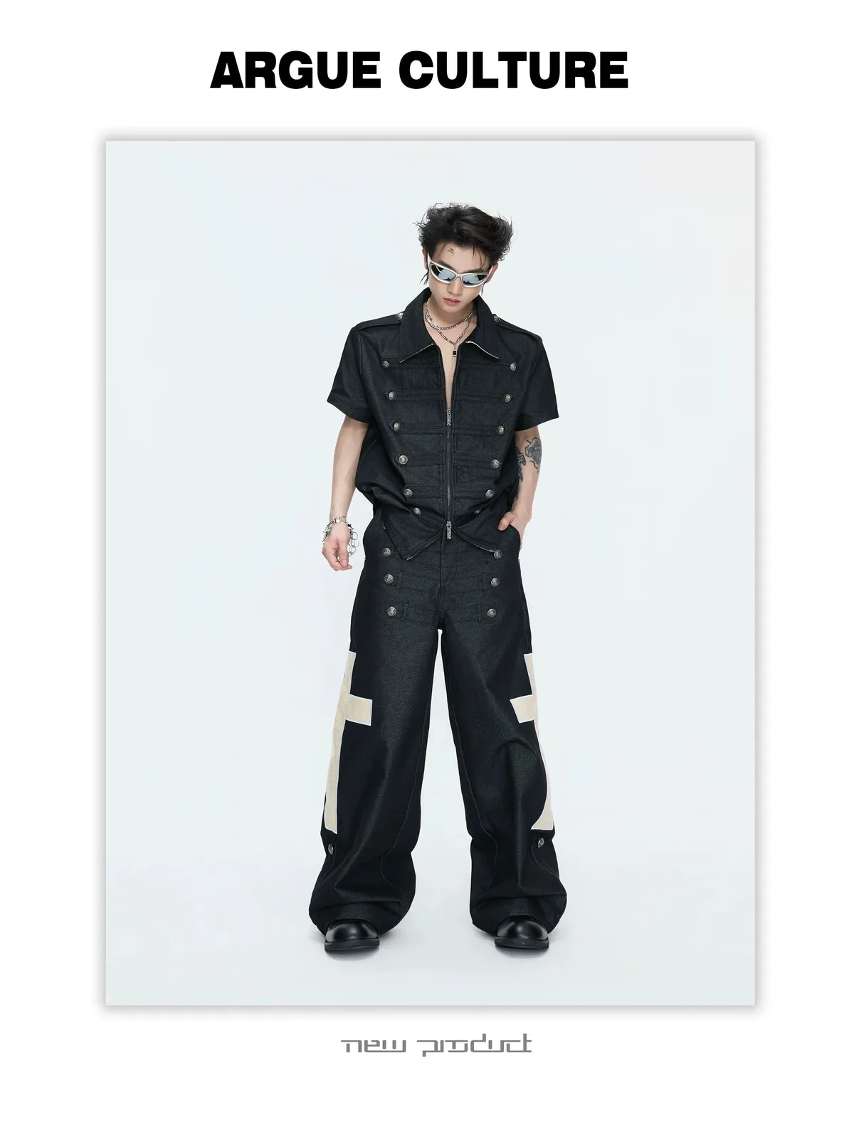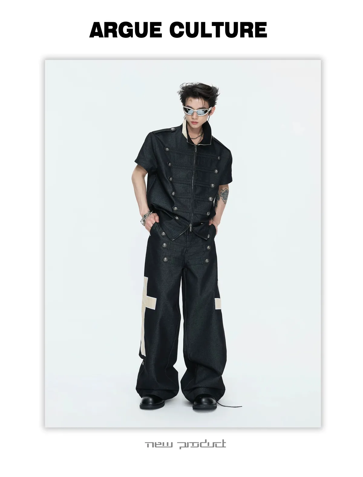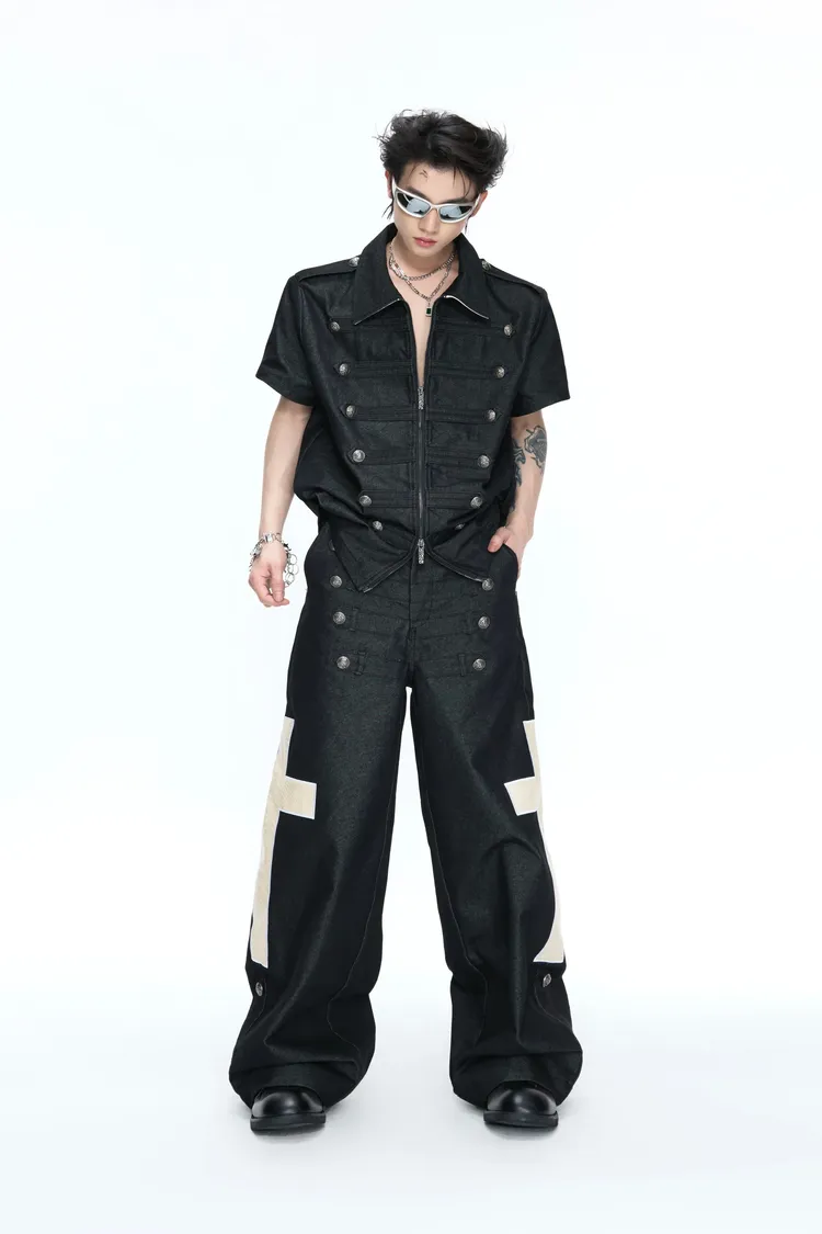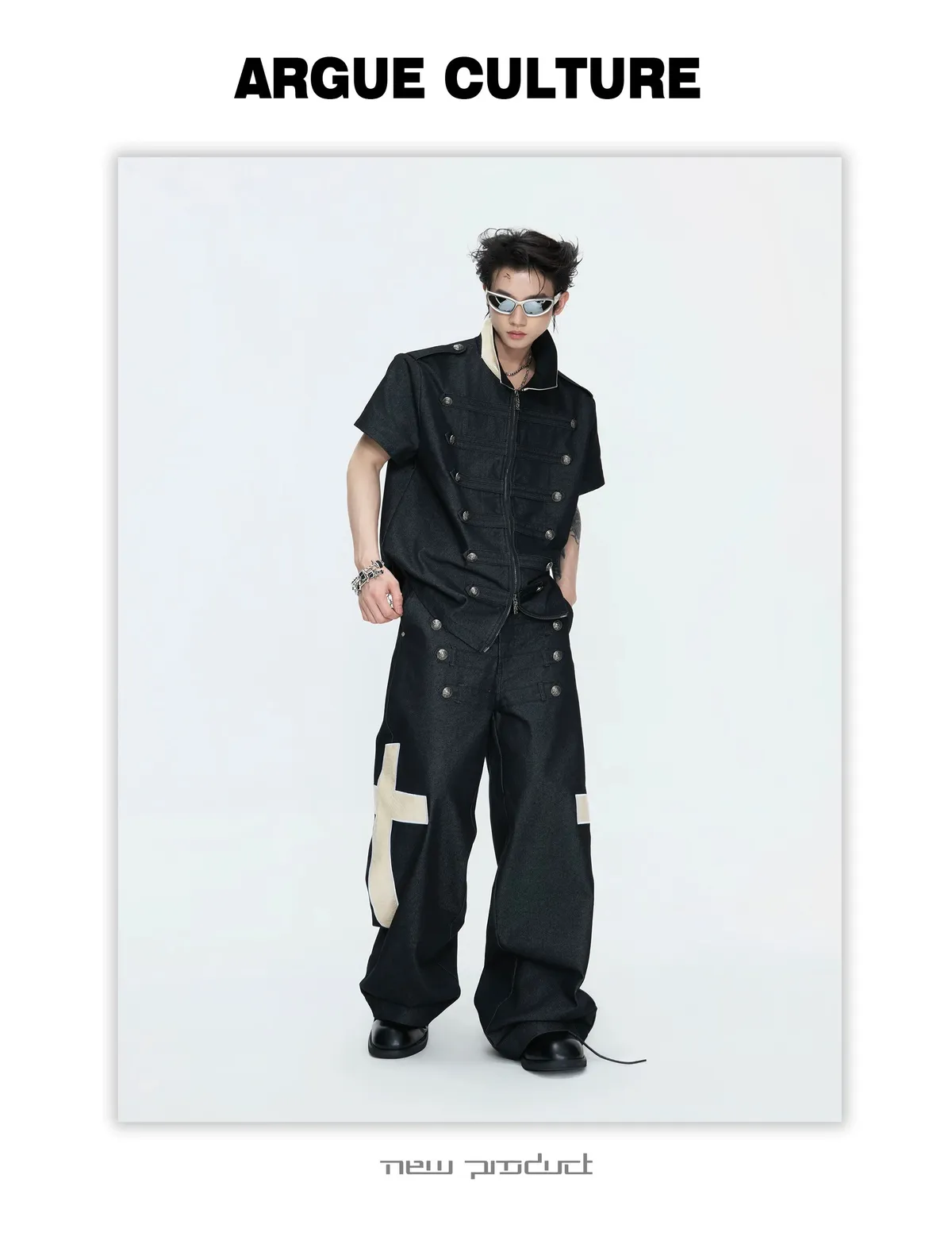 ARGUE 拿破崙排扣 皮革十字架 牛仔襯衫 牛仔褲 套裝(黑色)