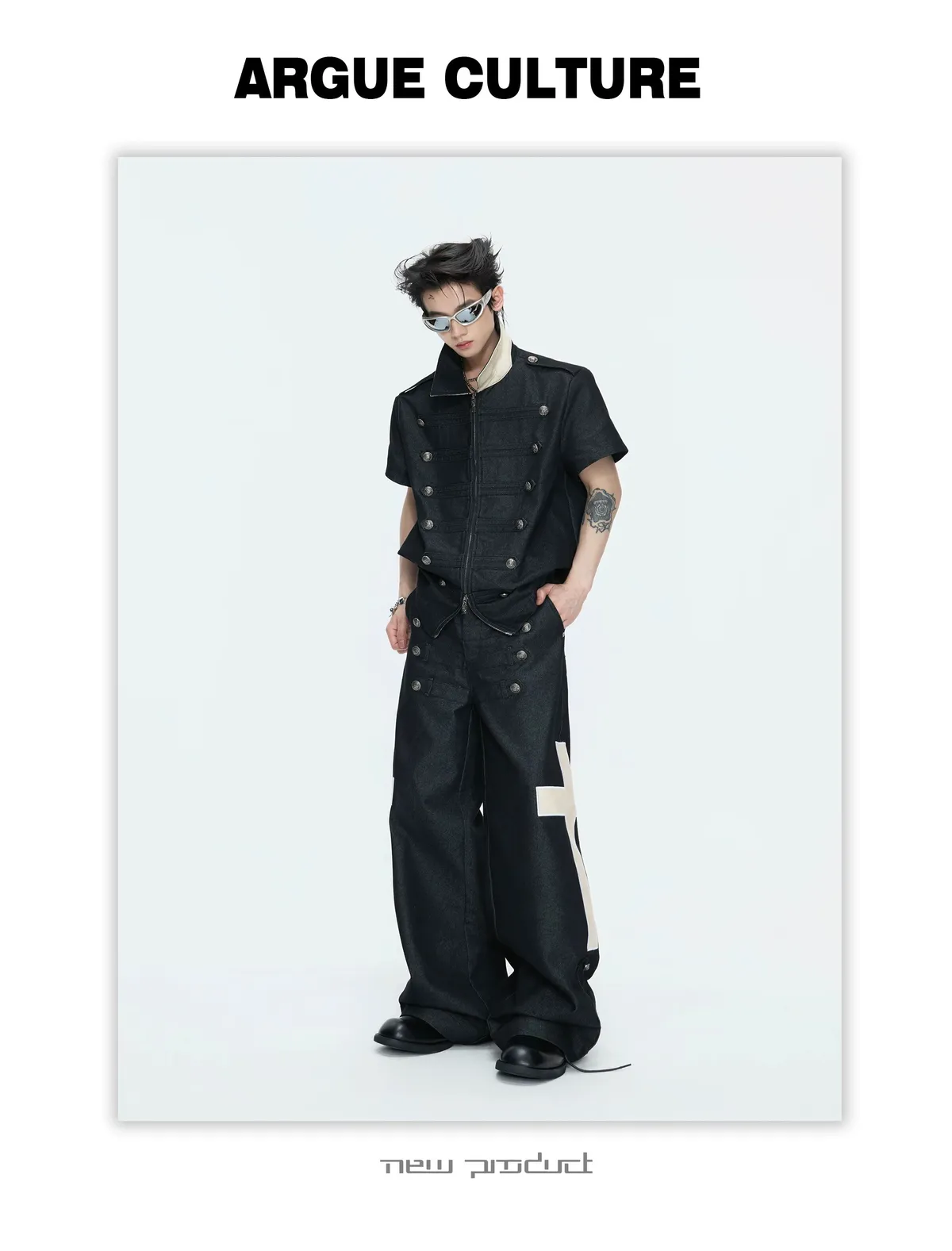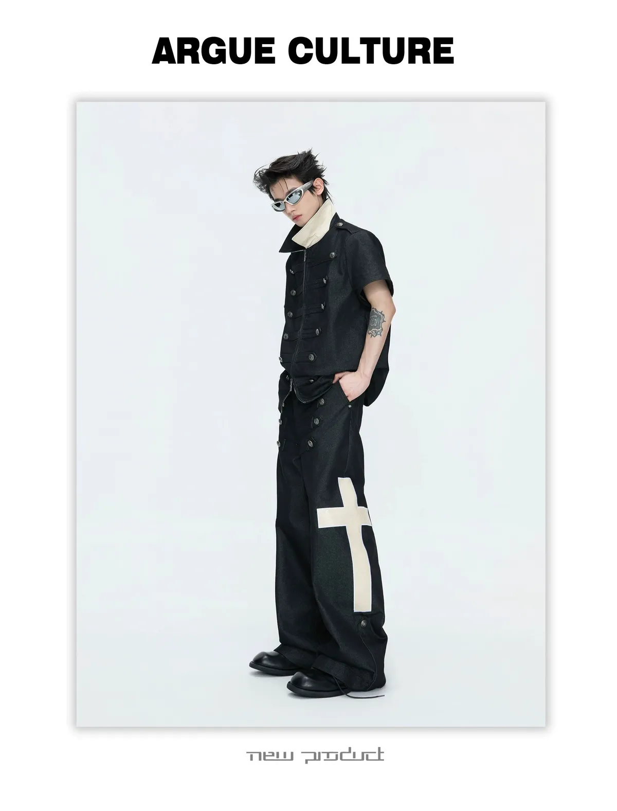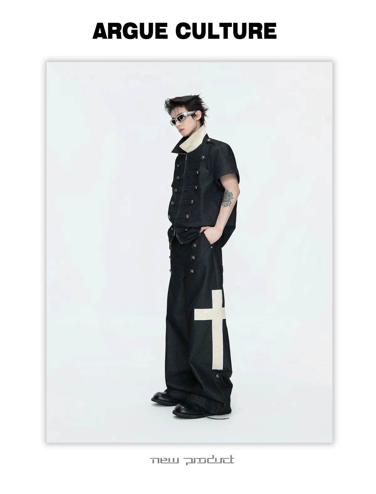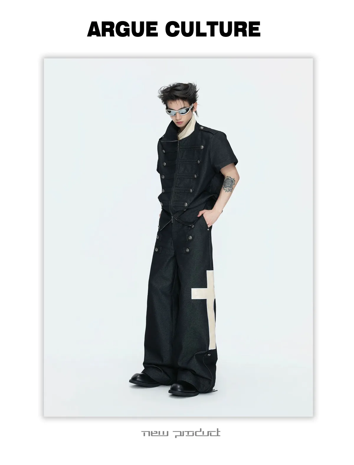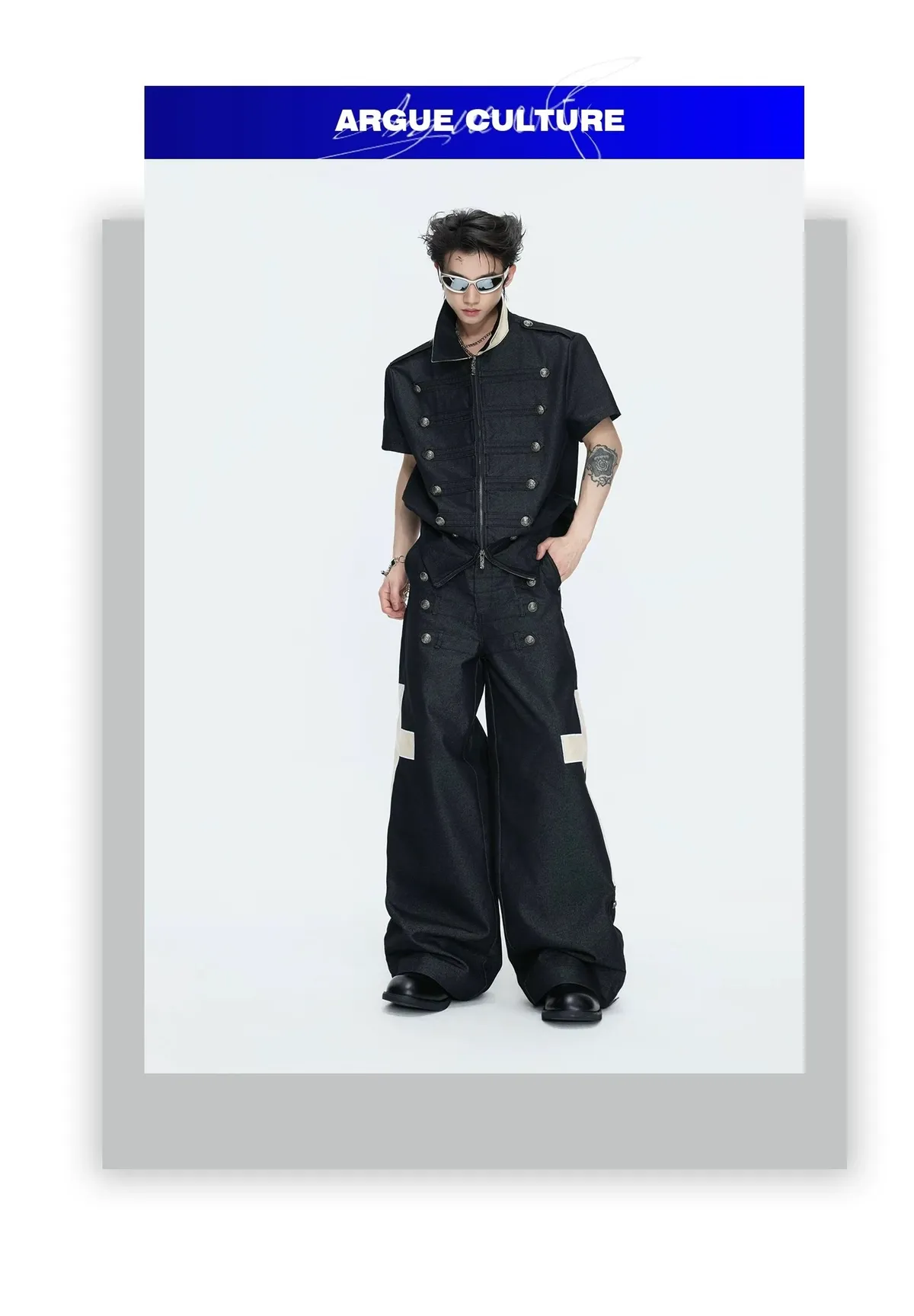 ARGUE 拿破崙排扣 皮革十字架 牛仔襯衫 牛仔褲 套裝(黑色)