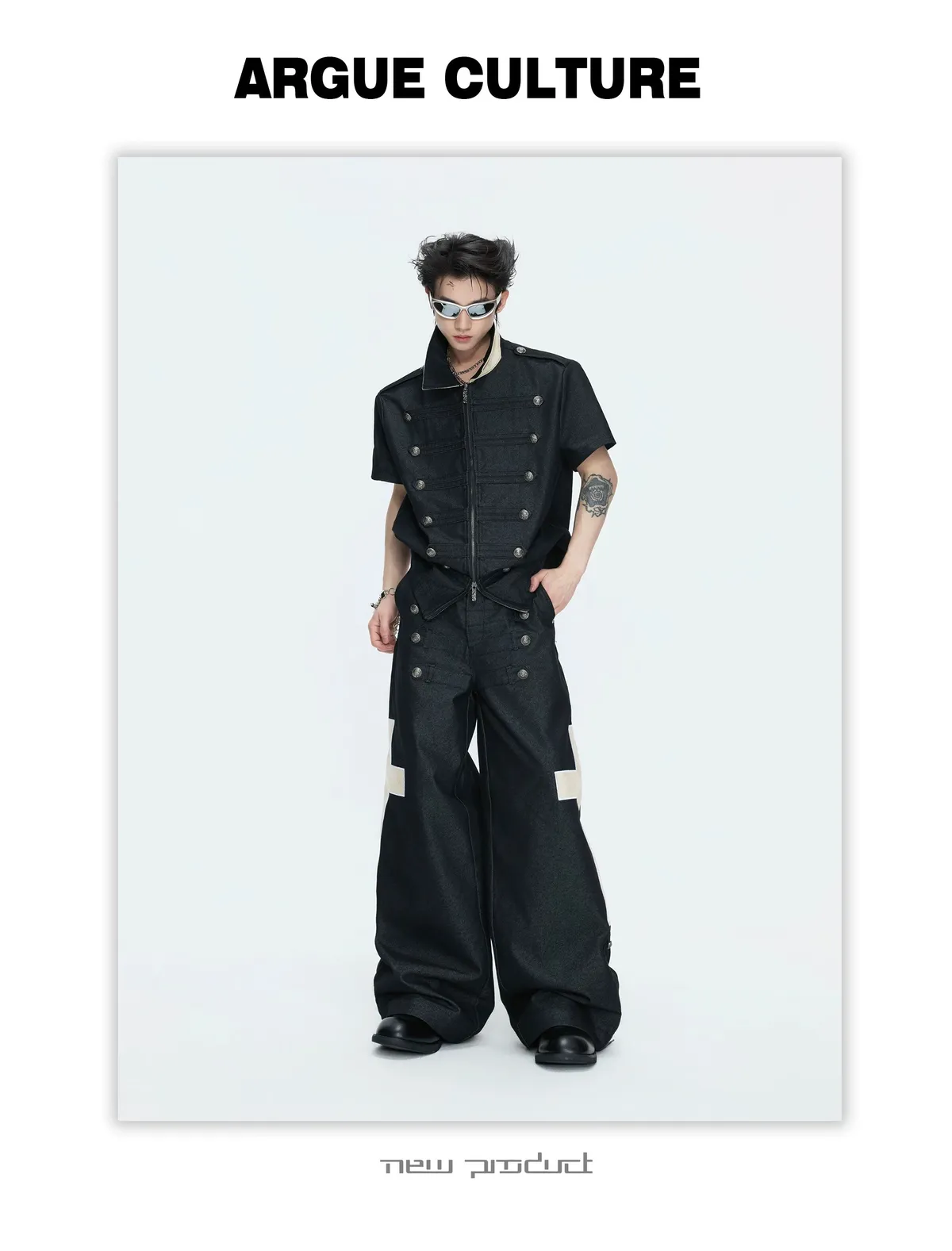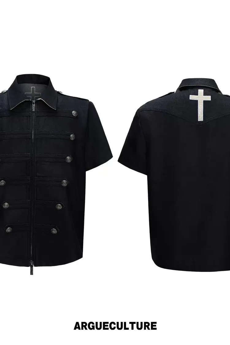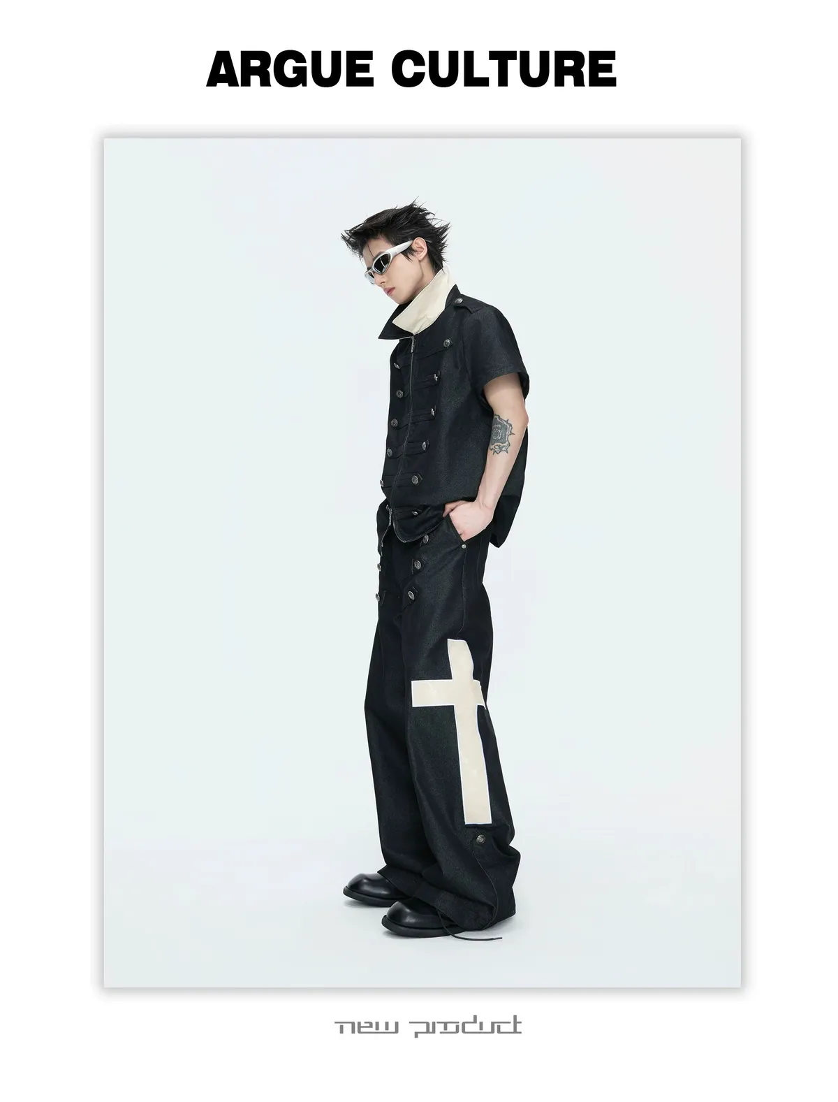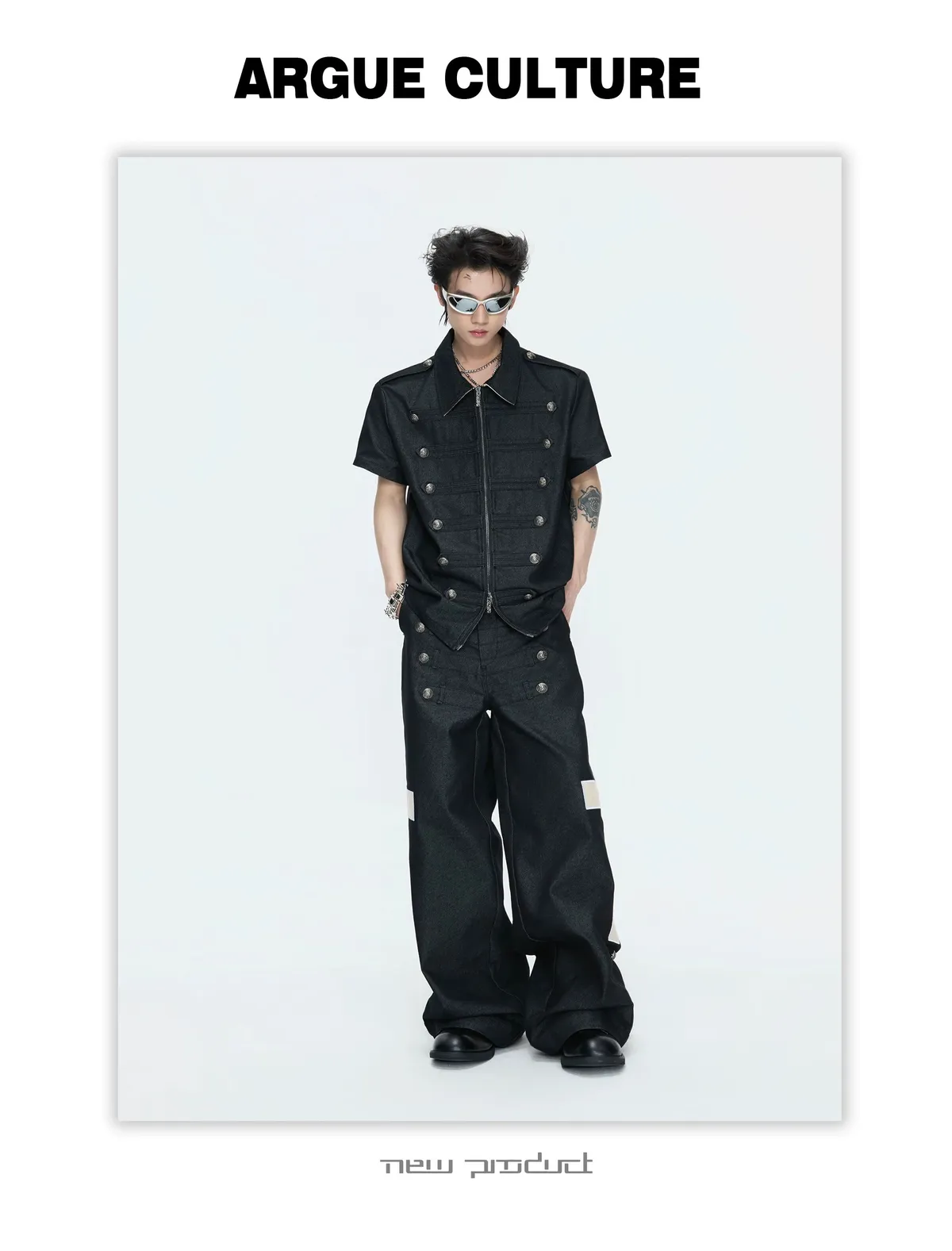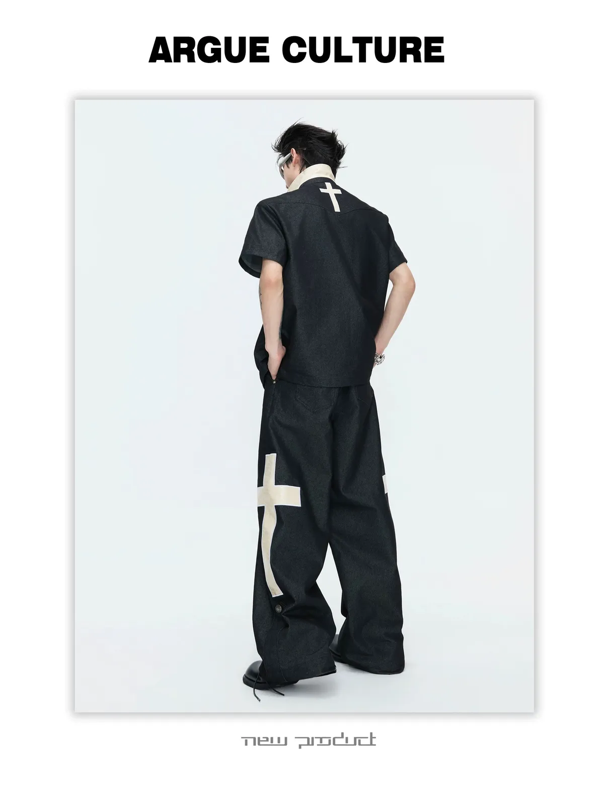 ARGUE 拿破崙排扣 皮革十字架 牛仔襯衫 牛仔褲 套裝(黑色)