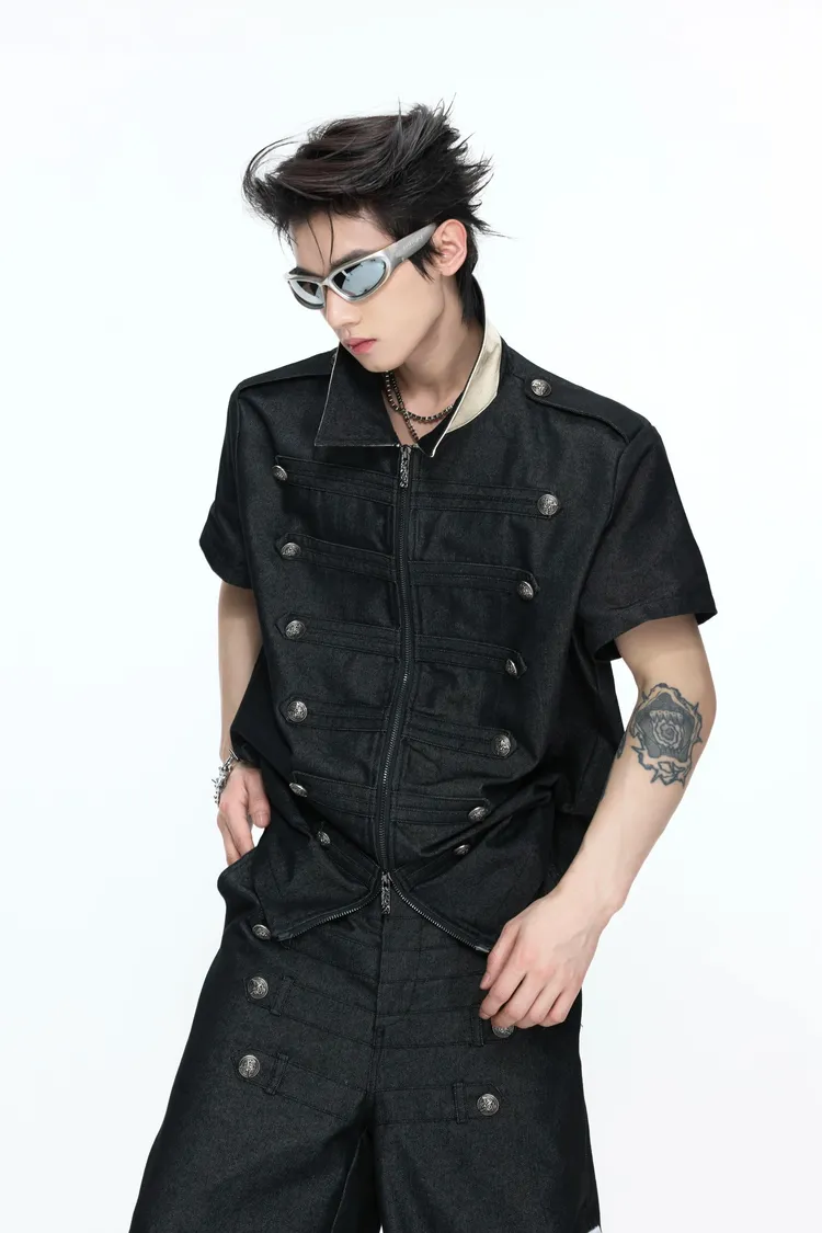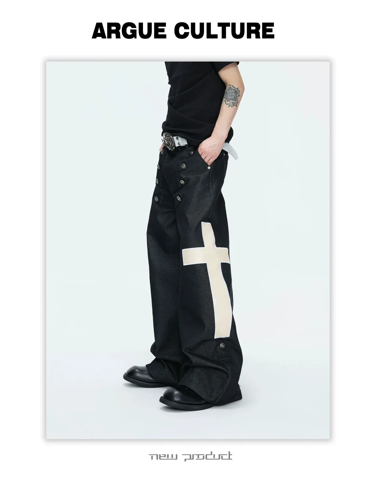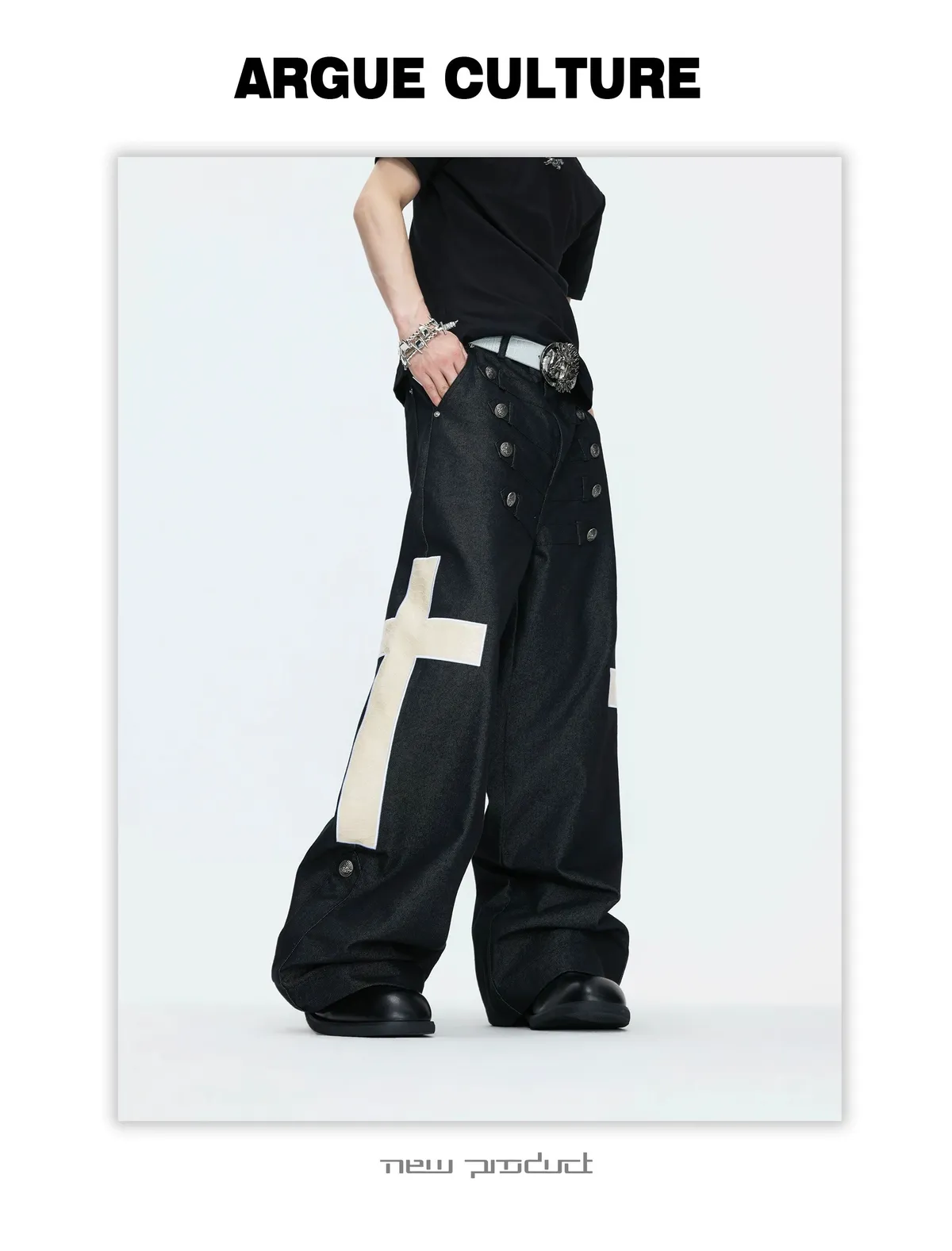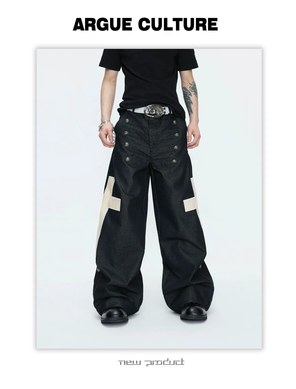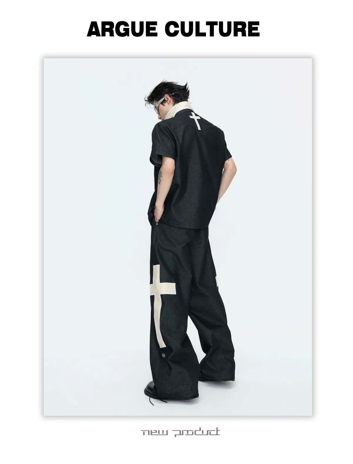 ARGUE 拿破崙排扣 皮革十字架 牛仔襯衫 牛仔褲 套裝(黑色)