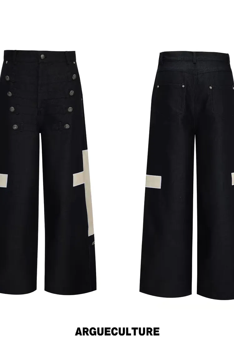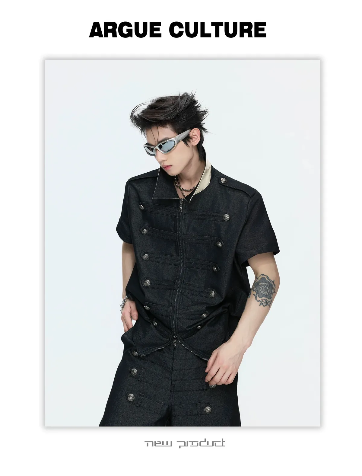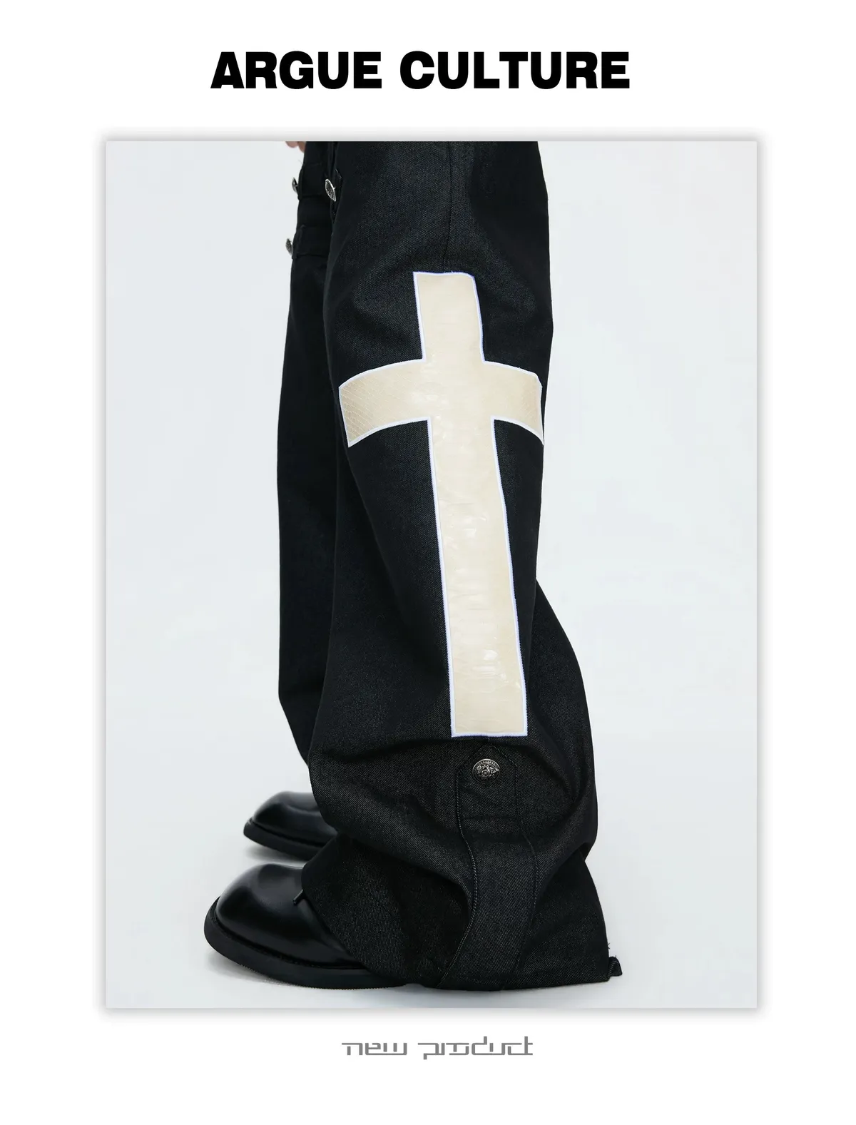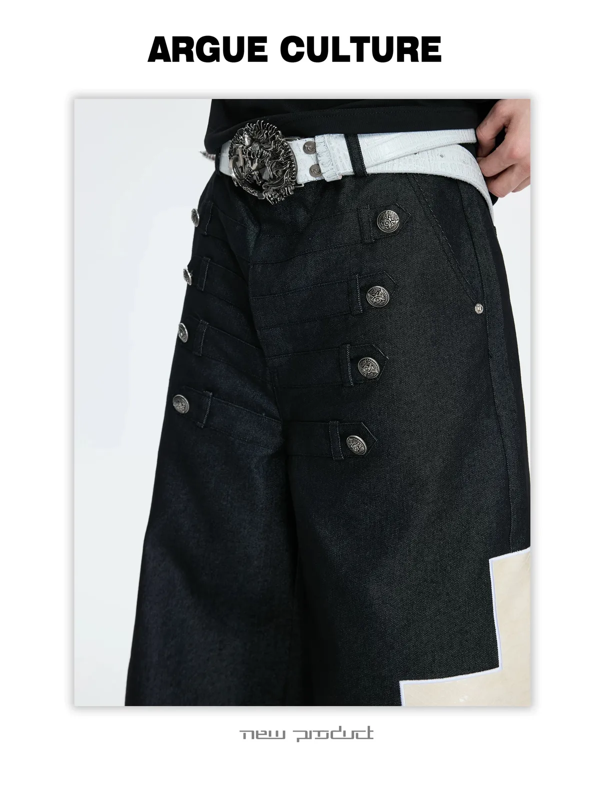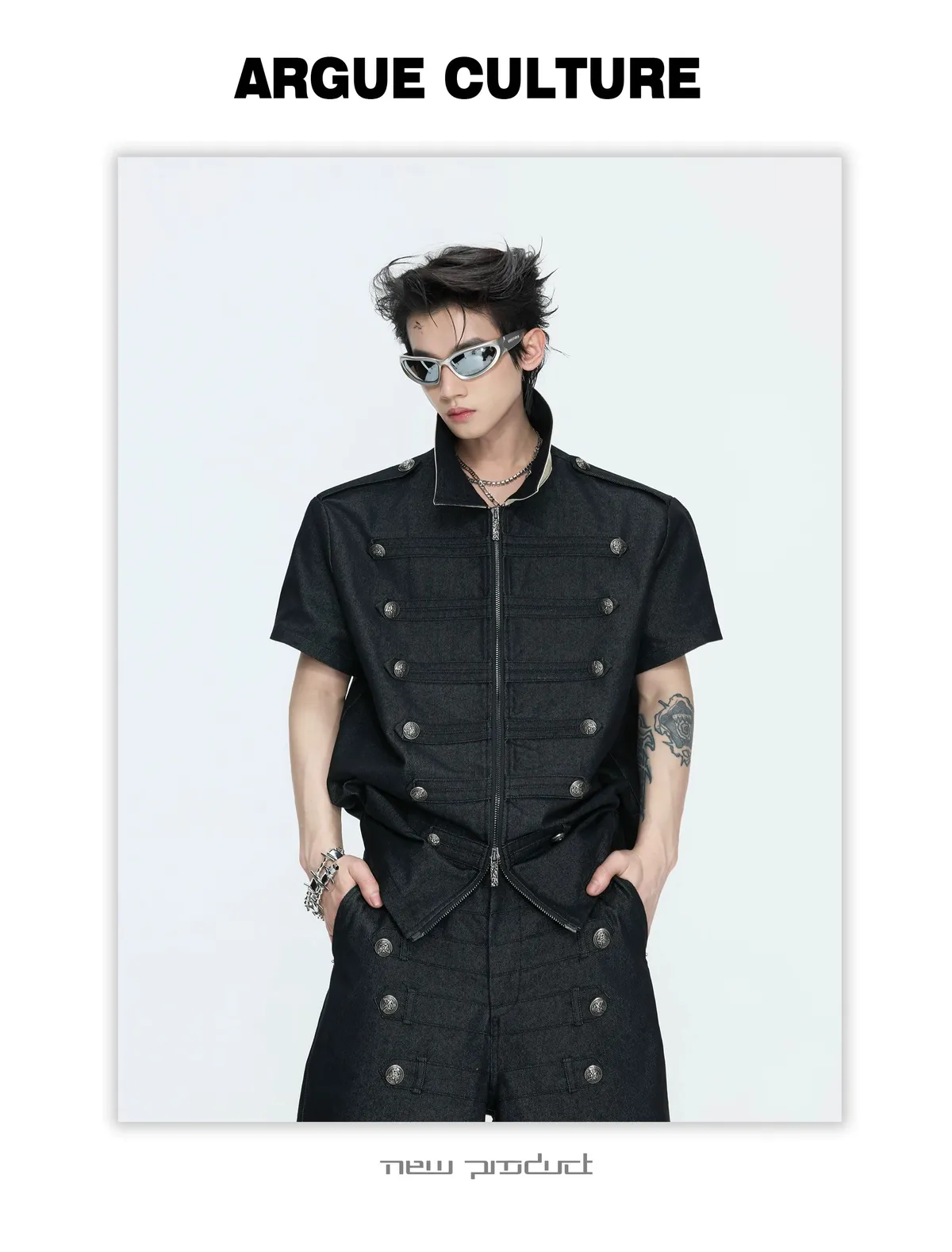 ARGUE 拿破崙排扣 皮革十字架 牛仔襯衫 牛仔褲 套裝(黑色)