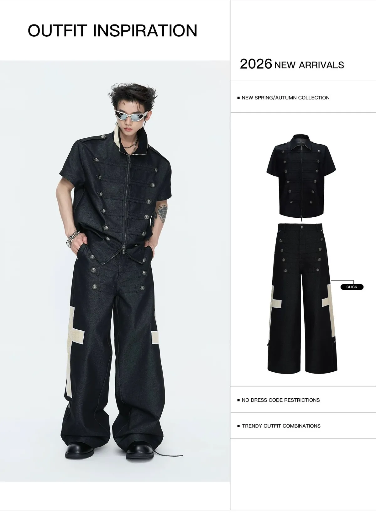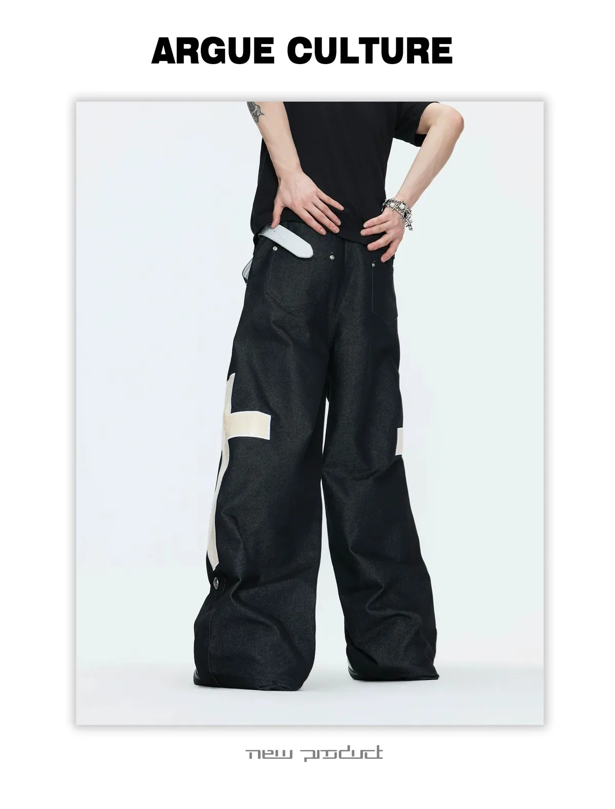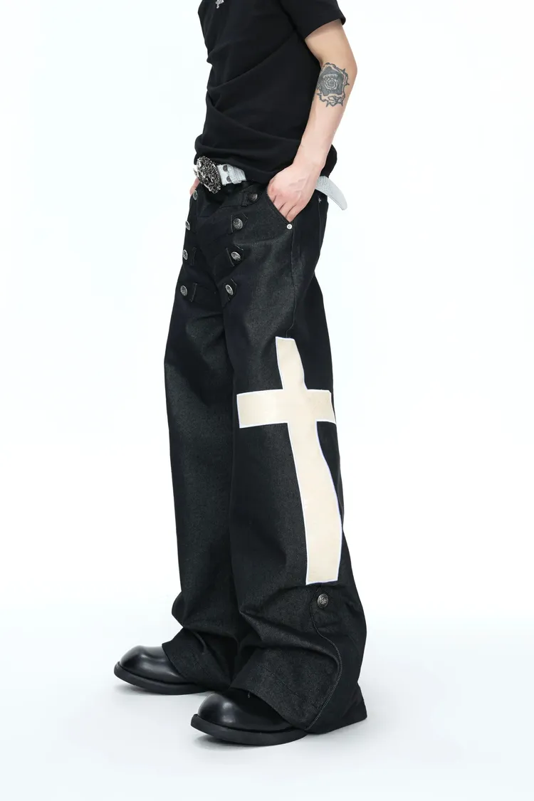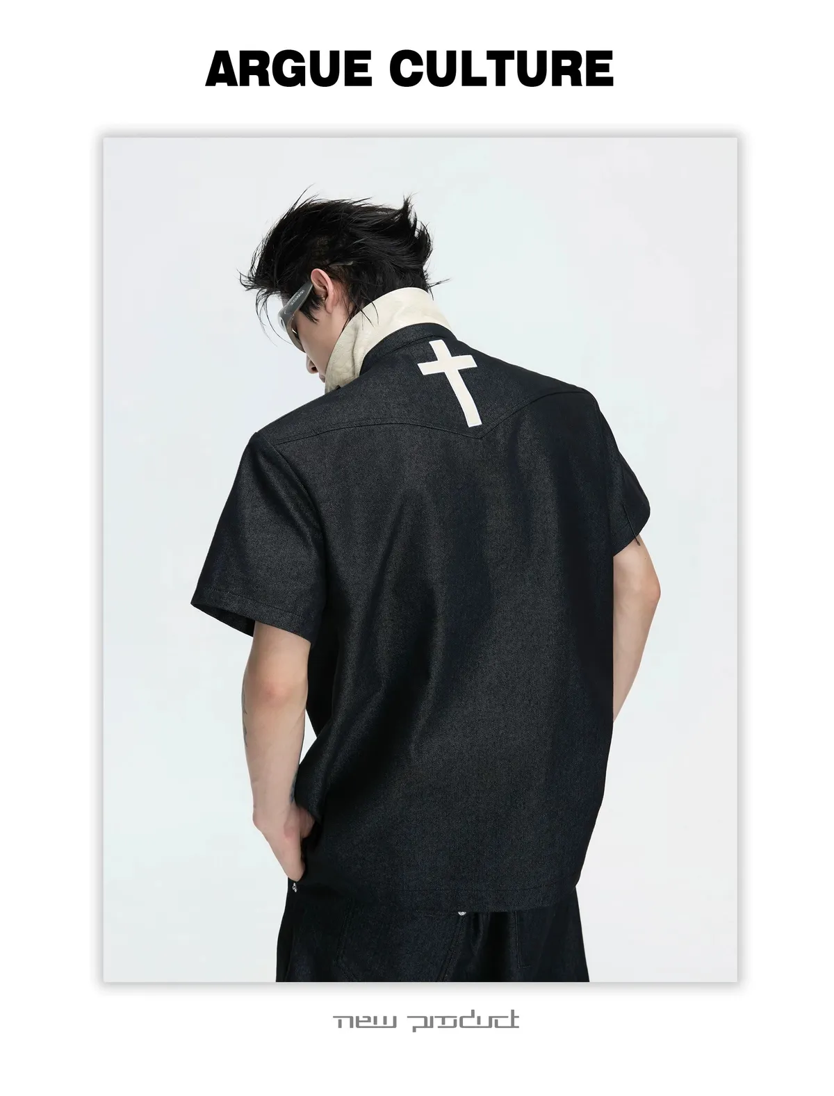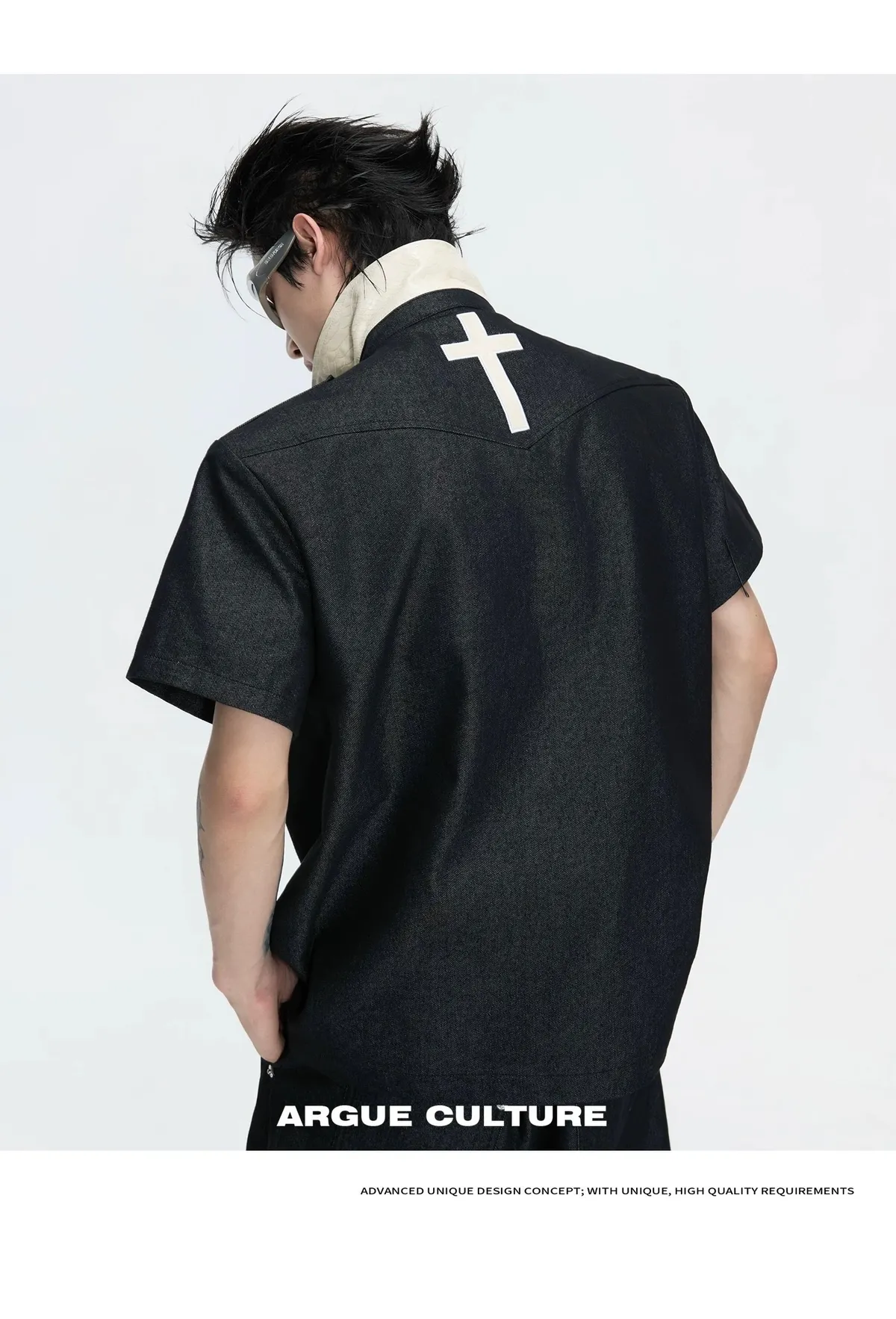 ARGUE 拿破崙排扣 皮革十字架 牛仔襯衫 牛仔褲 套裝(黑色)