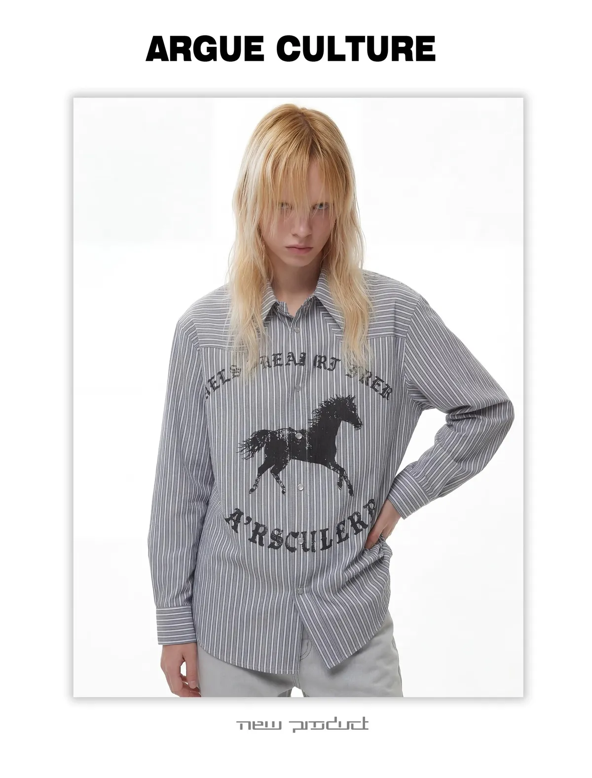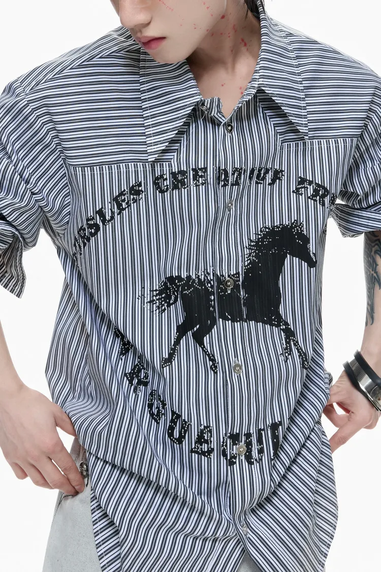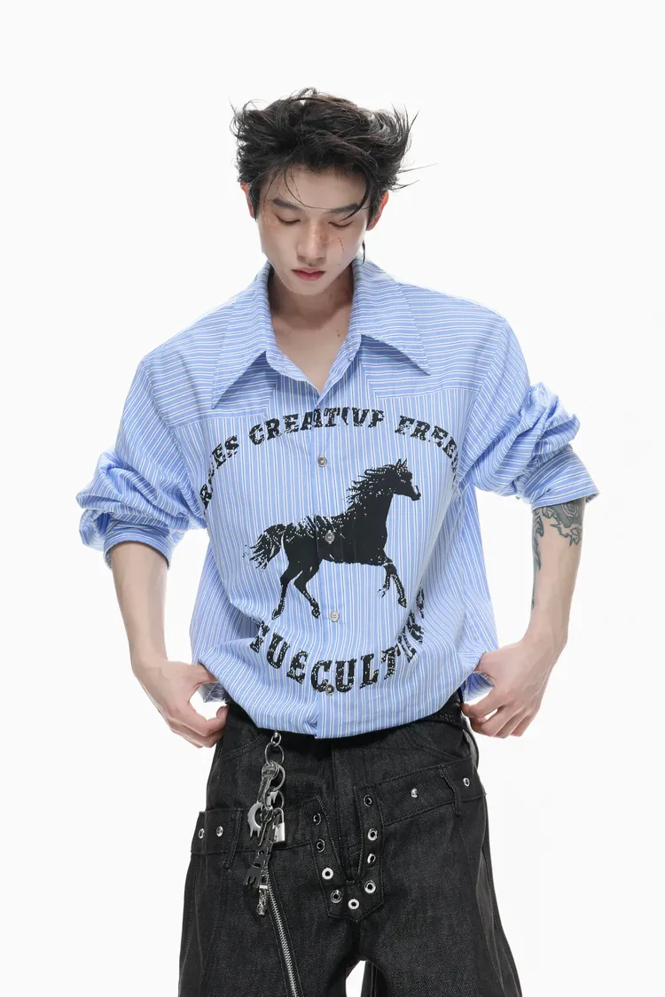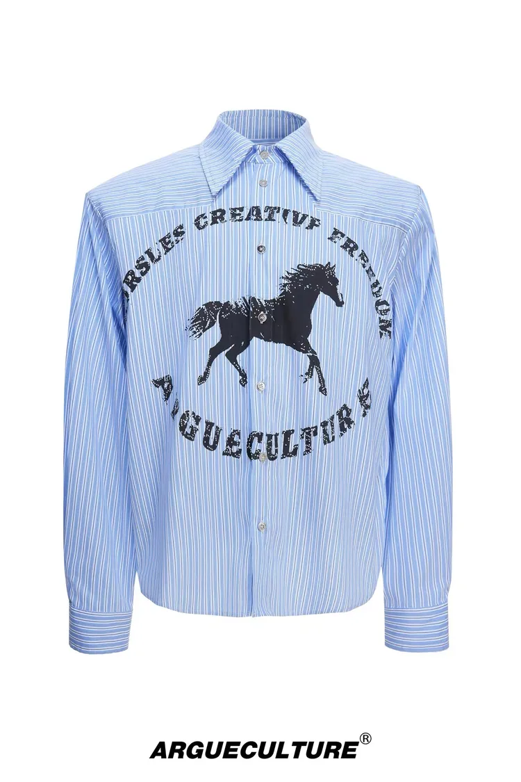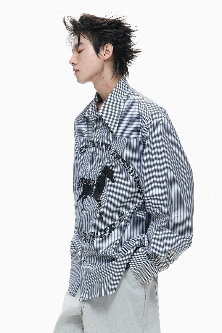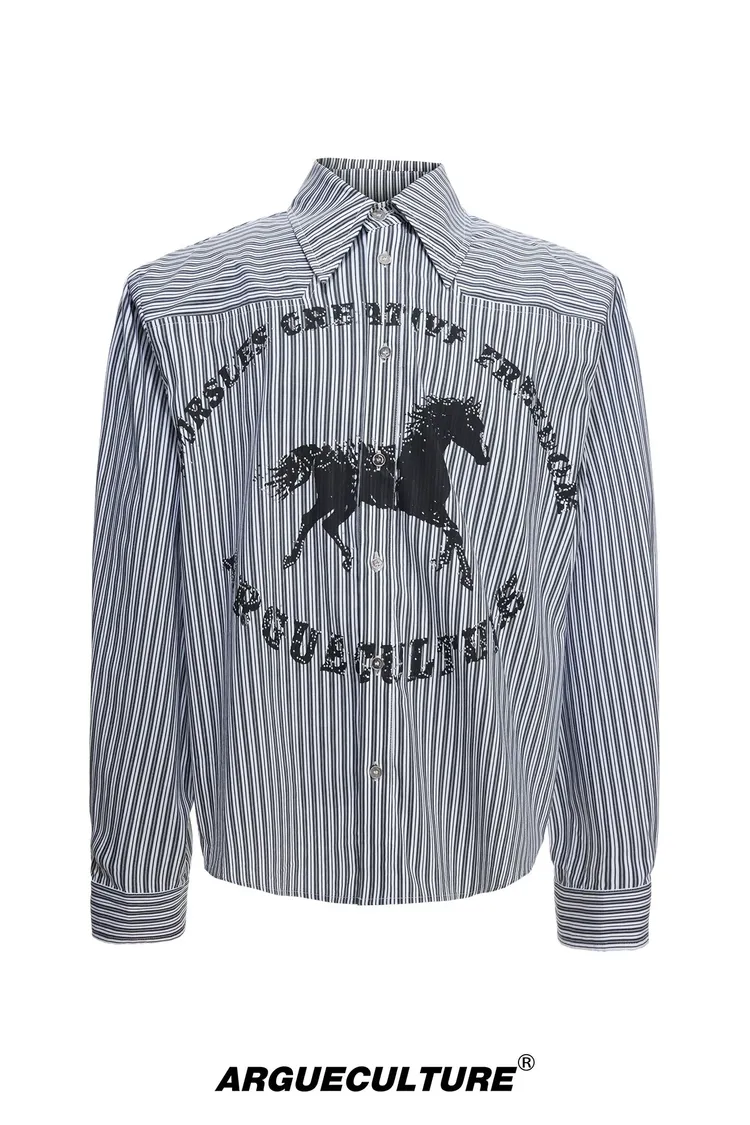 ARGUE 奔馬印花 燙鑽 條紋襯衫(灰/藍)