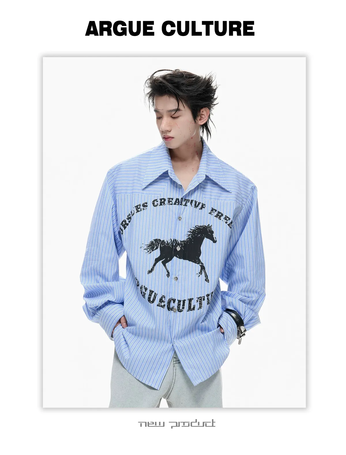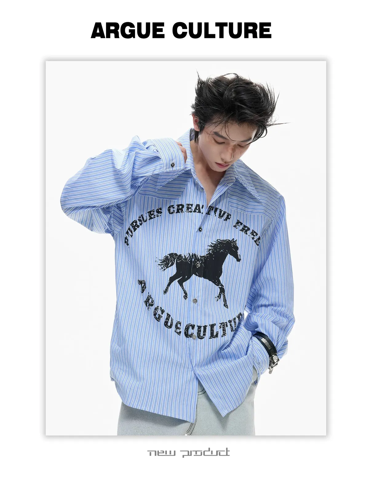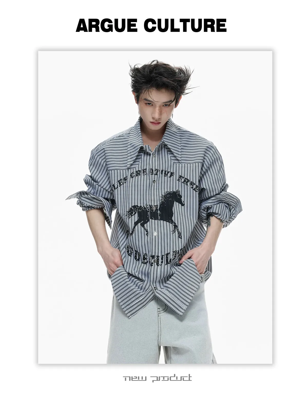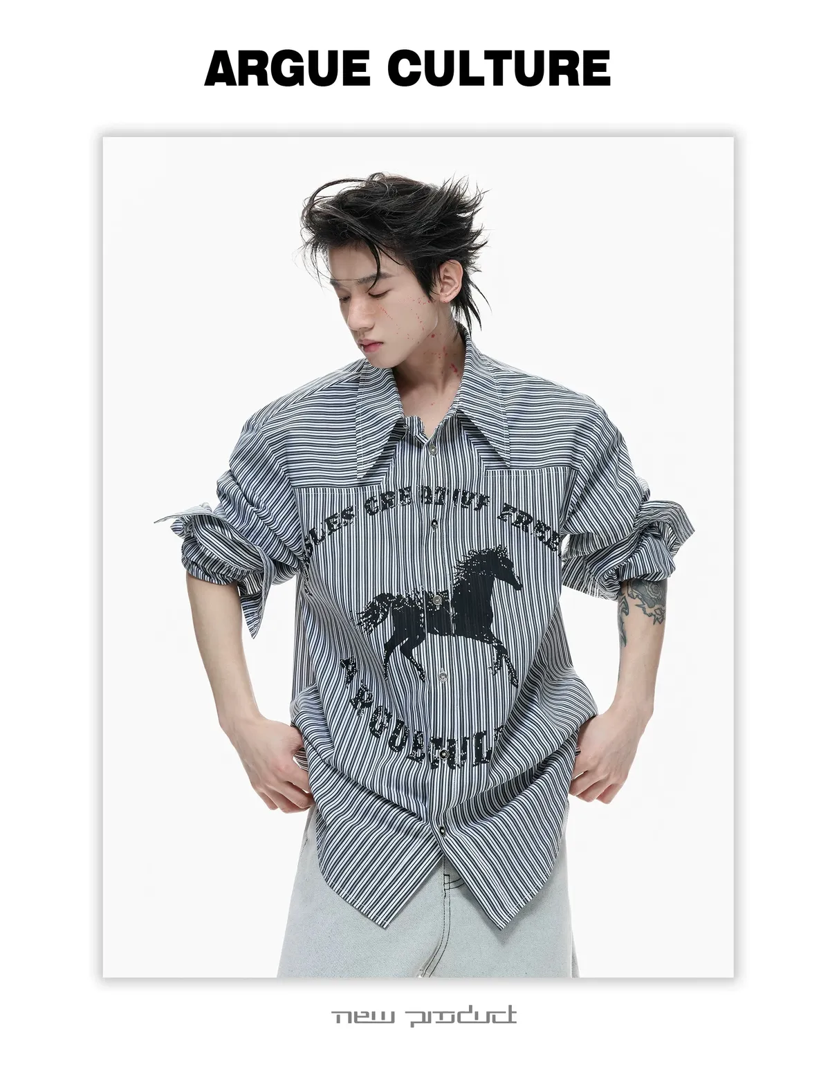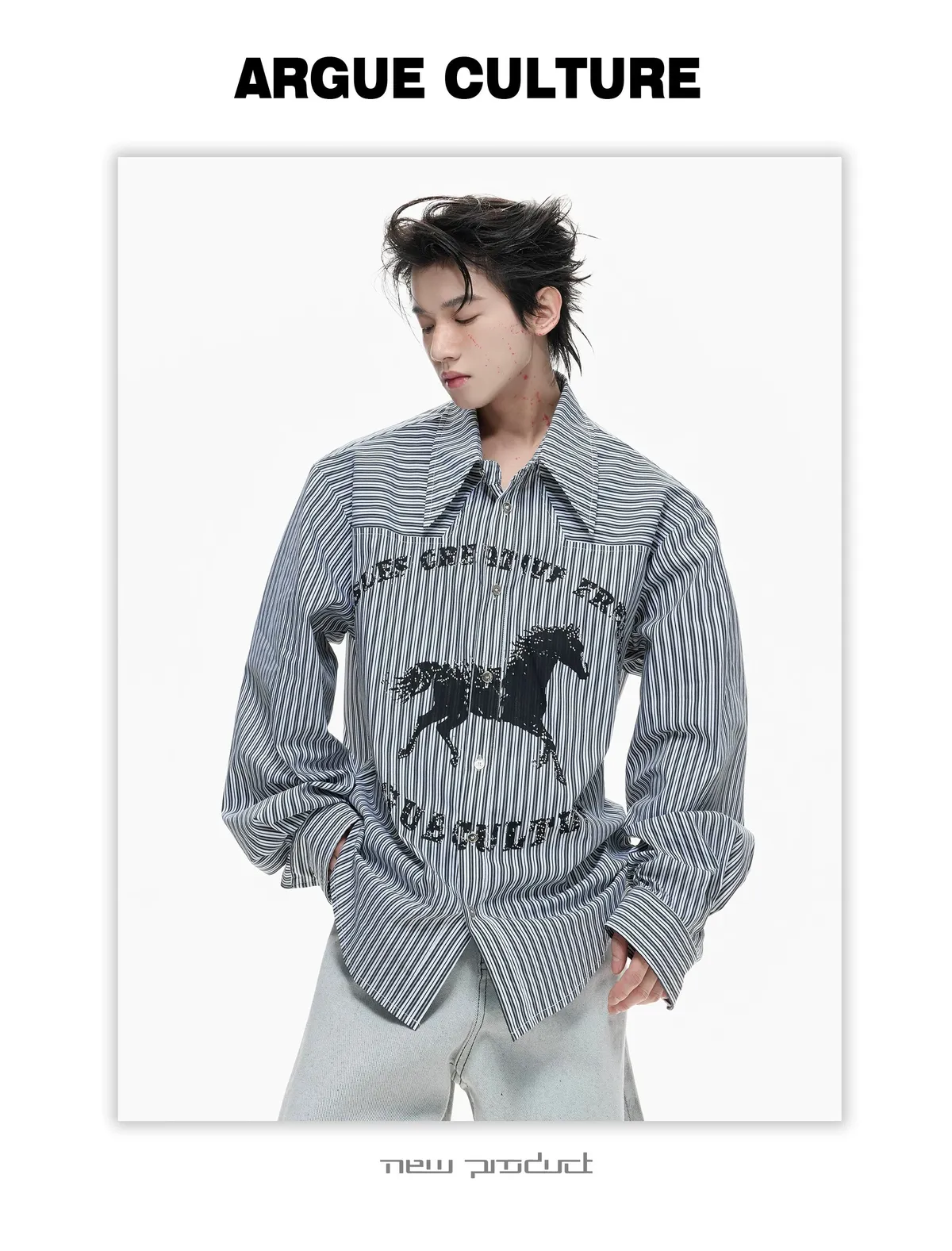 ARGUE 奔馬印花 燙鑽 條紋襯衫(灰/藍)