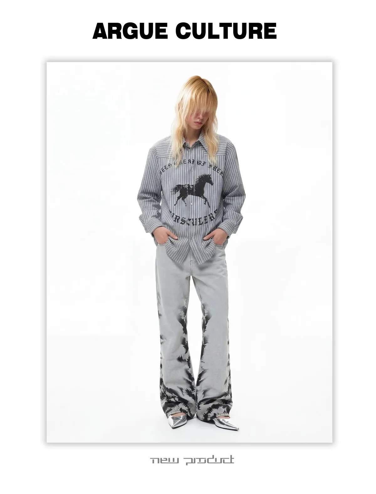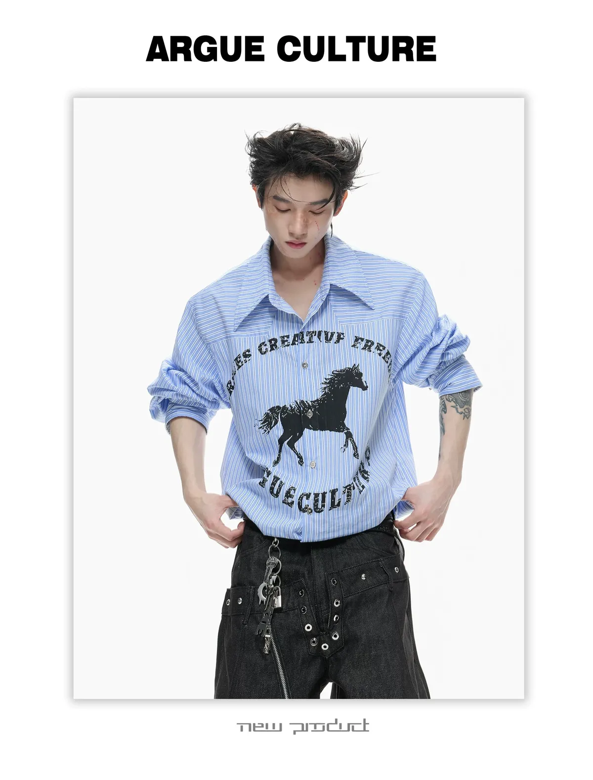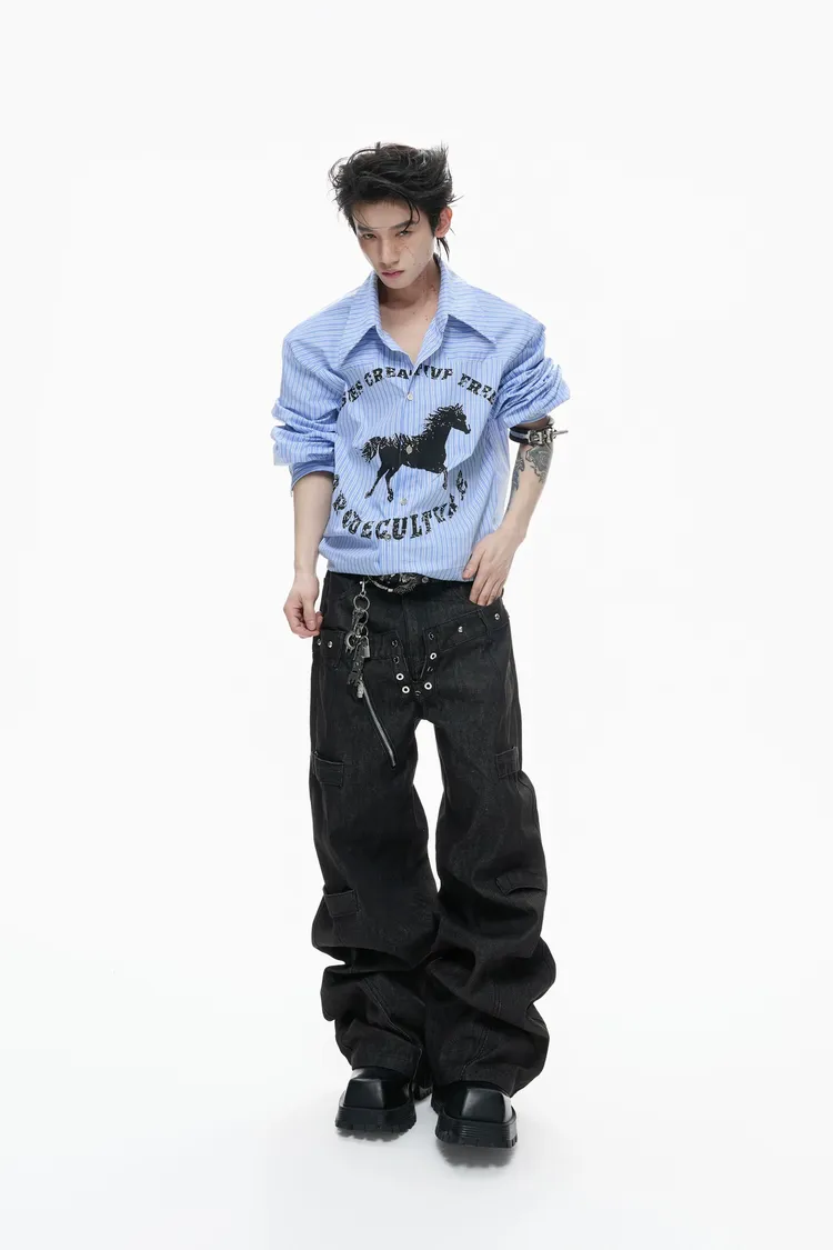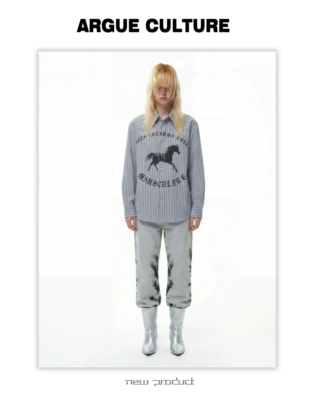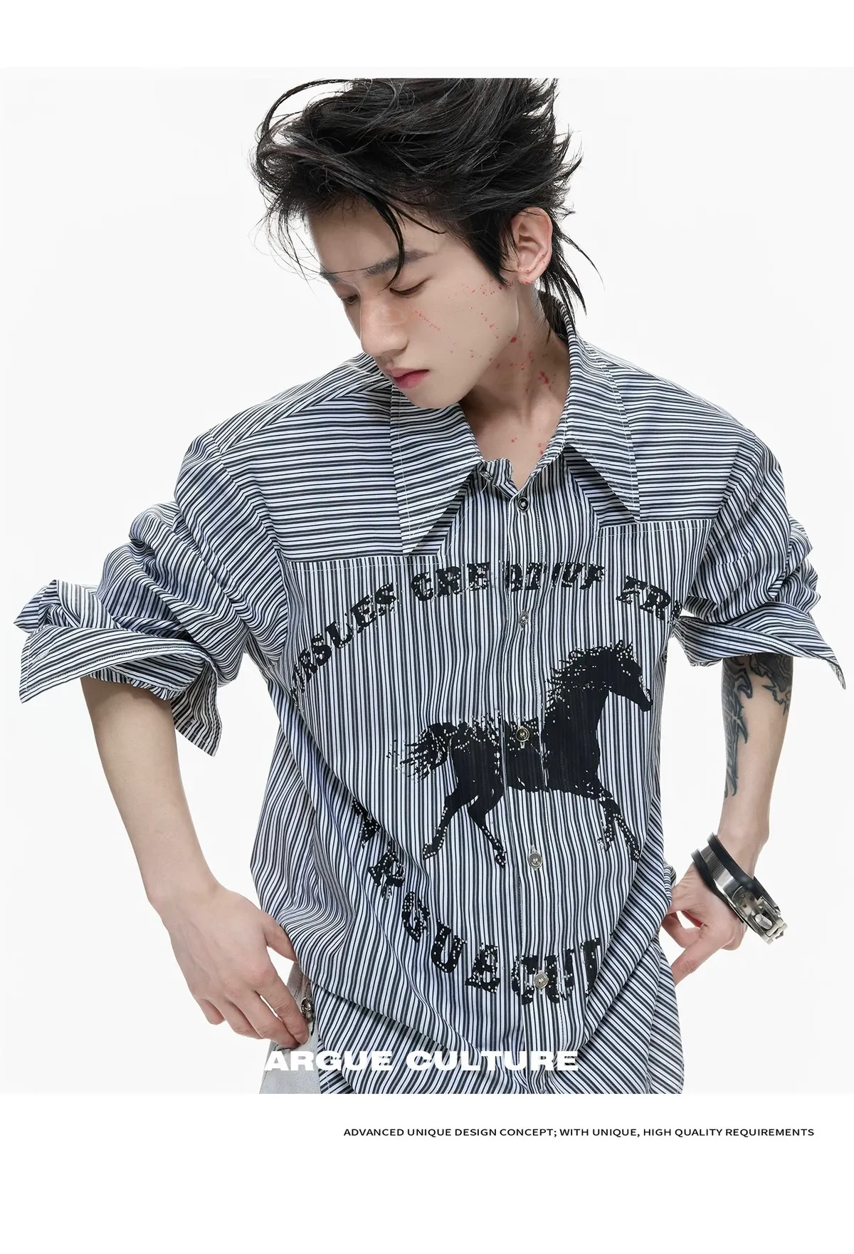 ARGUE 奔馬印花 燙鑽 條紋襯衫(灰/藍)
