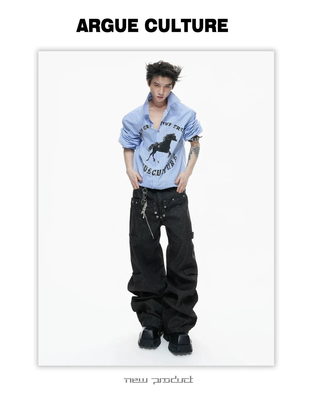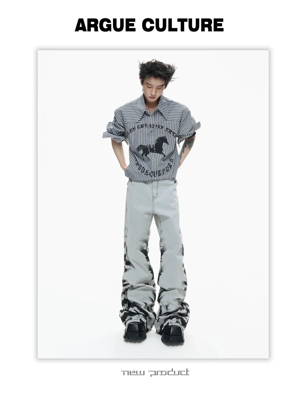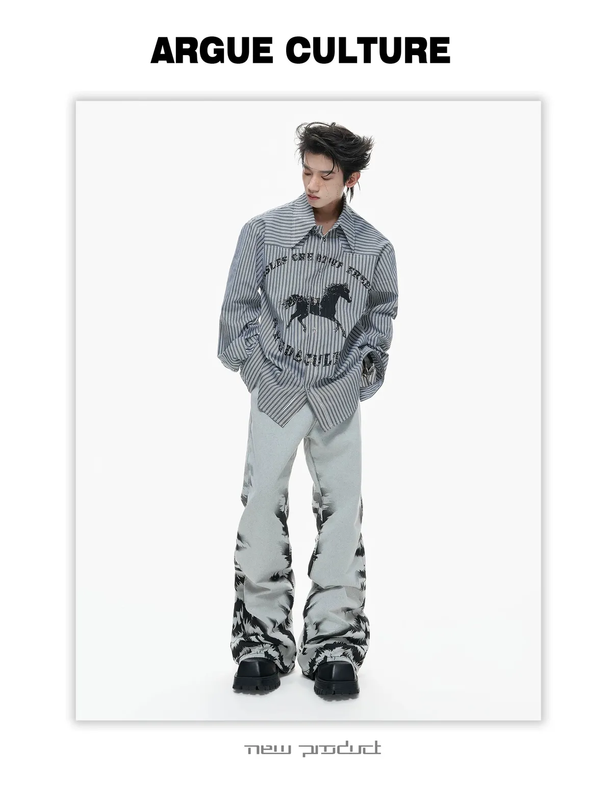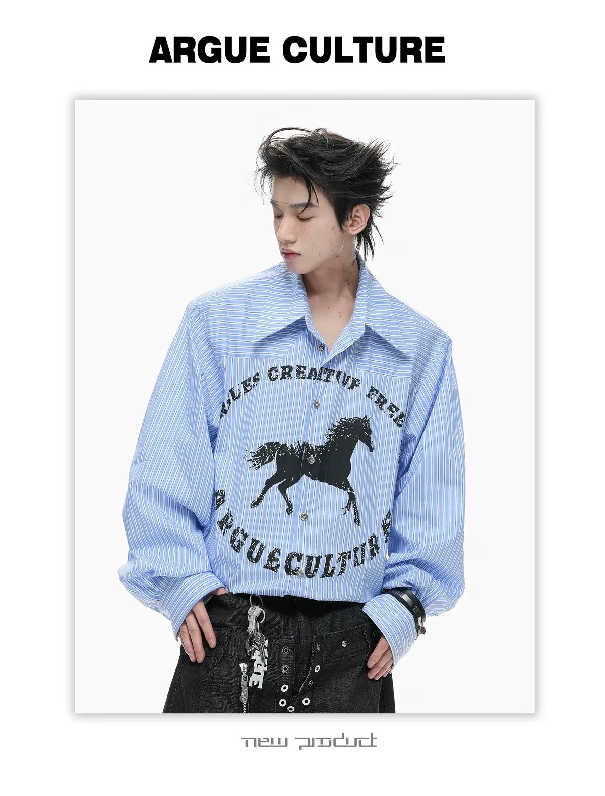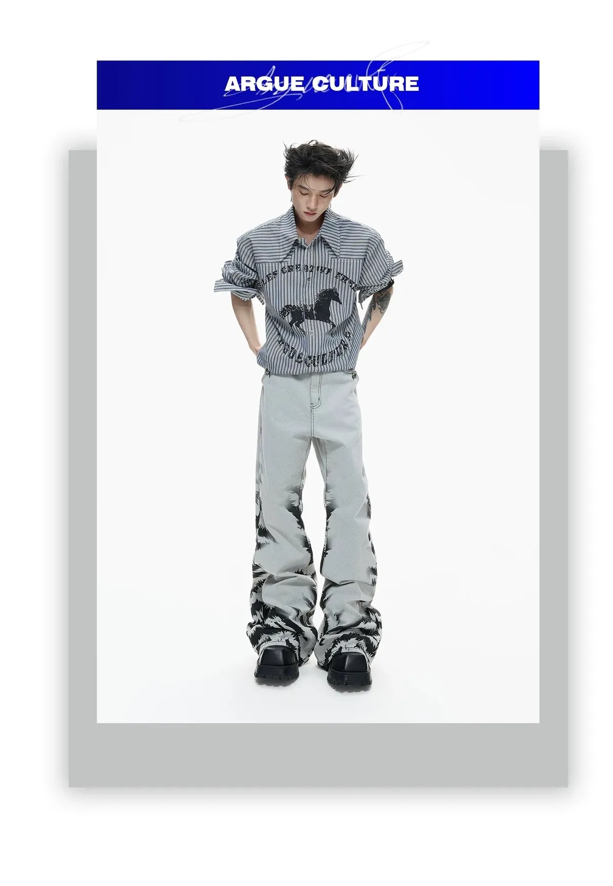 ARGUE 奔馬印花 燙鑽 條紋襯衫(灰/藍)