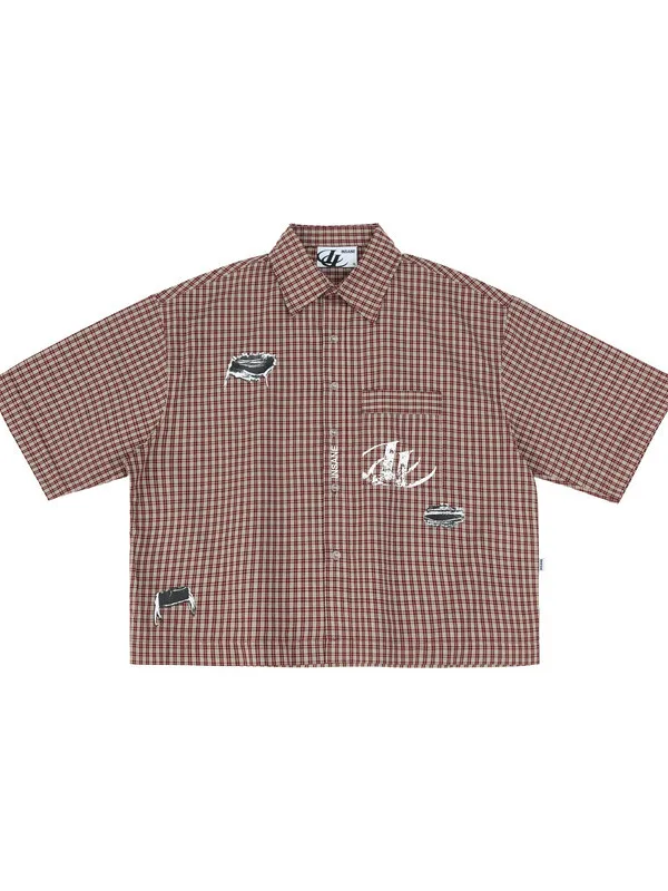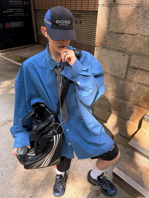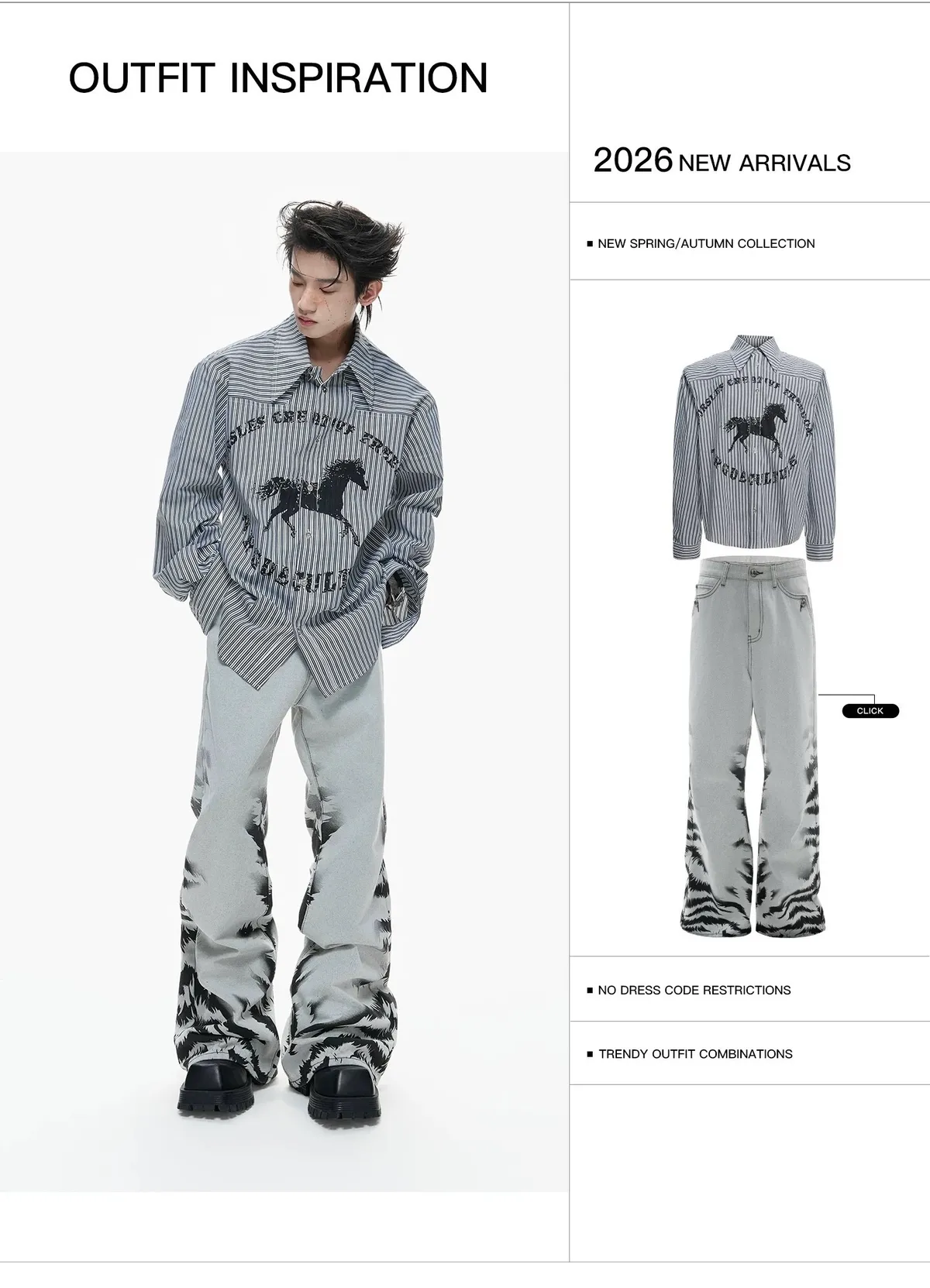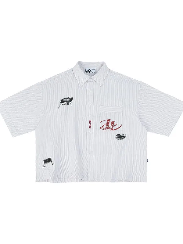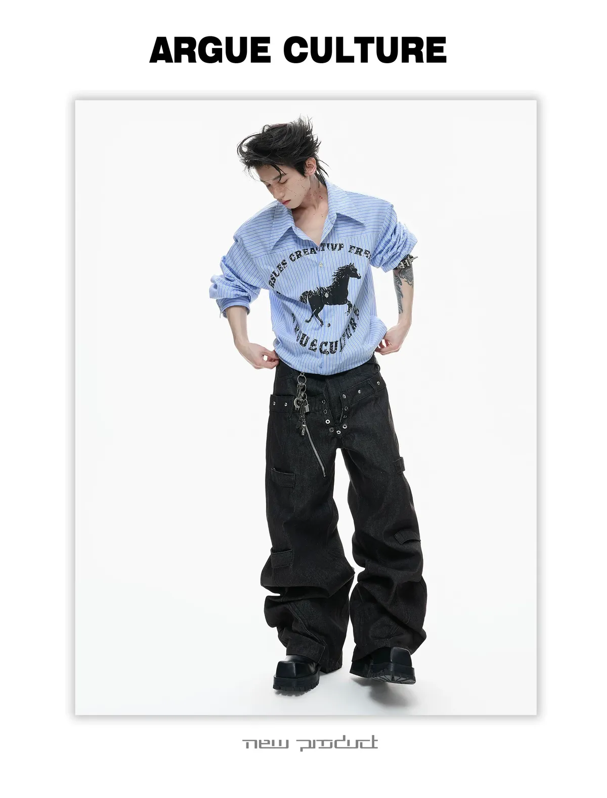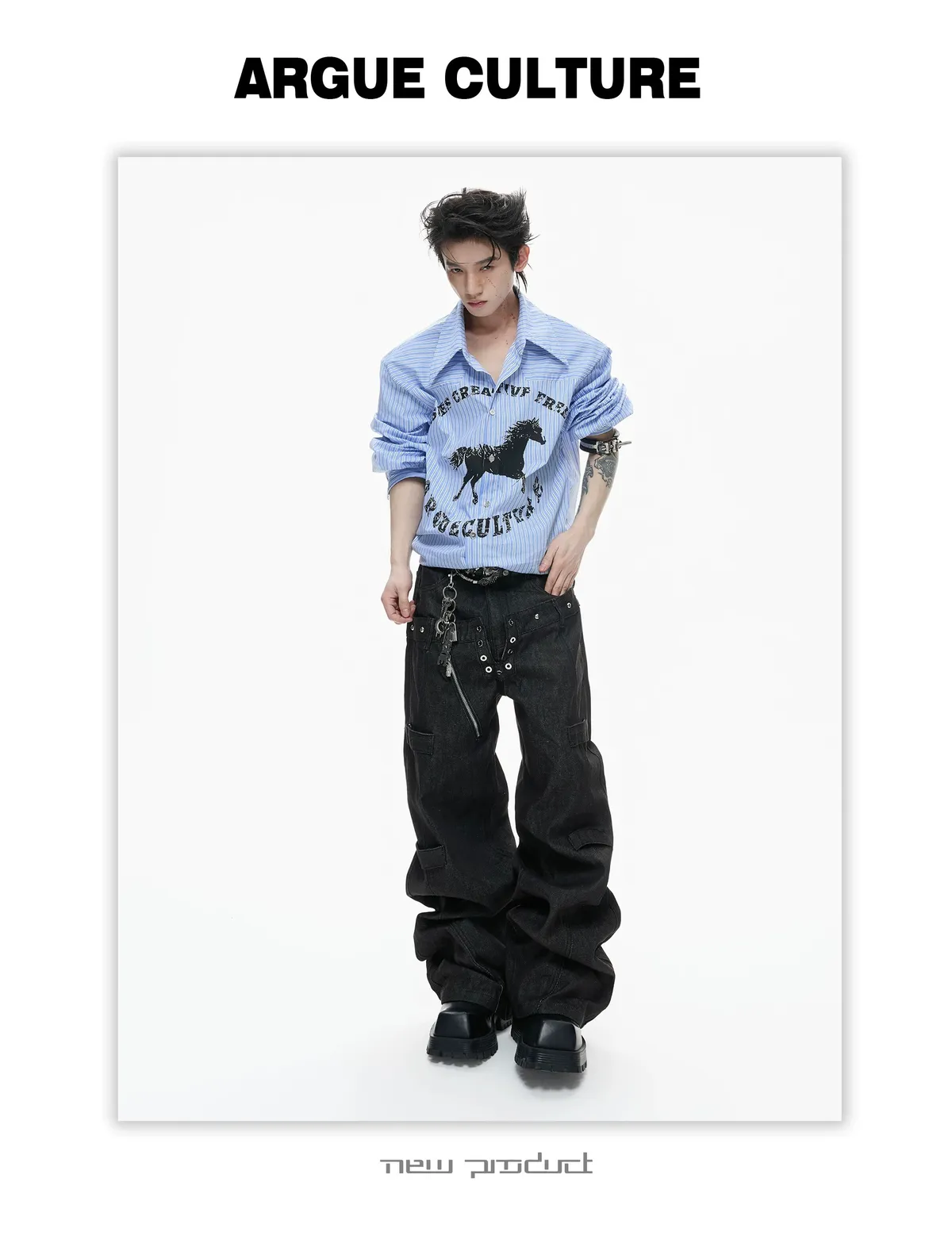 ARGUE 奔馬印花 燙鑽 條紋襯衫(灰/藍)